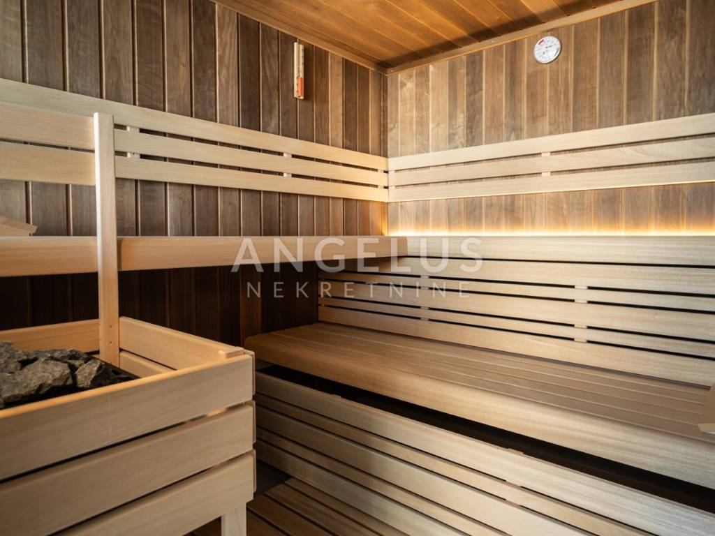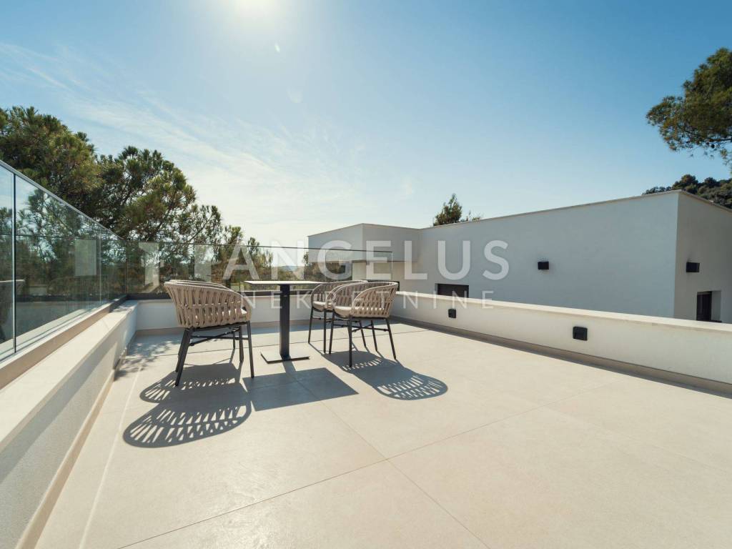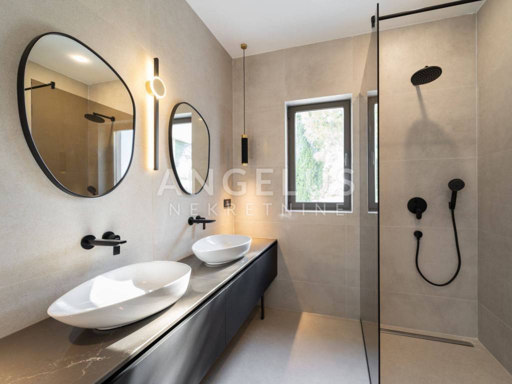 The main house extends over three floors, which are connected by internal stairs and an elevator, with a total living space of 460 m2. It consists of an open concept kitchen, dining room and spacious living room, four bedrooms and six bathrooms. The living room with dining room has access to a beautiful terrace and garden with summer kitchen, outdoor dining room and stone grill. The exterior of the villa is completed with a large modern Infinity pool, 100m2 with a sun deck. On the ground floor of the villa there is an infrared sauna, a hydromassage tub and a Finnish sauna.