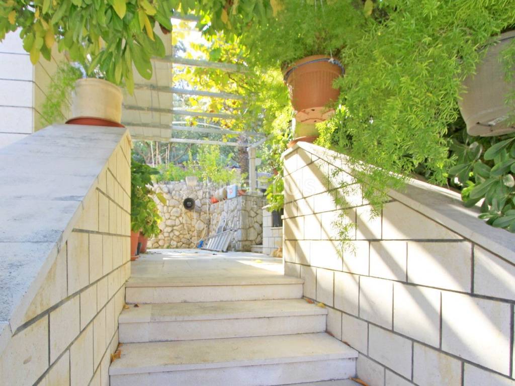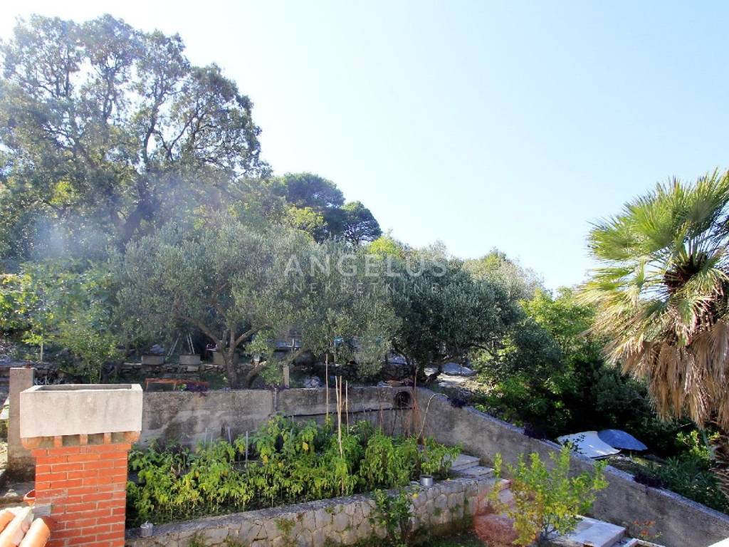 The ground floor of the house, which can be reached from both sides, has a large living room, kitchen with dining area, three bedrooms, bathroom, toilet, and hallway. The total living area of the ground floor is 140 m2 which leads to a large spacious front terrace of 47 m2, and a covered terrace behind the house of 50 m2 which leads to another separate house of 26 m2 in which there is one room, toilet and summer kitchen which is very practical for a quality stay outdoors during warm days. In this part, there is an outdoor fireplace with a stone sink, and in the extension is a small garden where herbs and seasonal vegetables grow.