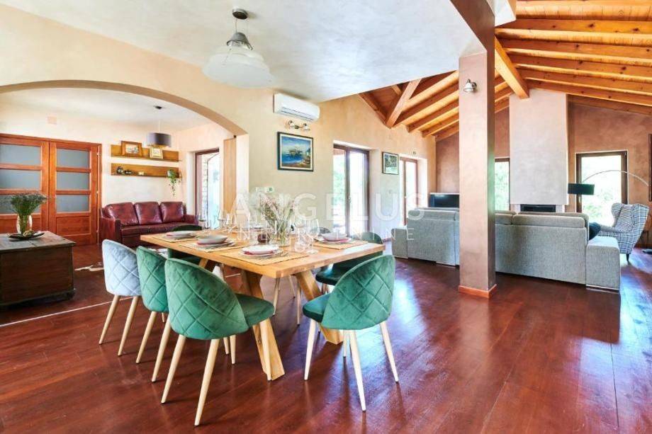 The villa consists of a basement, ground floor and first floor. The ground floor of the house has one bedroom, a toilet, a living area with access to the terrace and pool, a dining room and a kitchen. Beautifully decorated wooden stairs lead to the first floor where there are 3 bedrooms and 2 bathrooms. The bedroom has access to the terrace from which there is an open view of the property and greenery. Furniture made of natural materials, such as wood and stone, adds warmth to the space, and the spacious rooms radiate a homely atmosphere. The fireplace in the living room creates pleasant warmth for the winter months.