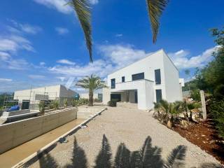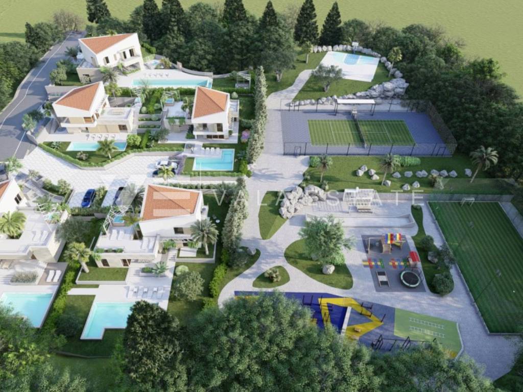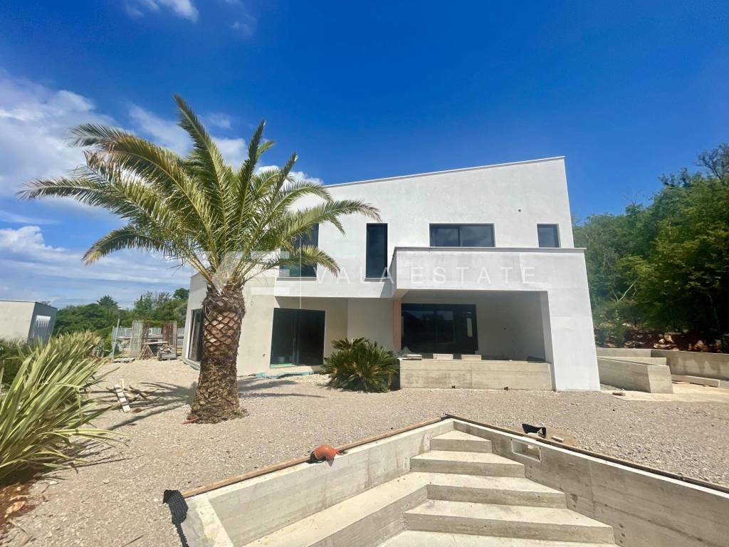 Real estate island of Krk, Malinska area - for sale is a new modern detached villa located in a resort of a total of four luxury villas connected by design and equipment, within which there will be available courts for basketball, football, tennis and a children's playground. It is located on a plot of 989 m2 and includes a living area of 227.83 m2 spread over three floors connected by an internal staircase. In the basement there is a gym with a wellness area and a toilet. The ground floor includes an entrance area, bathroom, bedroom, kitchen with dining area and a spacious living room with access to a covered terrace with a summer kitchen and an outdoor toilet. On the first floor there are three more bedrooms, each with its own bathroom and access to a covered terrace with a sea view. On the beautifully landscaped and fenced garden that provides privacy, there is a 60 m2 swimming pool, a sunbathing area and several parking spaces. Top quality construction and equipment, top floor coverings and sanitary ware, luxury furniture, air conditioning and underfloor heating with a heat pump are just some of the features of this excellent property, which is ideal for all lovers of a luxurious and peaceful holiday. Beautiful and peaceful location, 1000 m from the sea and beaches and all local amenities. The property is currently under construction, and the planned completion is expected in mid-2026.