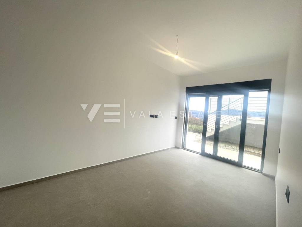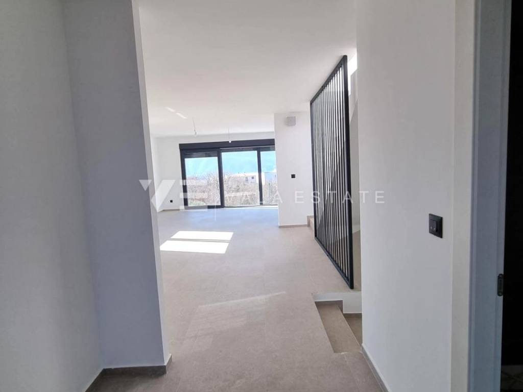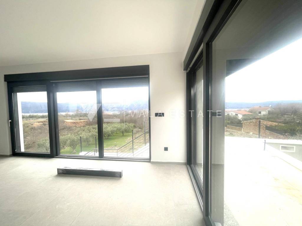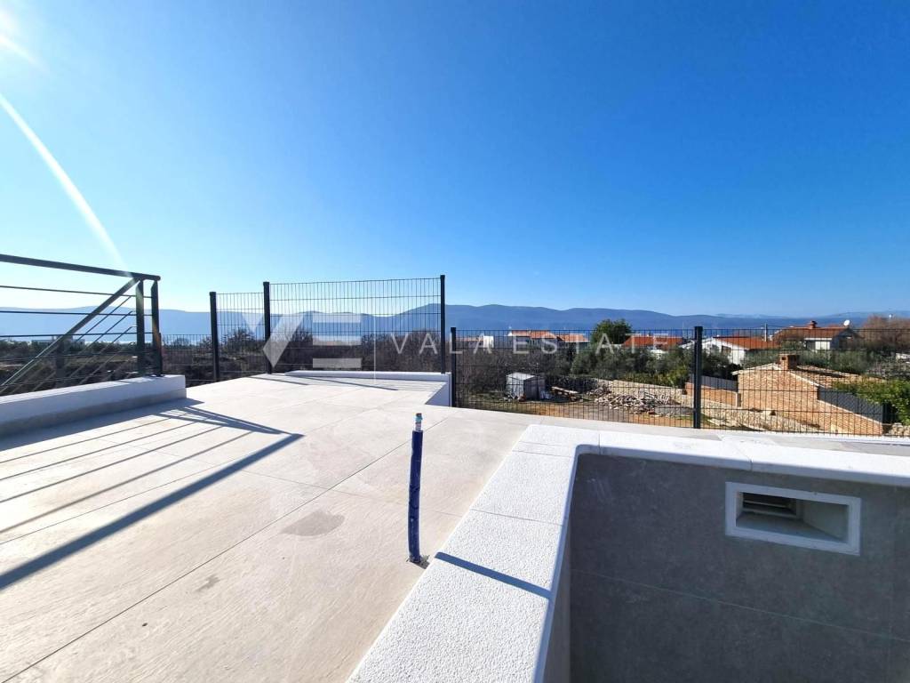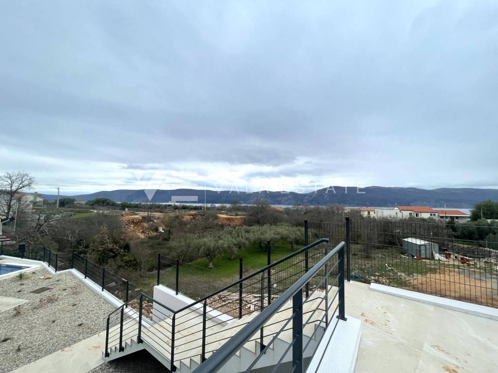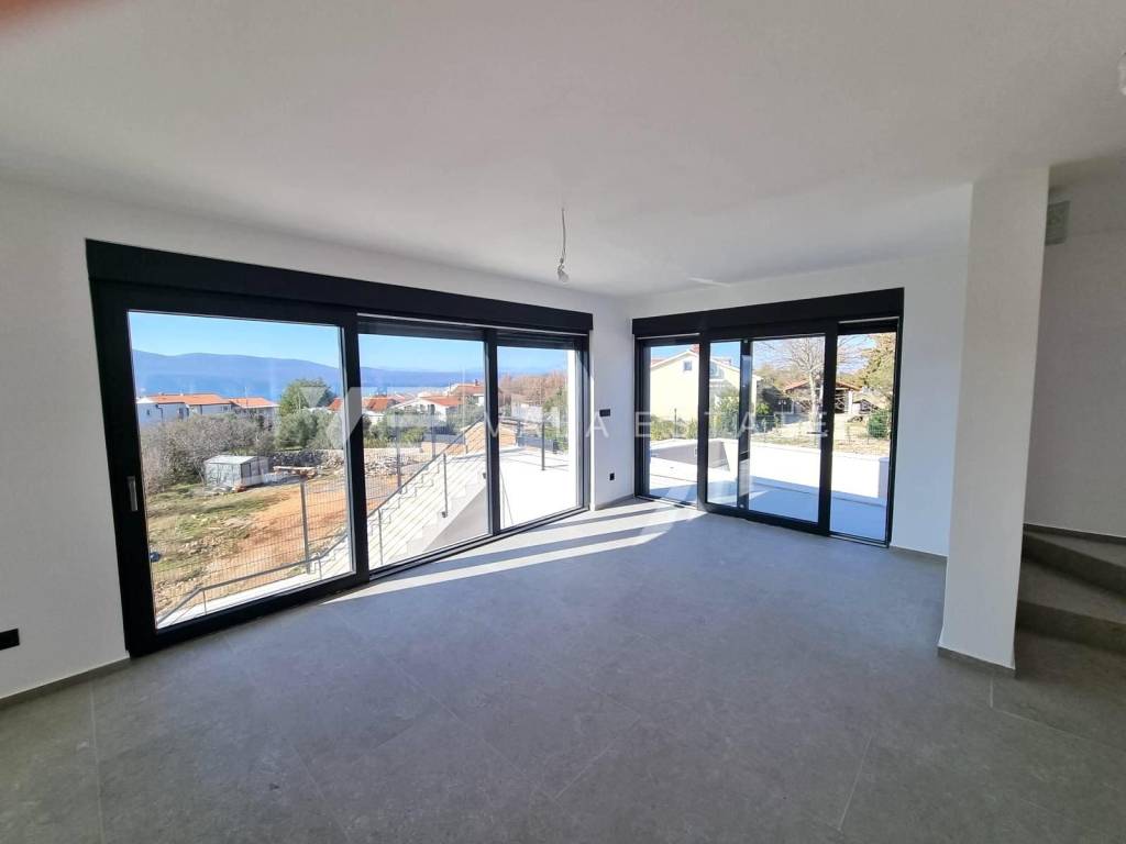Real estate on the island of Krk, the wider area of the town of Krk - for sale is a new modern semi-detached house in a quiet location with a beautiful sea view. The total living area of the house of 132 m2 is distributed over the ground floor and first floor. The ground floor has three bedrooms, one of which has its own bathroom and walk-in wardrobe, and another bathroom. On the first floor, which is reached by internal stairs, there is a living room with a kitchen and dining area and another bathroom. From the living room there is an exit to the landscaped private garden where there is a swimming pool and a sunbathing area. From the living room there is a staircase to the roof terrace of 35 m2, which offers a panoramic view of the sea and the surrounding nature. High-quality materials and equipment were used during construction, electric underfloor heating was installed in all areas and multi-split air conditioning with heating and cooling. There are also two parking spaces in the fenced courtyard of the house. The house is currently in the final phase of construction, and the complete completion of the works is expected by 06/2025. The distance to the sea is about 1000 m, and to the town center and excellent restaurants about 400 m.