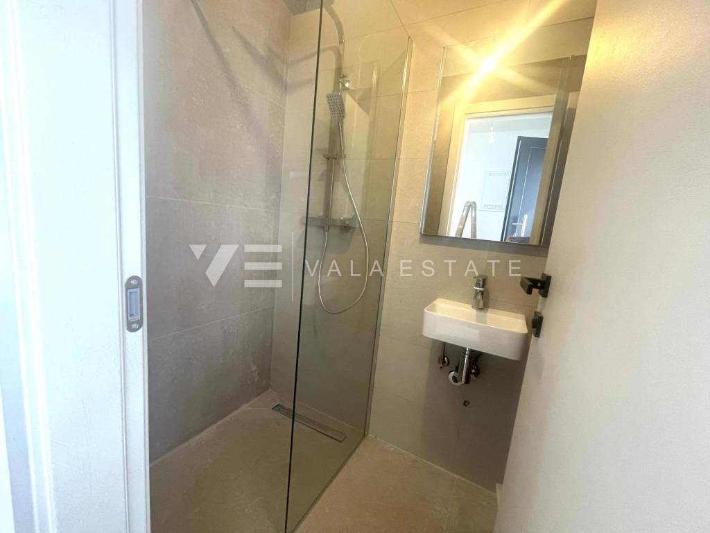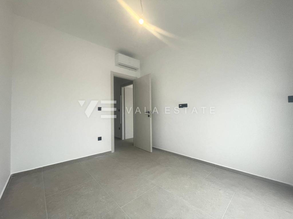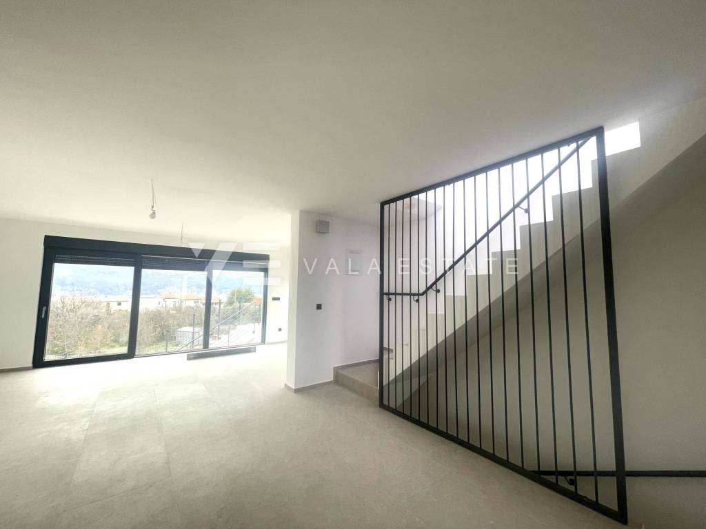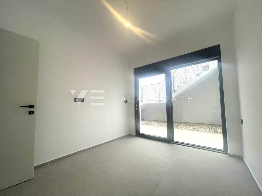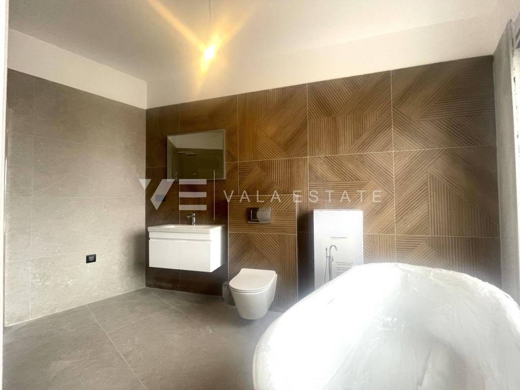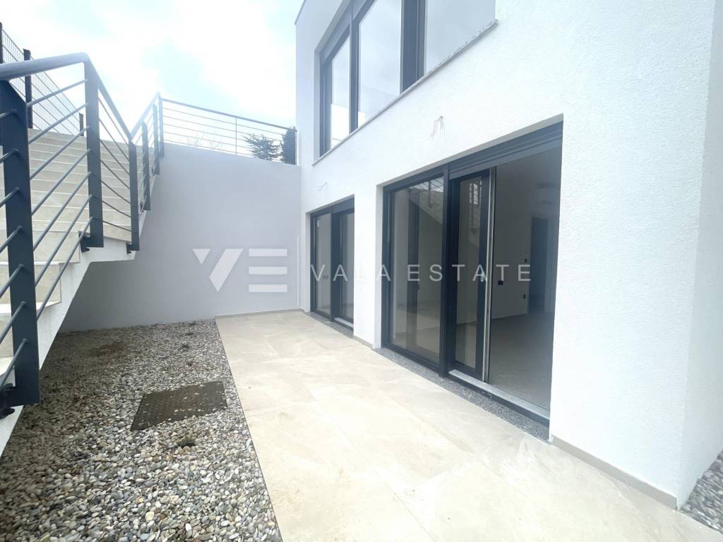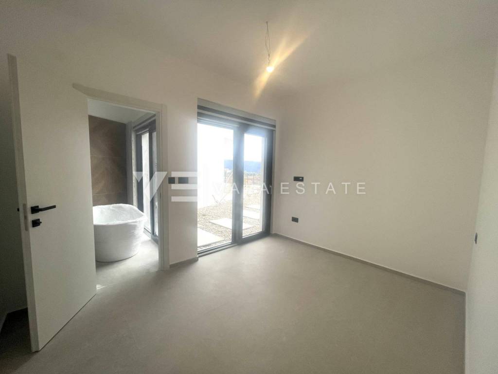 Real estate on the island of Krk, the wider area of the town of Krk - for sale is a new modern semi-detached house in a quiet location with a beautiful sea view. The total living area of the house of 132 m2 is distributed over the ground floor and first floor. The ground floor has three bedrooms, one of which has its own bathroom and walk-in wardrobe, and another bathroom. On the first floor, which is reached by internal stairs, there is a living room with a kitchen and dining area and another bathroom. From the living room there is an exit to the landscaped private garden where there is a swimming pool and a sunbathing area. From the living room there is a staircase to the roof terrace of 35 m2, which offers a panoramic view of the sea and the surrounding nature. High-quality materials and equipment were used during construction, electric underfloor heating was installed in all areas and multi-split air conditioning with heating and cooling. There are also two parking spaces in the fenced courtyard of the house. The house is currently in the final phase of construction, and the complete completion of the works is expected by 06/2025. The distance to the sea is about 1000 m, and to the town center and excellent restaurants about 400 m.