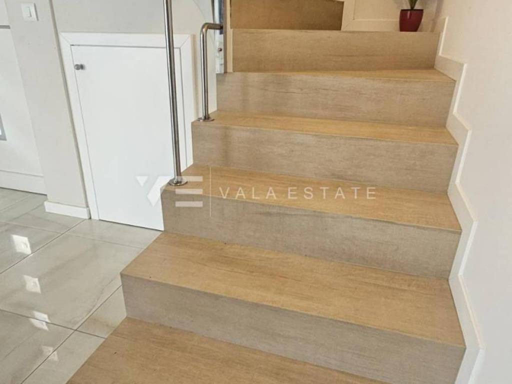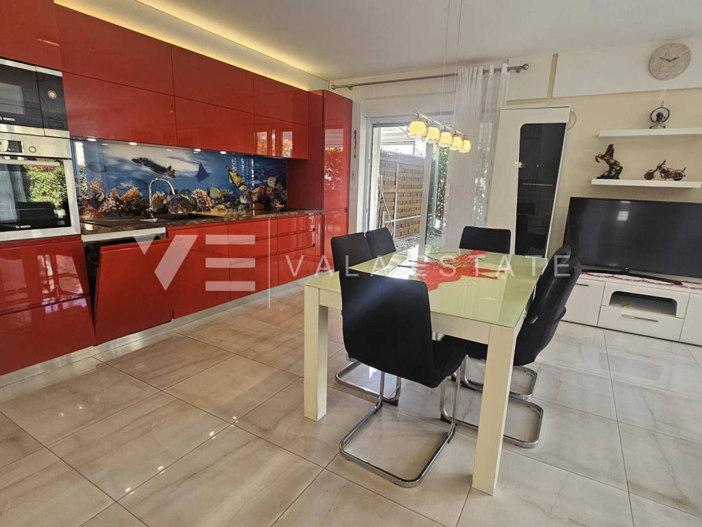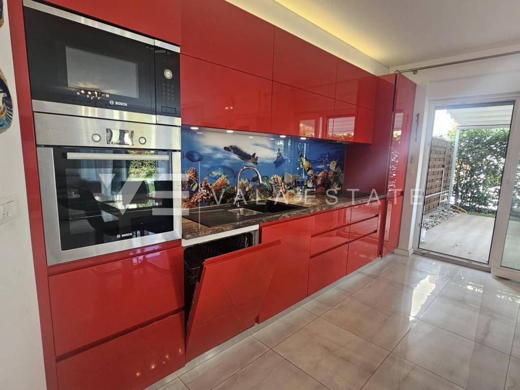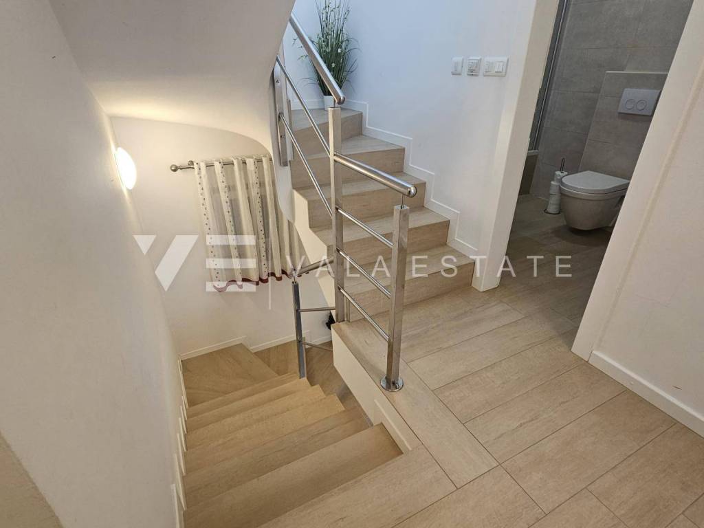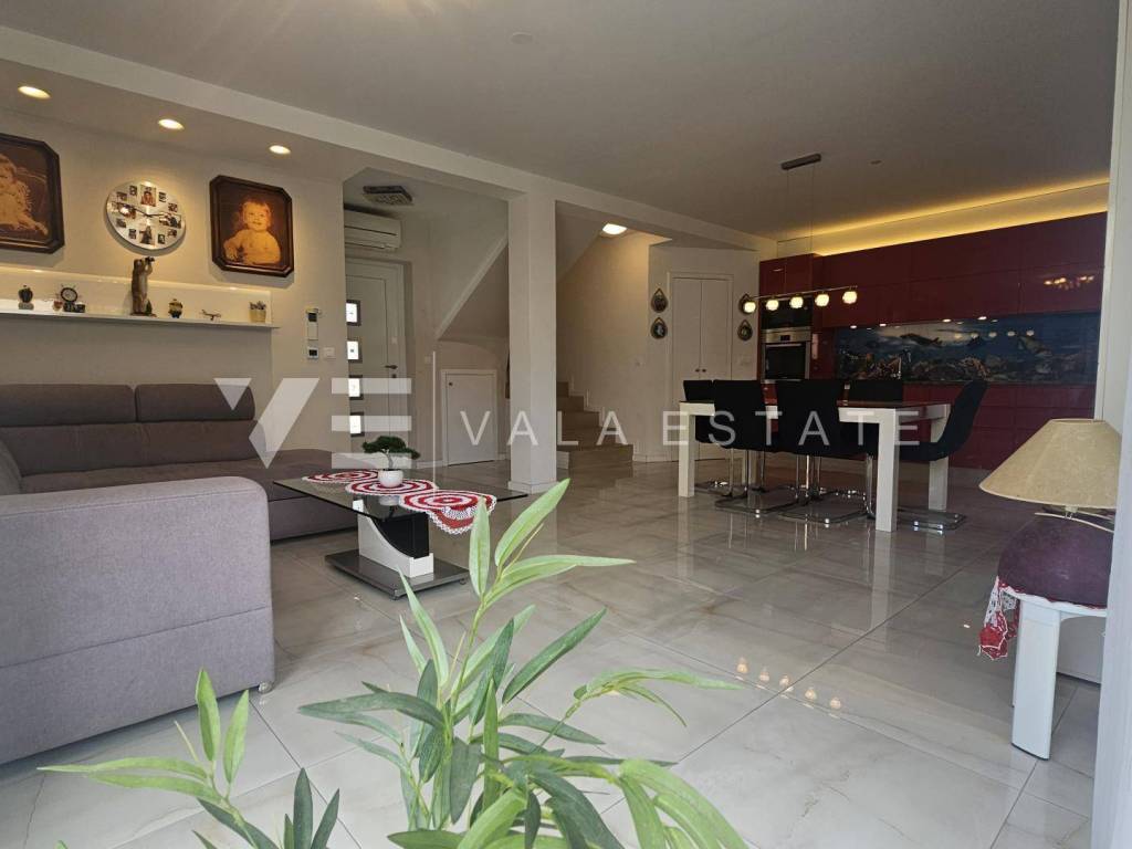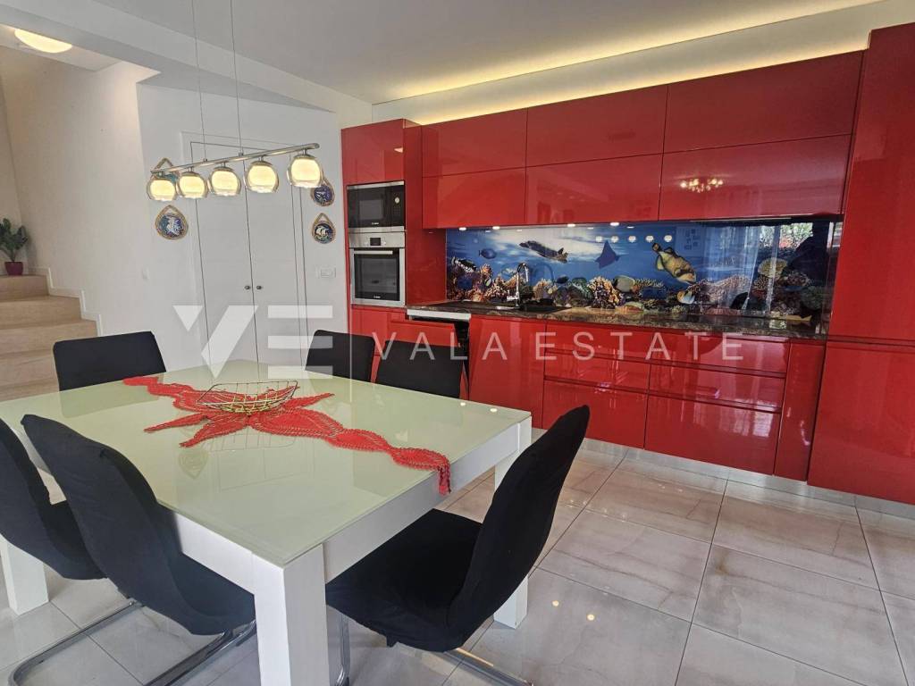 Real estate island Krk, Malinska - for sale is a top-quality three-storey apartment in a newer apartment building with only two residential units. It consists of a ground floor with an entrance hall, storage room, toilet with laundry room and a spacious living room with kitchen and dining area, the first floor with three bedrooms and two bathrooms, one of which has its own bathroom, and a roof area with a partial view of the sea, which is arranged as a covered summer kitchen and sundeck. The apartment on the ground floor is surrounded by a beautiful landscaped garden with its own swimming pool and an area for socializing and spending time outdoors. It is being sold fully furnished and is ready to move in immediately. Quality construction and equipment, underfloor heating, multi-split air conditioning and solar hot water heaters are just some of the features of this apartment. This property is located in a very attractive location near the sea and the center with all the necessary amenities. It is a good opportunity for an investment for tourist rental purposes or for personal residence.