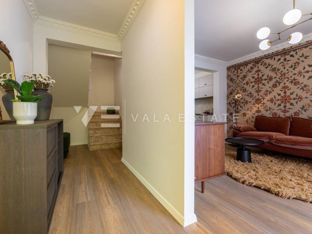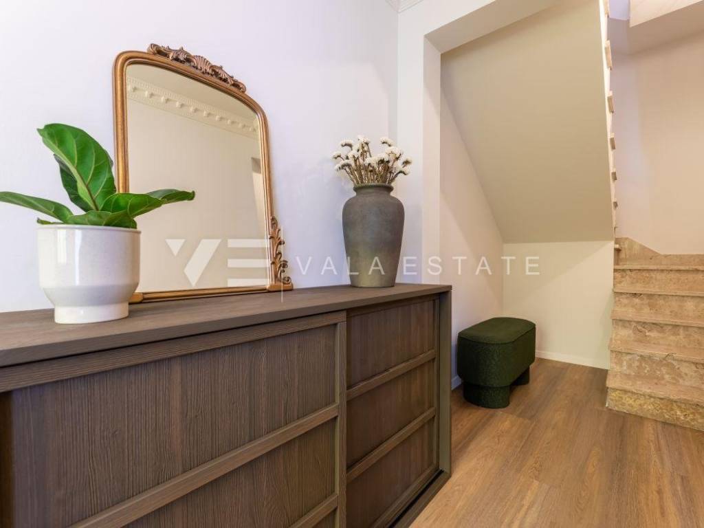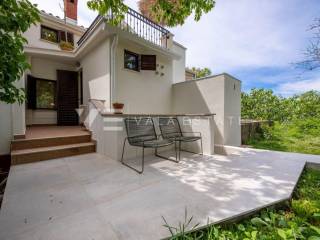 Real estate island Krk, Baška surroundings - for sale is a renovated designer stone house in a row with a beautifully landscaped garden of 100 m2. The house occupies a living area of 128.55 m2 and is divided into a ground floor, a first floor and a high attic. On the ground floor there is a living room with a kitchen, dining room, toilet, tavern and an internal staircase leading to the first floor where there are two bedrooms, a bathroom, a toilet and a terrace of 4.90 m2. In the attic there is a hallway, a spacious bedroom, a bathroom and a nice terrace of 11 m2. During the renovation, quality building materials were used, the house is air-conditioned, fully equipped and decorated with beautiful designer furniture. The location is beautiful and peaceful, surrounded by greenery and approx. 4000 m from the sea and the center.
