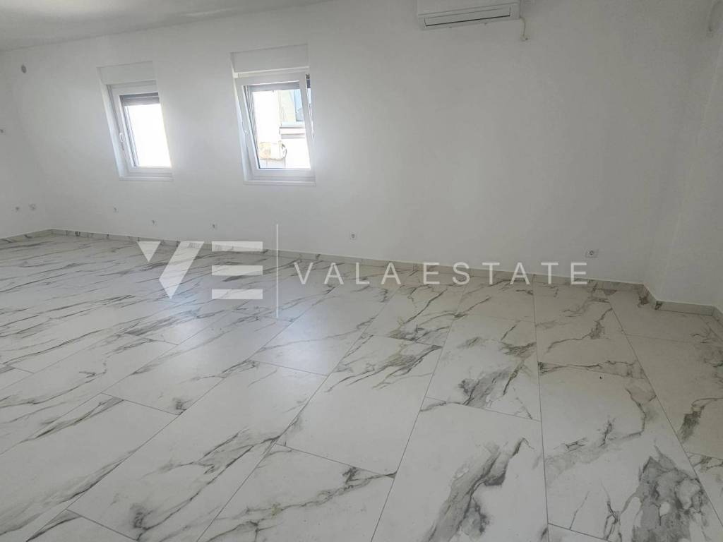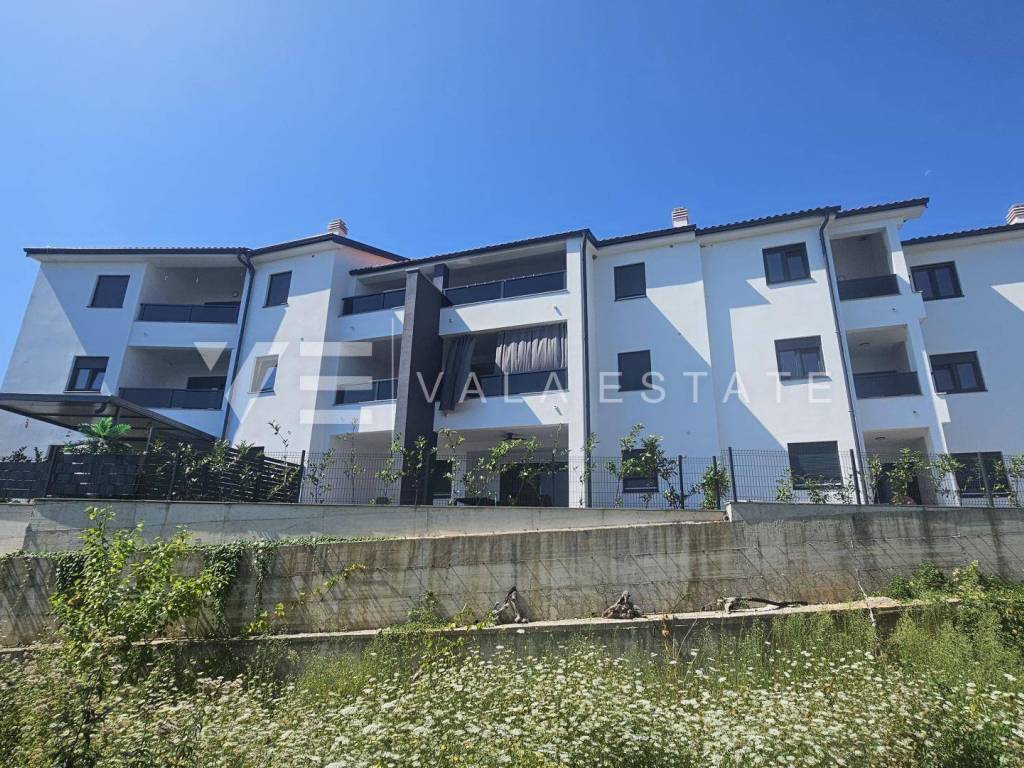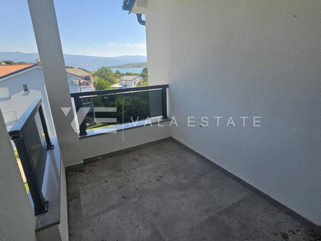 Real estate Island Krk, Soline bay - for sale is an apartment with an excellent layout on the second floor of a new building consisting of three buildings in a row with a total of nine residential units. The apartment has a living area of 71 m2 and consists of an entrance hall, two bedrooms, a bathroom, a covered terrace with a view of the sea, a kitchen with a dining room and a living room. It has one parking space in the common courtyard of the building. Quality materials and equipment are used for construction, including ceramic floor coverings, quality sanitary facilities, room air conditioning, built-in high-quality PVC carpentry with blinds and burglar-proof doors. It is located in a quiet location only 450 m from the sea and beautiful beaches. VAT is included in the price and the buyer does not pay real estate sales tax.