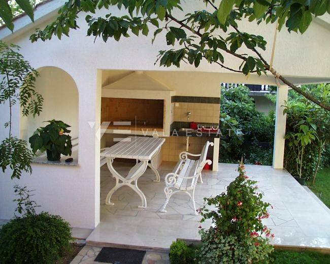 Real estate island Krk, Malinska - a semi-detached house for sale with four furnished apartments spread over 300 m2. In the basement there is a basement with a workshop of 30 m2. On the ground floor there are two apartments of approx. 50 m2 each, with a large covered terrace of 35 m2. One apartment on the ground floor consists of a hallway, bathroom, two bedrooms, kitchen with dining room and terrace. The second apartment consists of a hallway, bathroom, living room, kitchen with dining room, bedroom and terrace. On the first floor is a large comfortable apartment of approx. 100 m2, which includes a hallway, toilet, two storage rooms, a large living room on two levels, a bedroom, a bathroom, a large dining room with a kitchen and a covered terrace of 35 m2. The high attic consists of an entrance area, bathroom, two bedrooms, wardrobe, living room, attic, terrace and covers approx. 80 m2. On the ground floor there is also a business space of 22 m2, a boiler room for central heating, a toilet and a small woodshed. There is a garage next to the house. There is a closed gazebo and three parking spaces in the beautifully landscaped and green garden. It is located in a great location, just a 5-minute walk to beautiful beaches and the center with all facilities. This property is an exceptional opportunity for investment for the purpose of tourist rental as well as own housing.