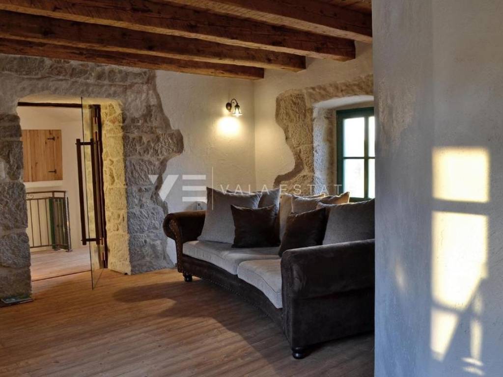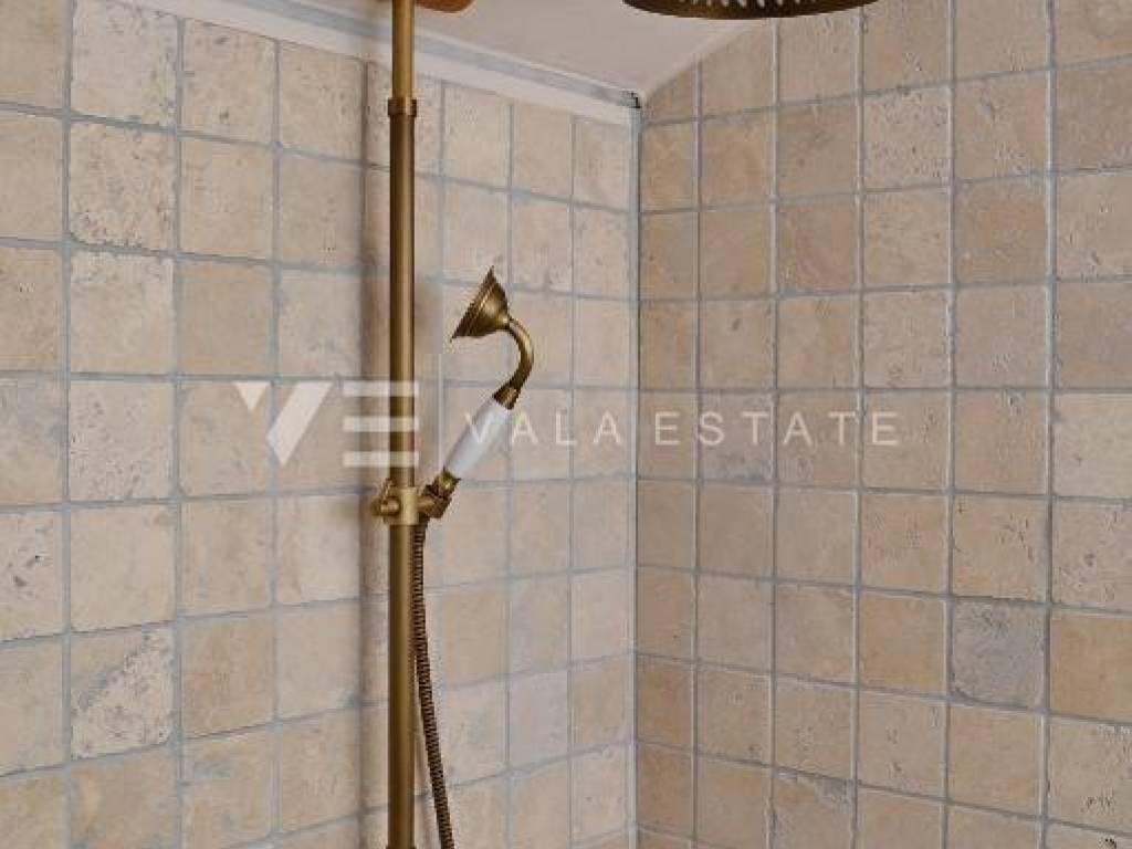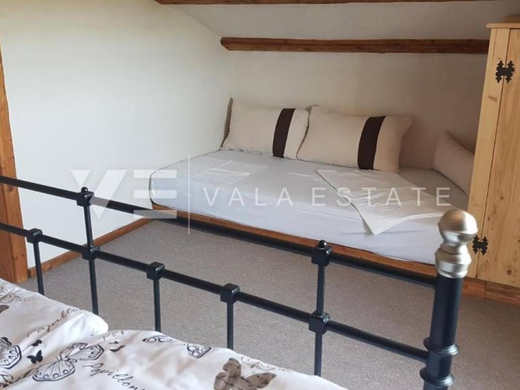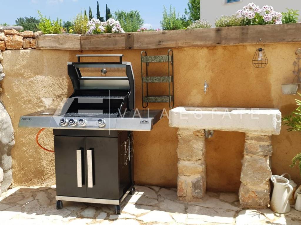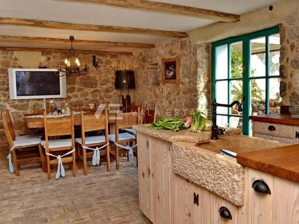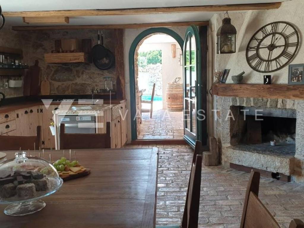 Real estate on the island of Krk, in the vicinity of Malinska - in a beautiful and quiet location surrounded by nature and greenery, a semi-detached stone house with Mediterranean features, built on a plot of 250 m2, is for sale. The house occupies 100 m2 of living space, which includes the ground floor, first floor, second floor and high attic. On the ground floor there is a laundry room, a toilet, a living room, a kitchen and a dining room with access to the terrace and garden with a swimming pool. On the first and second floor there is one bedroom, bathroom and living room, while in the high attic there is another bedroom. During the renovation in 2015, quality materials were used, high-quality wooden joinery was installed and underfloor heating powered by a heat pump. The house is fully furnished in Mediterranean style, autochthonous elements and stone have been retained, it is air-conditioned and has a fireplace. It is surrounded by a beautiful garden surrounded by an autochthonous dry stone wall of 145 m2 with planted Mediterranean plants, where there is a swimming pool, terraces, a summer kitchen and two parking spaces. The house is ideal for all lovers of coastal architecture. The location is beautiful and peaceful, surrounded by greenery and approx. 2500 m from the sea.