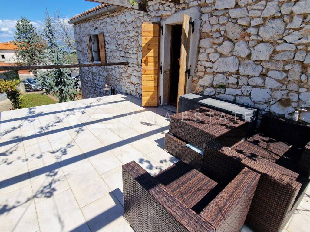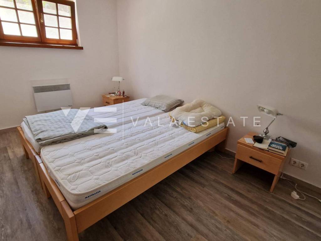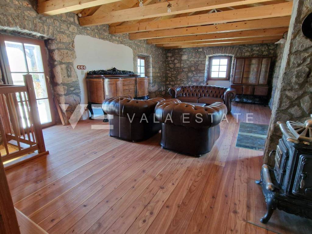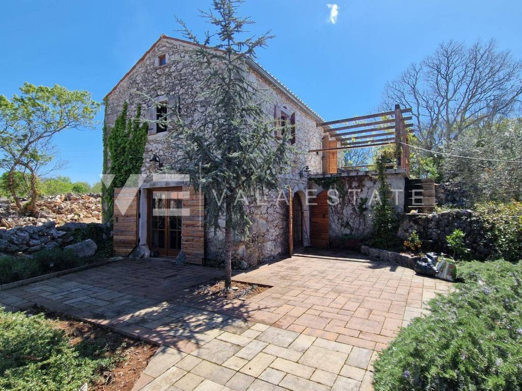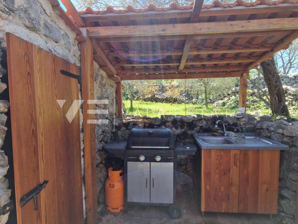 Real estate on the island of Krk, in the vicinity of Malinska - for sale is a renovated stone house, built on a plot of 456 m2. The house occupies a living area of 160 m2 and is divided into a ground floor and a first floor. On the ground floor there is a bathroom, bedroom, kitchen, dining room and living room with access to the terrace and garden. An internal staircase leads to the first floor, where there is a spacious room with an exit to the terrace with a view of the sea. The room can be converted into two bedrooms if necessary. Preparations for the bathroom have also been made on the first floor. There is also a smaller auxiliary building in the garden, which is decorated as a studio apartment. The house has been renovated and furnished in a rustic style in the interior and exterior. During the renovation in 2020, autochthonous elements and stone were kept. The house is surrounded by a beautiful garden of 350 m2 with a terrace, a summer kitchen and Mediterranean plants, and it is surrounded by an autochthonous dry stone wall. The house is ideal for investment in a holiday home for tourist purposes, but also for all lovers of coastal architecture. The location is beautiful and peaceful, surrounded by greenery and approx. 2500 m from the sea.