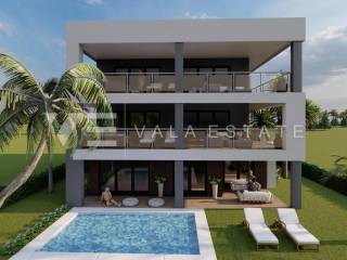 Real Estate Island Krk, Vrbnik - for sale is a superb new two-bedroom apartment in an excellent location in Vrbnik, with a garden, swimming pool and partial sea view. The apartment is located on the ground floor of a completely new building with only three apartments and occupies a living area of 136.60 m2. The premises are excellently planned and include a staircase, an elevator with access to the basement, an entrance hall, a laundry room, two bathrooms, two bedrooms, one of which has its own bathroom, a spacious living room with a kitchen and a dining room with access to a covered terrace of 23.4 m2 and a beautifully landscaped private garden with its own swimming pool, sunbathing area and space for socializing. The apartment has two parking spaces, one of which is covered, and a storage room in the basement of 11 m2. Quality construction and equipment, a selection of top-quality ceramics and floor coverings, modern sanitary ware, ALU external carpentry, underfloor heating with a heat pump, video surveillance and an air-conditioned heating/cooling system are just some of the features of this modern new building, and what makes it particularly attractive is an exceptional location with an open panoramic view only 700 m from beautiful beaches and about 500 m from the center of Vrbnik. The property is currently under construction, and the completion of the works and occupancy is planned by the summer of 2024.