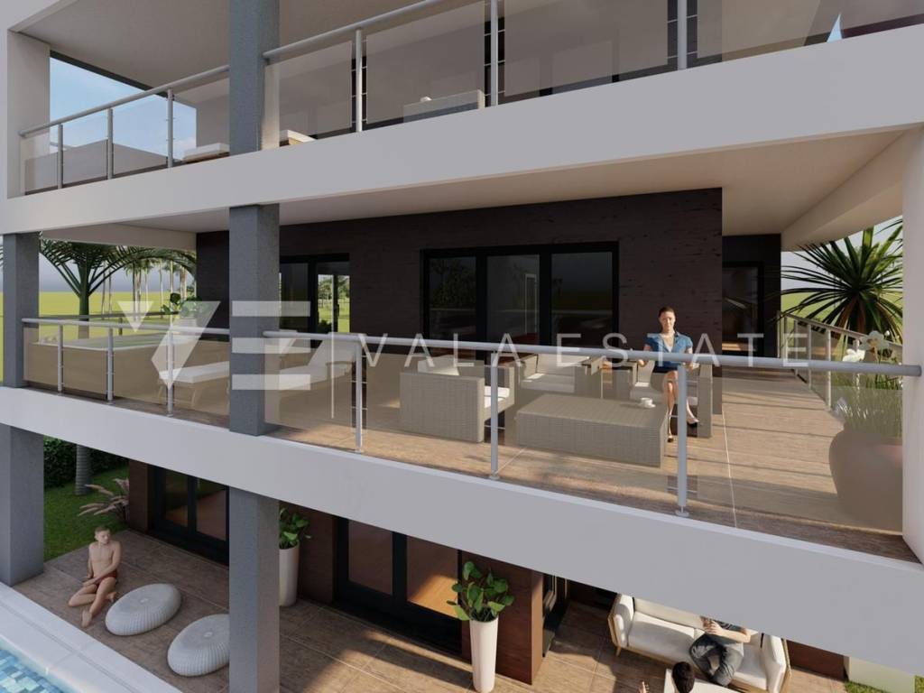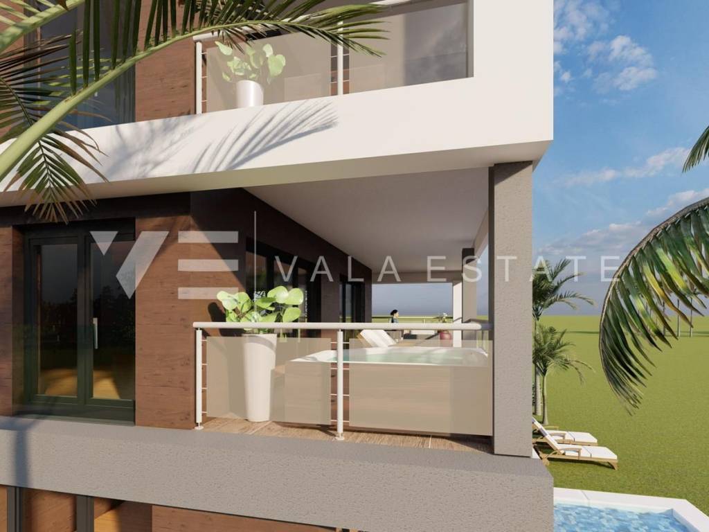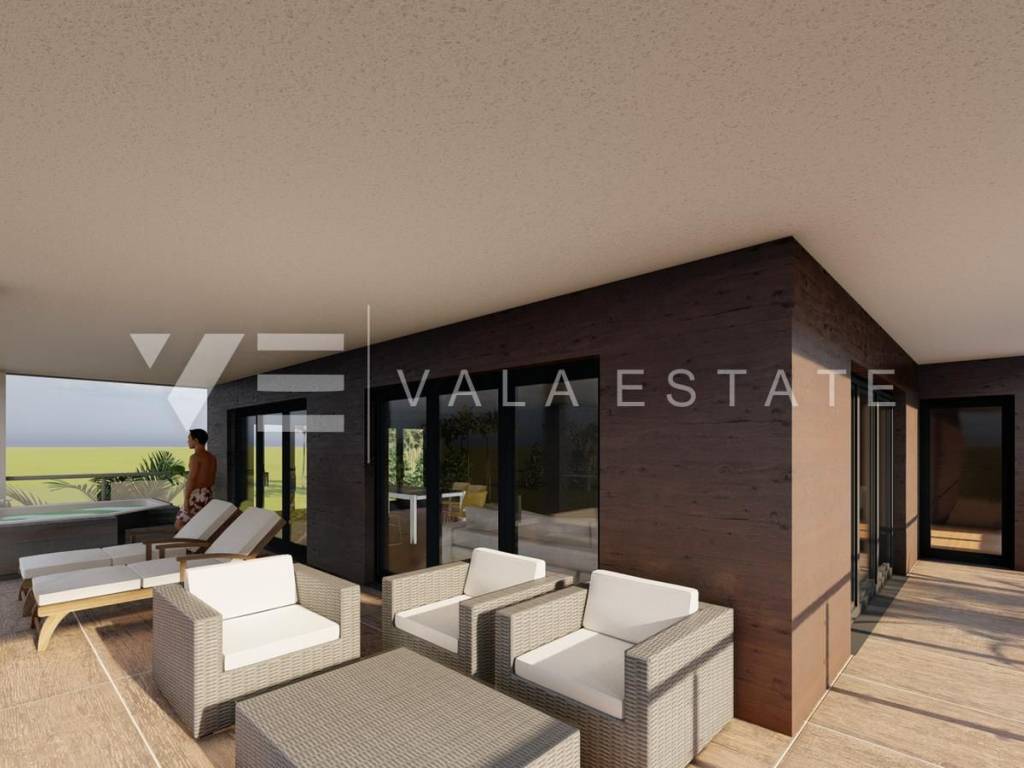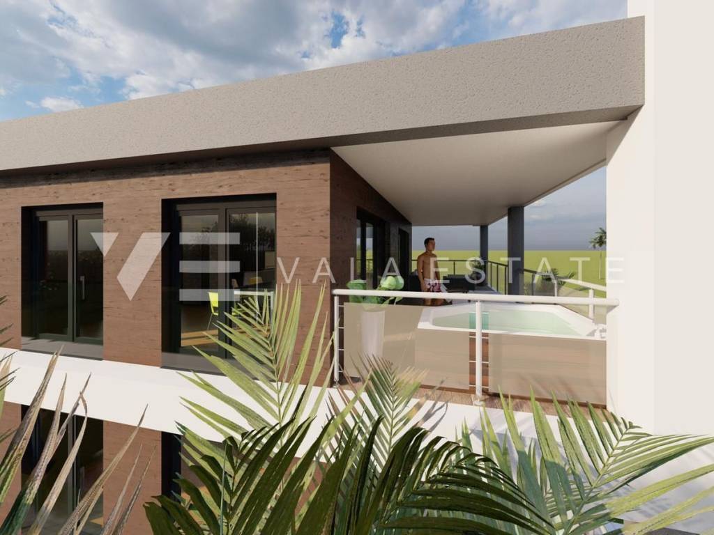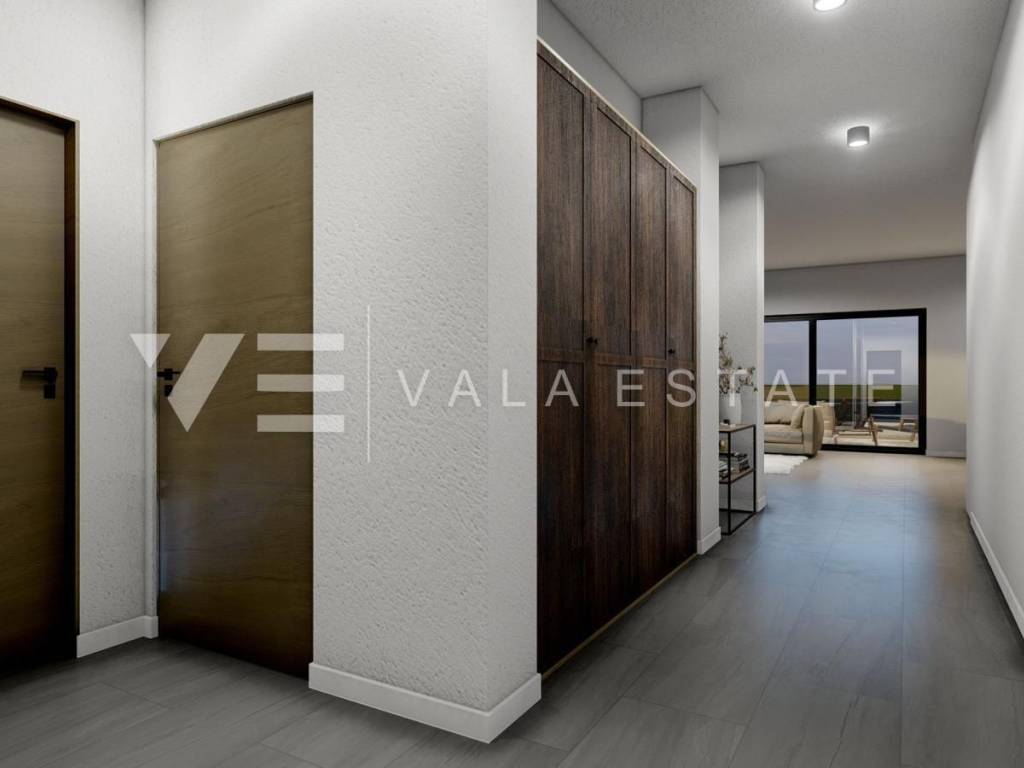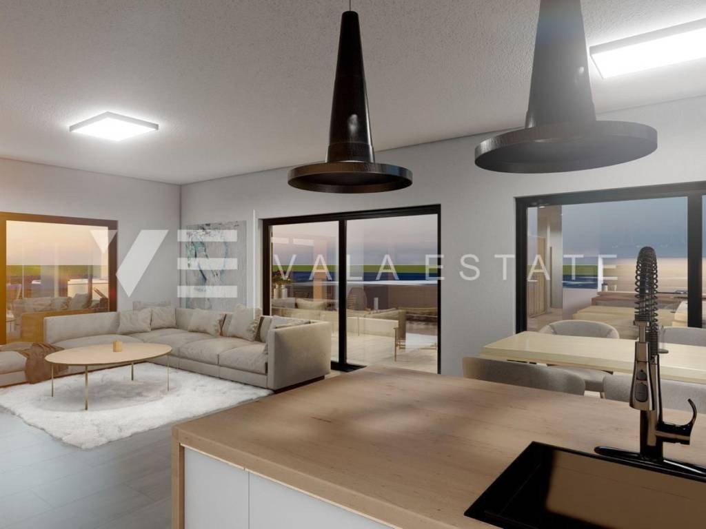 Real estate island of Krk, Vrbnik - in a very attractive location in Vrbnik, two modern apartments with a total area of 192.50 m2 are for sale on the first floor of an urban apartment villa, with panoramic sea views from all rooms. The apartments consist of a staircase and an elevator with direct access from the ground floor or basement. The larger apartment consists of an entrance hall, laundry room, two bathrooms, two bedrooms, one of which has its own bathroom and access to a 5 m2 loggia, a spacious living room with a kitchen and dining room with access to a large covered terrace with a jacuzzi, which creates the impression of a lounge area with a fantastic view of the sea. The smaller apartment includes an entrance area, bathroom, bedroom and a living room with a kitchen and dining room with access to a covered terrace with a sea view. The apartments have two parking spaces, one of which is covered, and a storage room in the basement of 11.3 m2. Quality construction and equipment, a selection of top-quality ceramics and floor coverings, modern sanitary ware, aluminum exterior joinery, underfloor heating with a heat pump, video surveillance and an air-conditioned heating/cooling system are just some of the features of this modern new building, and what makes it particularly attractive is the exceptional location with an open panoramic view, only 700 m from beautiful beaches and about 500 m from the center of Vrbnik. The property is currently under construction, and completion of works and move-in is planned for the summer of 2024. Vala Estate Malinska Agency will provide you with a safe and transparent transfer of ownership and all necessary documentation.