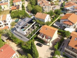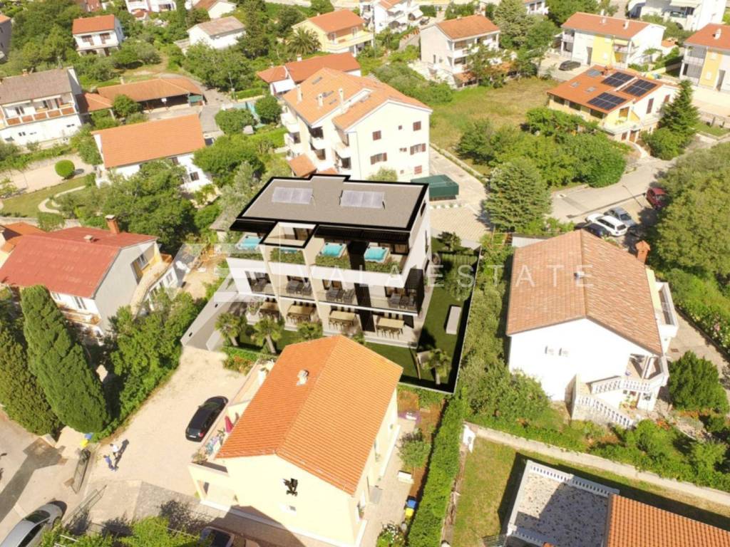 Real estate island of Krk, city of Krk - for sale is a new three-story apartment in a modern multi-family building with four apartments, total living area 99.26 m2. The ground floor consists of an entrance terrace, a toilet, a kitchen with a dining area and a living room from which there is access to a covered terrace and a garden of 13 m2. The first floor includes two bedrooms, a bathroom and a balcony, while on the second floor there is a large room with a bathroom and access to a terrace with a jacuzzi. The apartment has two parking spaces, one in the garage located in the basement and the other in the garden of the building. It is located in an excellent location, only 500 m from the beaches and near the center of Krk. High-quality construction and equipment, first-class ceramics and sanitary ware, PVC carpentry with aluminum shutters, a heat pump for preparing hot water and underfloor heating, and multisplit air conditioning are the main features of this new building. The property is currently under construction, and the expected completion of the works and occupancy is expected by the end of 2023. The buyer does not pay real estate sales tax, VAT is included in the price.
