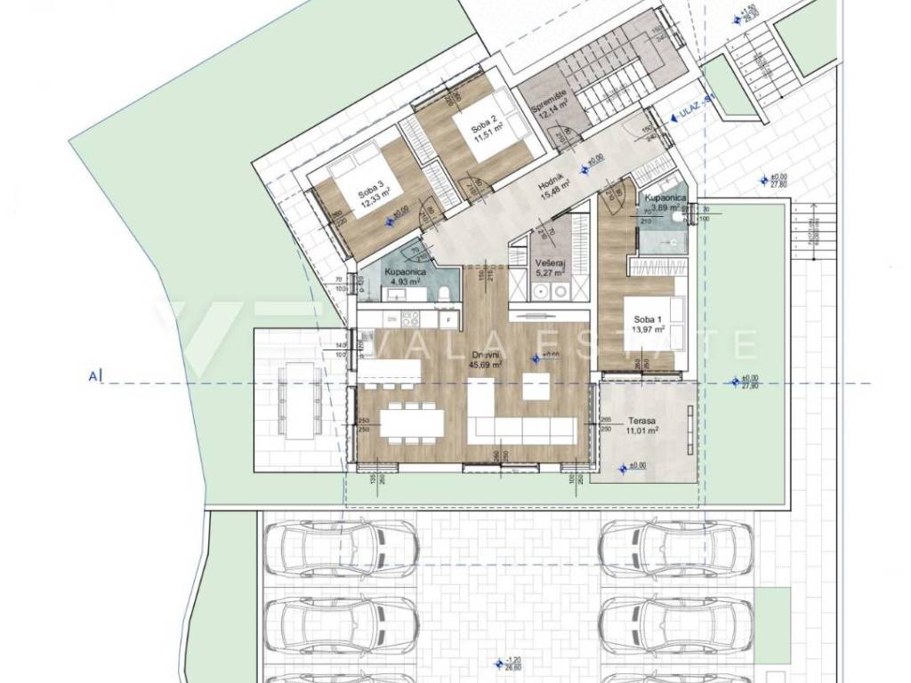 Real estate island Krk, city of Krk - for sale is a new luxury apartment on the ground floor of a new urban villa with a total of three residential units, living area 136.22 m2. The apartment consists of an entrance hall, a laundry room, a storage room, two bathrooms, three bedrooms, a kitchen with a dining room and a living room that leads to a covered terrace of 11 m2 and its own beautifully landscaped garden surrounded by nature. The apartment also has two parking spaces. High-quality construction and equipment, first-class ceramics and sanitary ware, aluminum carpentry with aluminum shutters, underfloor heating and multisplit air conditioning are the main features of this luxurious new building. The apartment is located in an excellent location in the town of Krk, only 500 m from the beaches and close to all amenities. The property is currently under construction, and the expected completion of the works and occupancy is expected by the end of 2025. The buyer does not pay real estate sales tax, VAT is included in the price.