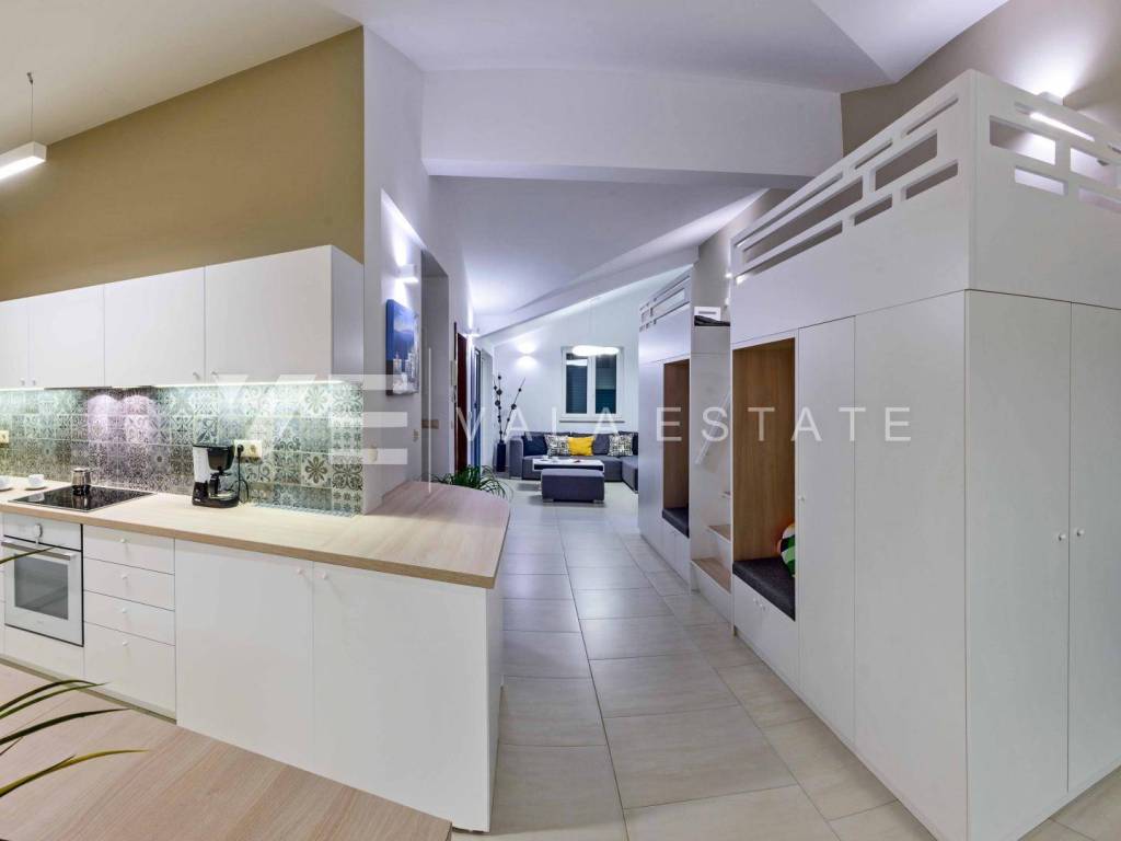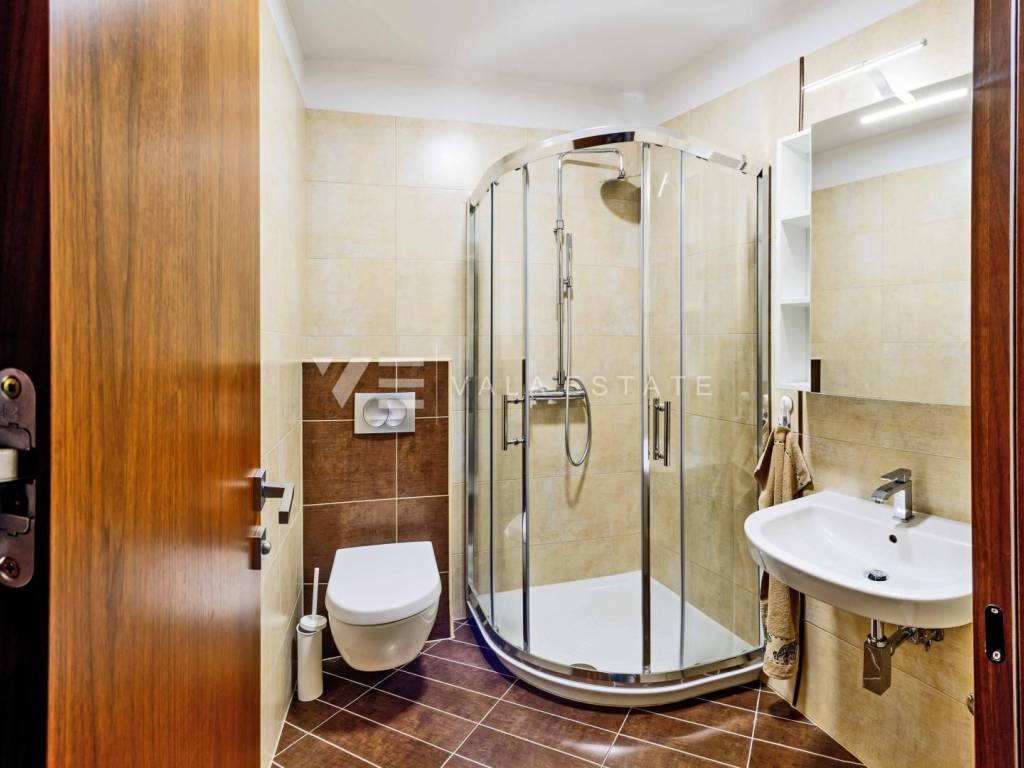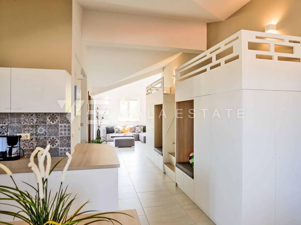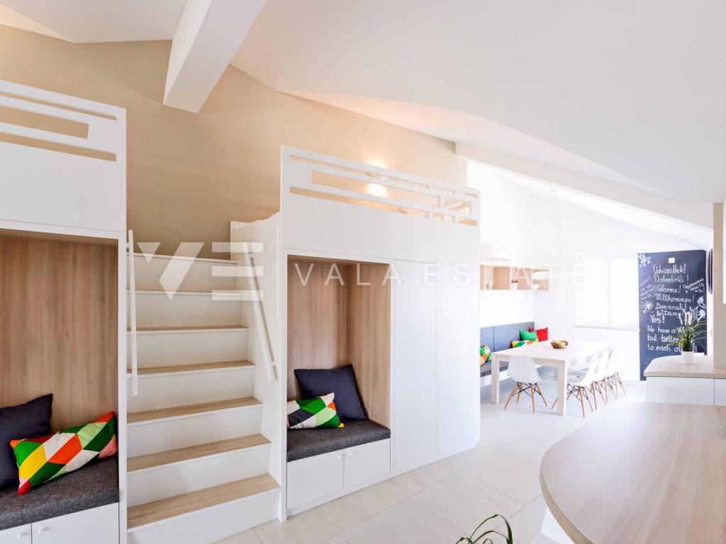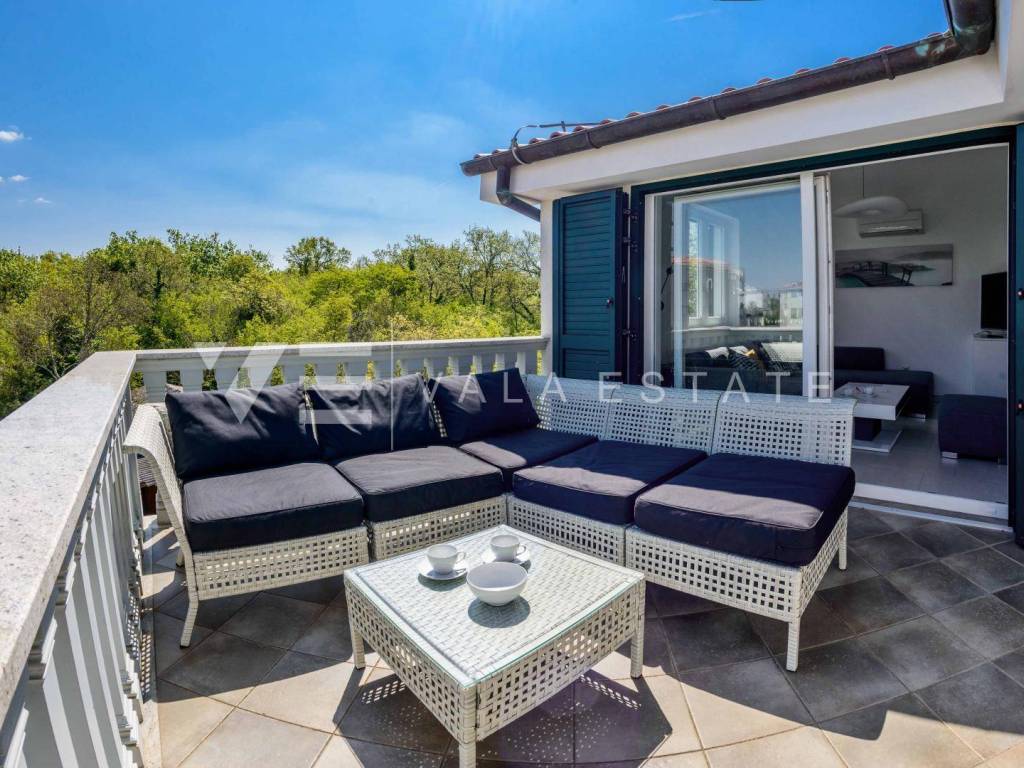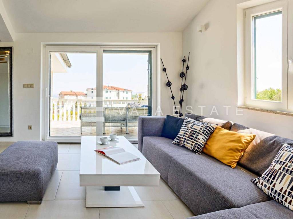 Real estate Island of Krk, Malinska - for sale is a modern apartment located on the second floor of a multi-family building. The total area of 118.25 m2 is divided into an entrance hall, a storage room, four bedrooms, two bathrooms, a living room with access to a smaller uncovered terrace and a kitchen with a dining room that has access to a larger covered terrace with a partial view of the sea. The apartment has two parking spaces in the common courtyard of the building. It is sold fully furnished with high-quality, modern custom-made furniture and equipped with top-quality electrical appliances. It is located in a beautiful and quiet location only 250m from the sea and the first beaches.