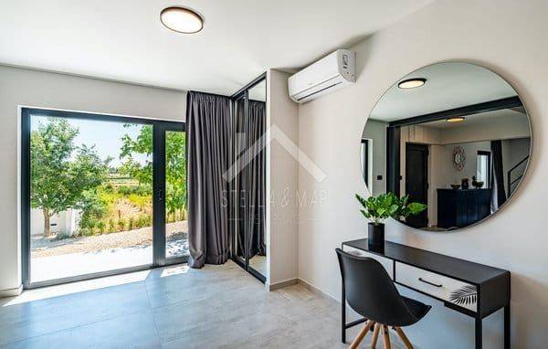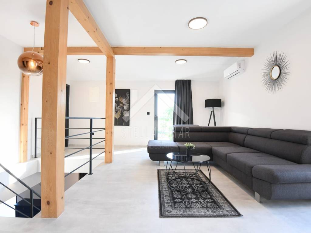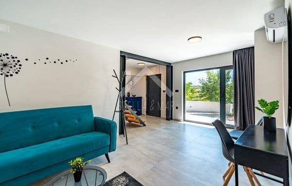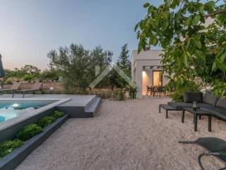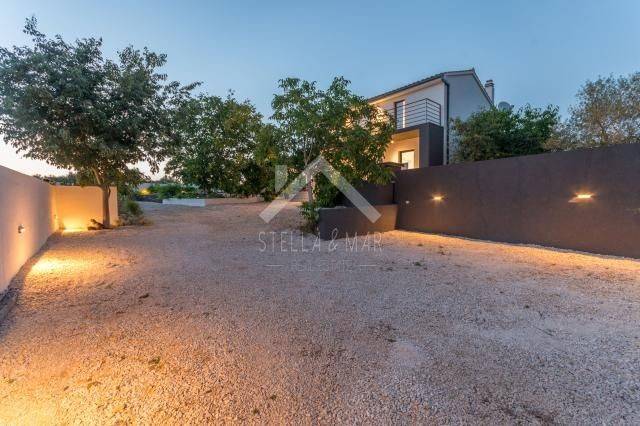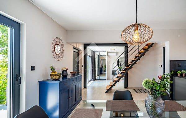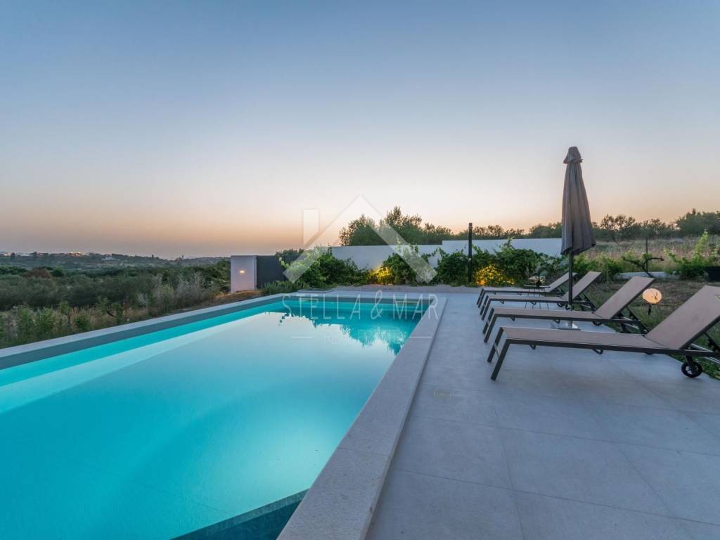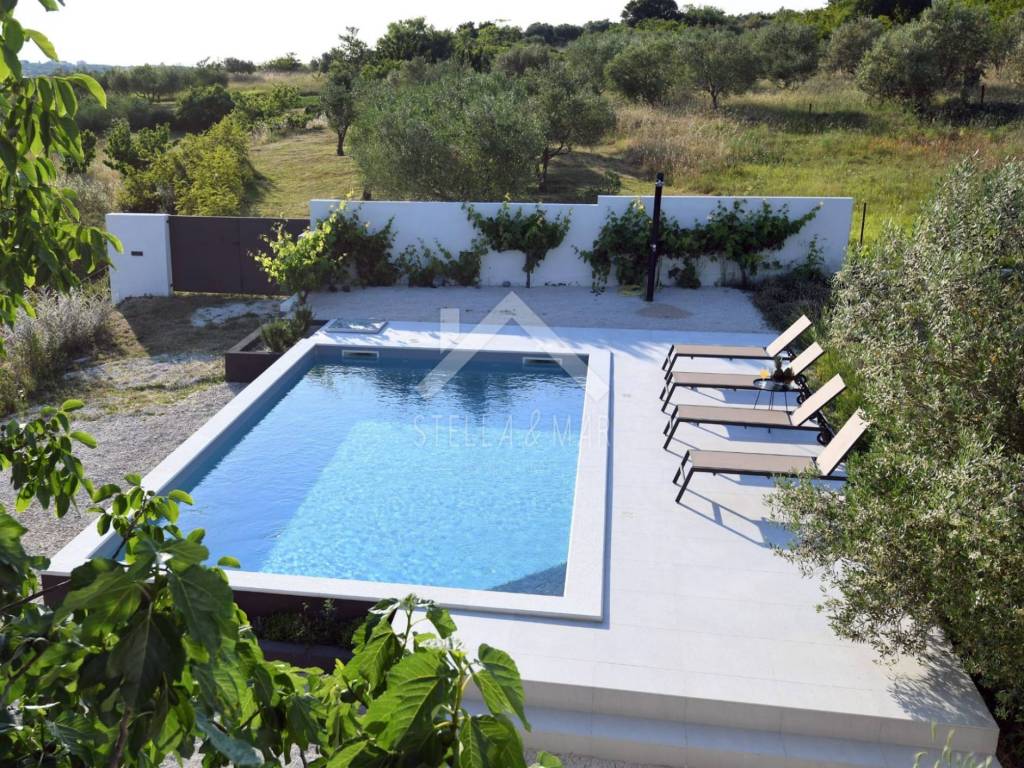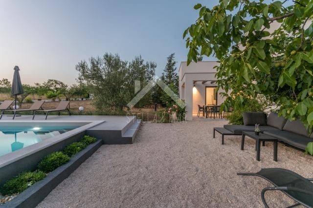 Modern furnished villa for sale in Crno, near Zadar. This villa of 190 m2 extends over 2000 m2, with the possibility of buying another 3000 m2 of land next to the villa. The villa is located on agricultural land with a tendency to be converted into building land. It offers a beautiful panoramic view of its own garden with 30-year-old olive trees, vines and other Mediterranean plants. The grounds also include an orchard of cherry, cherry, apple, pear and plum trees. A huge walnut tree is planted in front of the villa, which creates natural shade even in the hottest days. The pool offers an incredible panoramic view. This villa is unique on the market because of its proximity to the city (8km) and yet it is an oasis of peace, hidden from view.