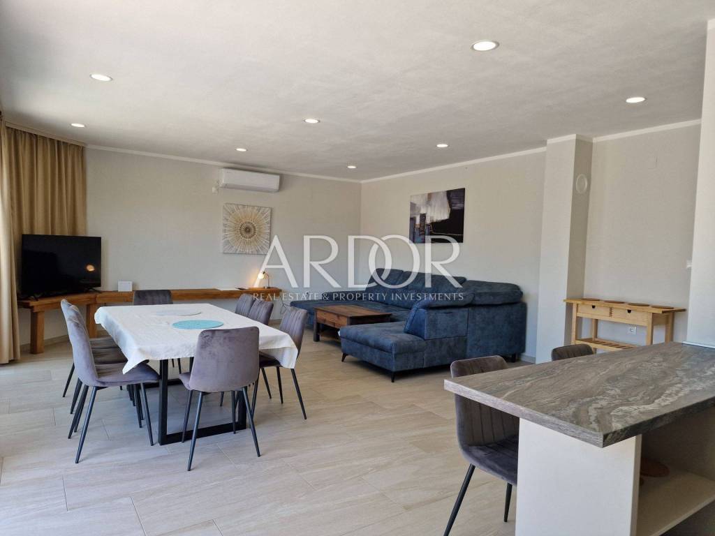 Crikvenica, luxury house for rent with panoramic sea view and swimming pool. The house is newly built, modern and equipped with quality furniture. On the ground floor there is a toilet and an open space area with a kitchen, dining room and living room, from which you can go out through a glass wall to the terrace and sunbathing area with a swimming pool. On the mezzanine there is a room with its own bathroom, and on the first floor there are three bedrooms with their own bathrooms and a terrace with a view of the sea. The building has another intermediate floor where there is a room with a bathroom and a small balcony. Hot water is heated using solar panels, and the building is heated by underfloor heating. The building has a garage with two parking spaces.