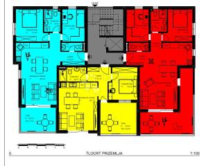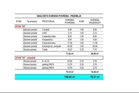 In Ričine, in a quiet part of Zadar close to schools, shops, kindergartens and public transport, there is a modern building with high energy efficiency and top-quality construction. The microlocation is a top position in a well-maintained street with newer construction and neat parking. Apartment S3 on the ground floor offers two bedrooms, a large living room connected to the kitchen, a bathroom, a separate toilet and a hallway. The calculated net usable area of the apartment with its accessories is 79.21 m2. The closed residential part consists of a living room with a kitchen of 30.36 m2, bedrooms of 11.36 m2 and 8.93 m2, a bathroom of 4.54 m2, a separate toilet of 2.12 m2 and a hallway of 3.94 m2. The apartment has a garden V3 of 47.64 m2 and two parking spaces PM13 and PM14 of 13.75 m2 each.