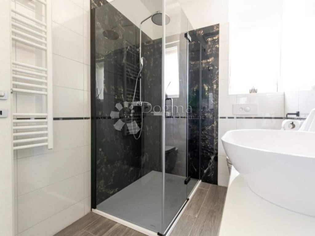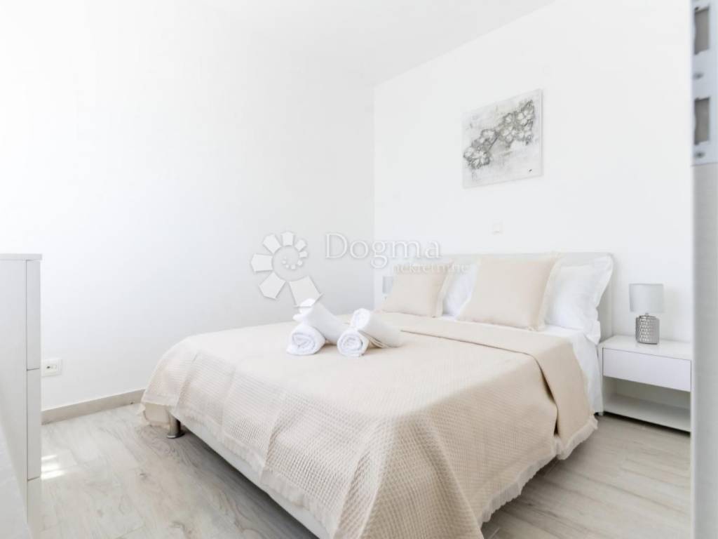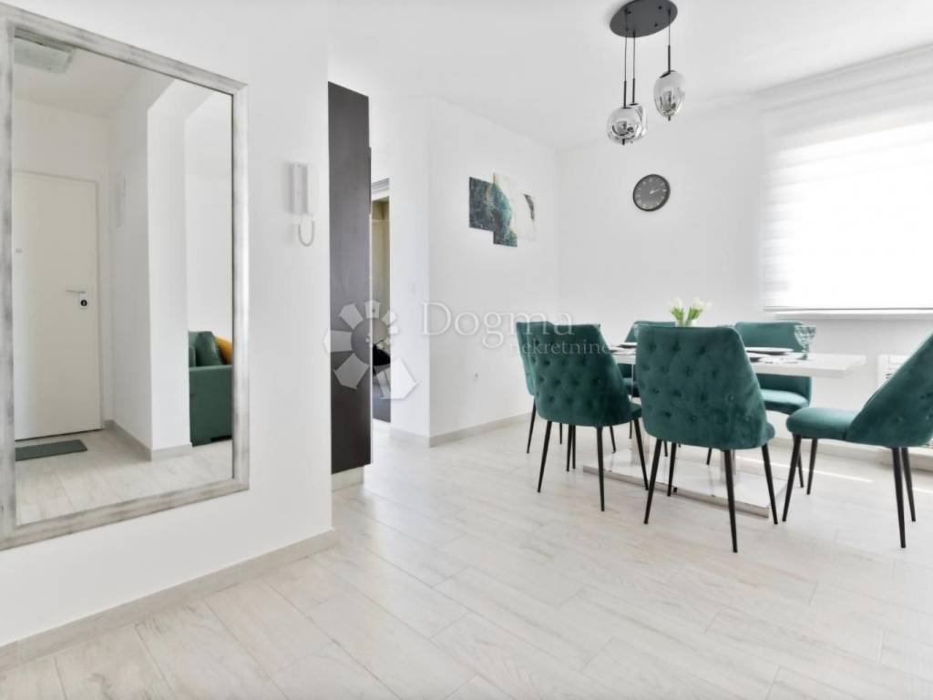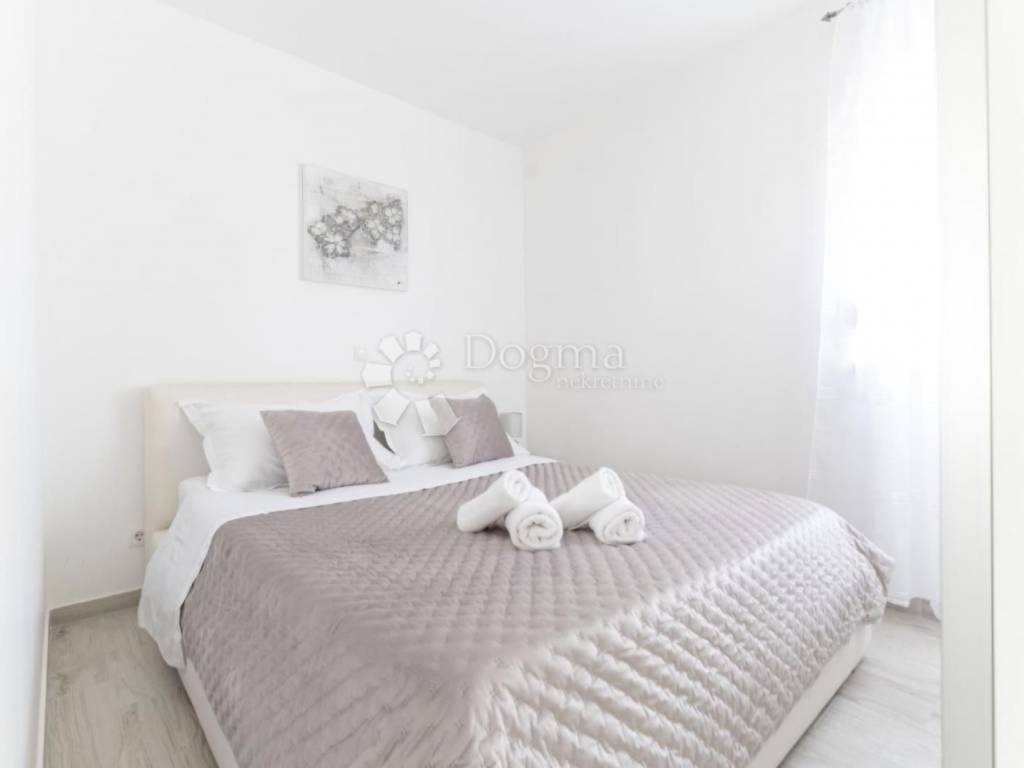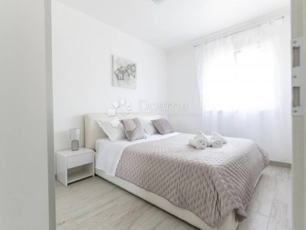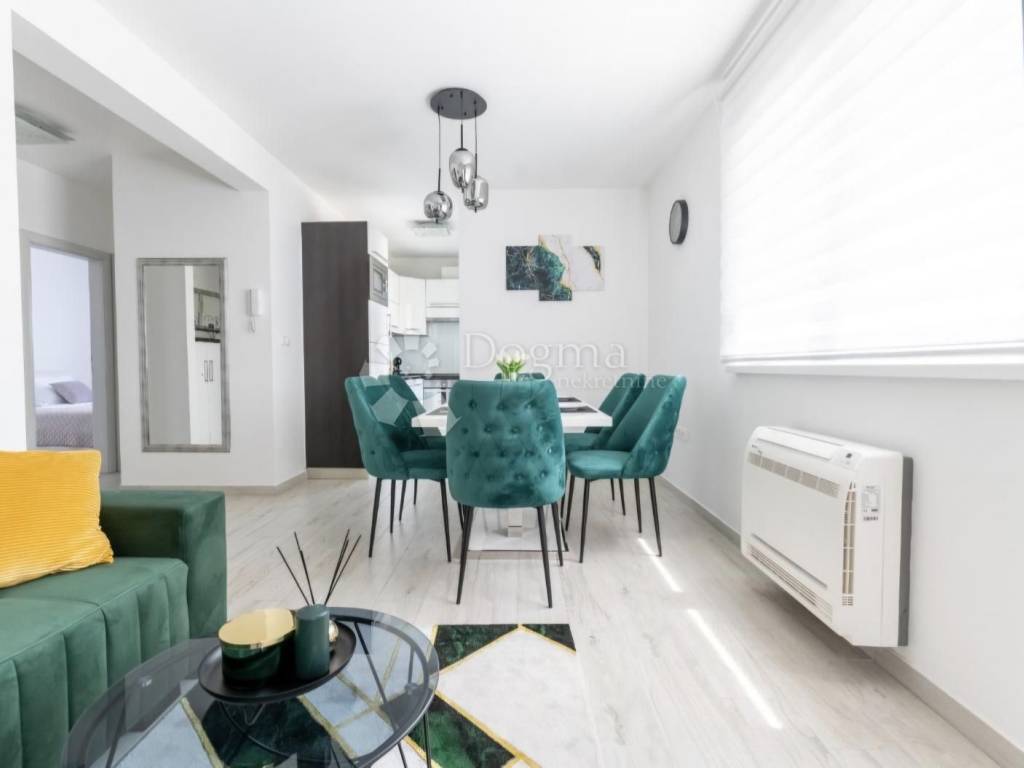 Modern furnished apartment for sale in Trogir, in a fantastic location. The apartment is located on the first floor of a smaller building with a total of six apartments and consists of an entrance, bathroom, kitchen, dining room, living room, three bedrooms and a terrace and balcony. The apartment is modernly equipped and faces south, which ensures plenty of natural light during the day, and is sold fully furnished, so no additional investment is required. It is located in a great location, just a few minutes from the center and the sea. The building has its own fenced yard, so the apartment has its own parking lot. An ideal opportunity for anyone looking for their own oasis of peace and a great investment opportunity, as this property is an ideal property for tourism.