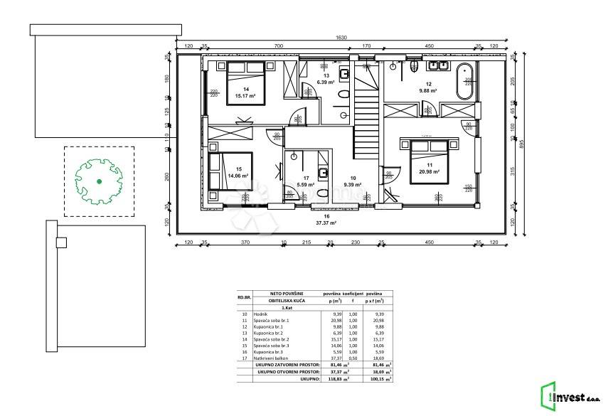 On the 1st floor there are 3 bedrooms, each with its own bathroom, one of which is the master bedroom with an area of 21 m, and the bathroom is 9.88 m.