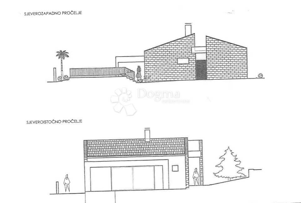 Građevinsko zemljište s projektom kuće od 120 m2 s bazenom, 300-njak metara od mora. Po projektu 3 spavaće sobe, veliki "open space" koncept dnevnog boravka s kuhinjom i blagovaonicom, terasom i bazenom blizu kuće.