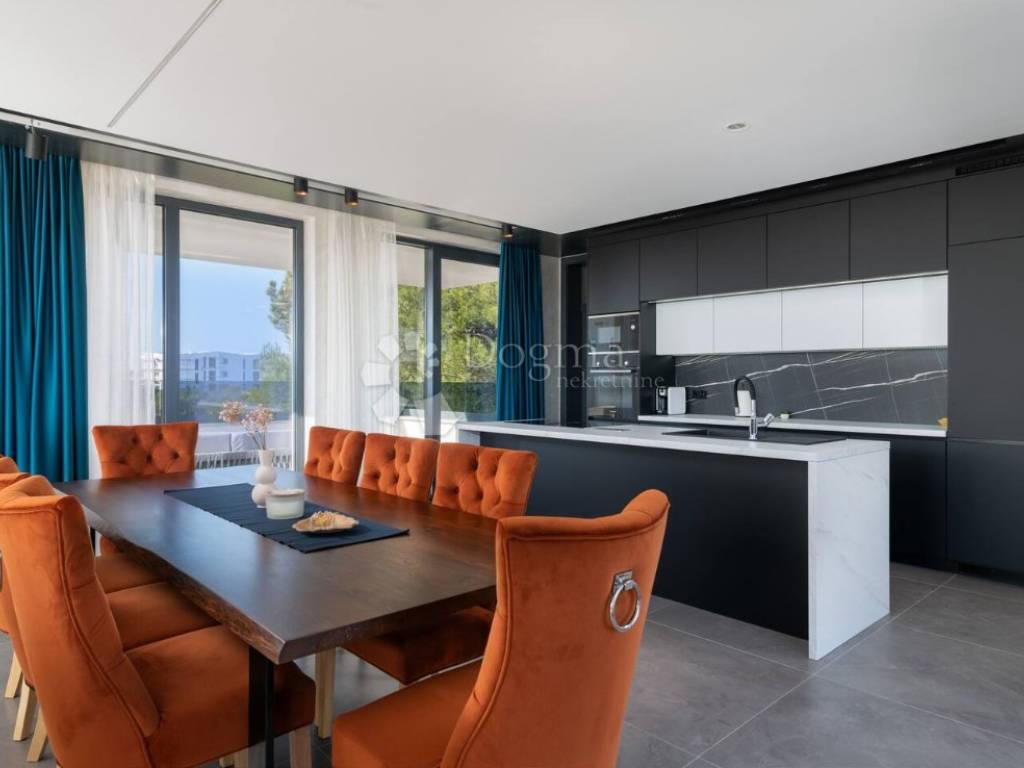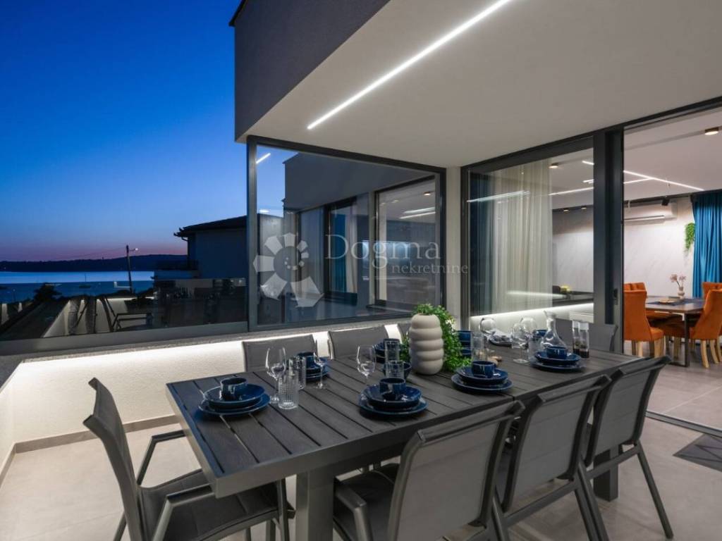 On the first floor, which can be reached by elevator, internal or external stairs, there is a corridor, toilet, storage room, then you can enjoy the open space concept of the kitchen with dining room and living room, from the terrace of which there is a wonderful view of the sea that will certainly delight you. at any time of the day as well as at any time of the year.