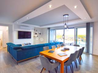 The sanitary fixtures throughout the house are of premium quality, including Geberit toilets and Hansgrohe faucets. Each room is equipped with an Android TV offering a selection of satellite channels. Expansive sliding glass panels, specifically the Planitherm 4S Evolution 4-18-4 brand, grace the villa's windows, allowing ample natural light and providing access to the terrace.