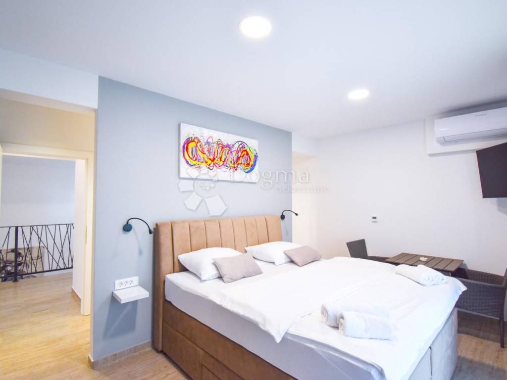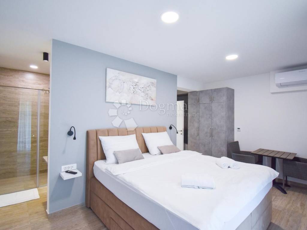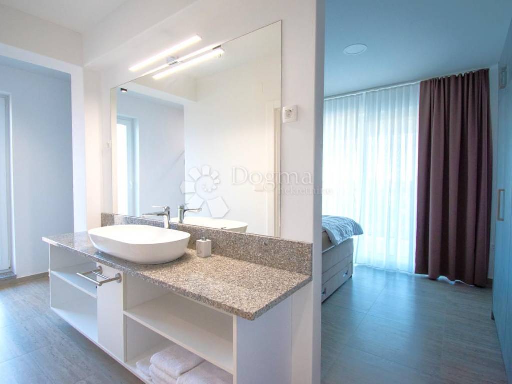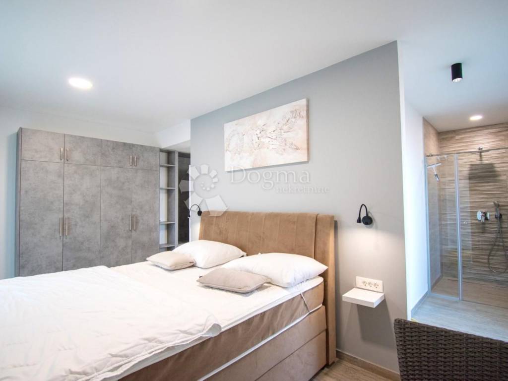 The villa comprises a total of 5 bedrooms, each featuring its private walk-in shower, toilet, and a spacious 8 m2 balcony. The ground floor hosts a room with a bathtub. The room floors are adorned with high-quality porcelain stoneware ceramic, specifically travertine.
