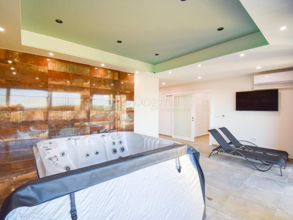 The outdoor expanse of the villa is equally inviting, featuring a commodious 78 m2 terrace paired with an inviting 8 m x 4 m pool. The pool boasts a built-in massage bench, a solar shower, a cascading waterfall, a spacious sunbathing area equipped with 10 loungers, and a clever pool-cleaning robot. Additionally, a summer kitchen is on hand, complete with a sink, electric grill, induction hob, and a refrigerator.