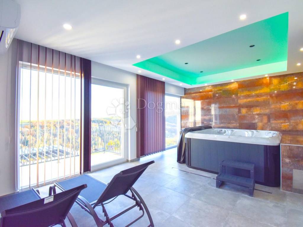 Available for purchase is an elegant villa with a pool in Novi Marof, boasting a generous total area of 572 m2. The living quarters span 276 m2.