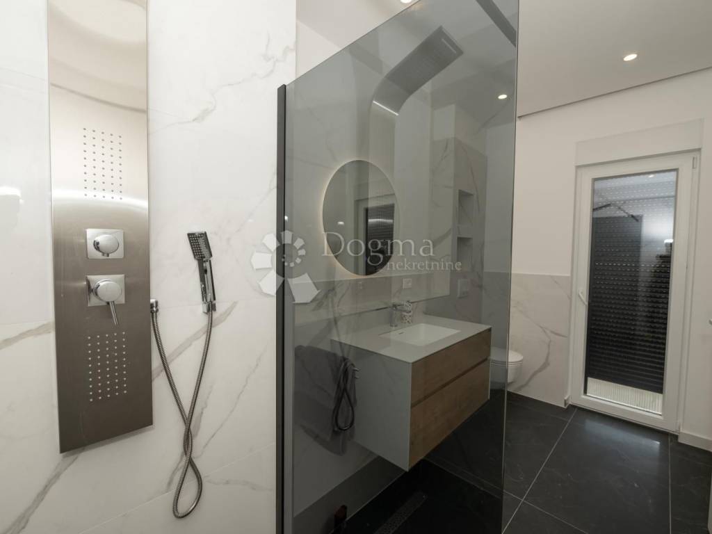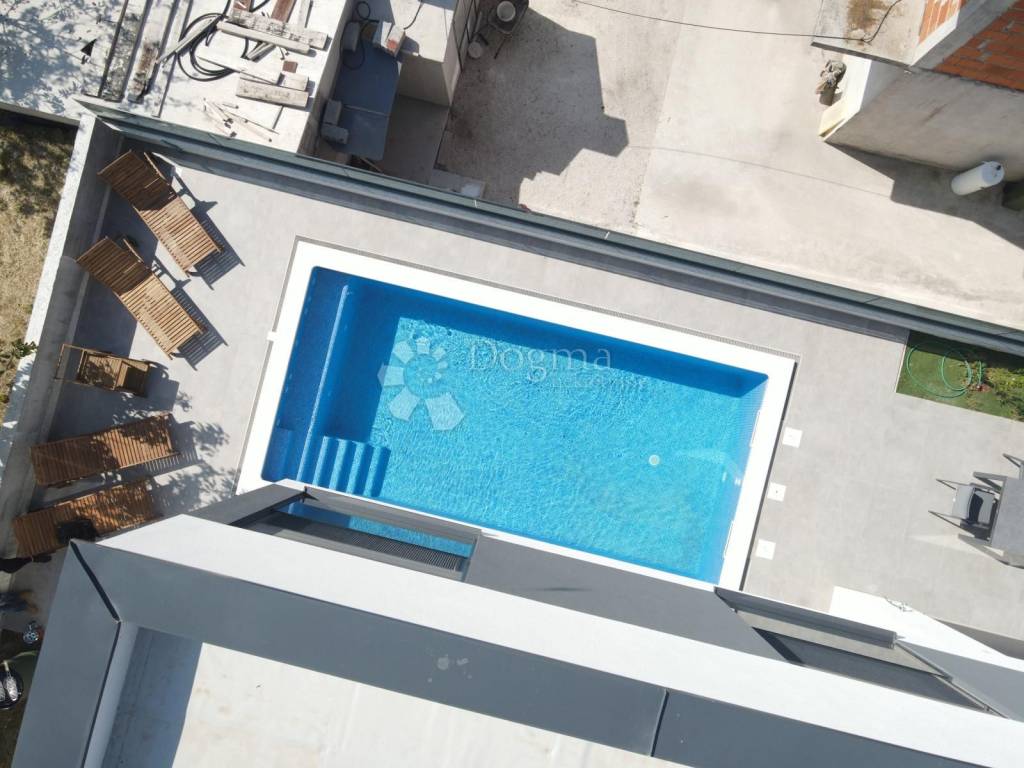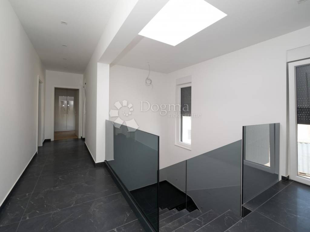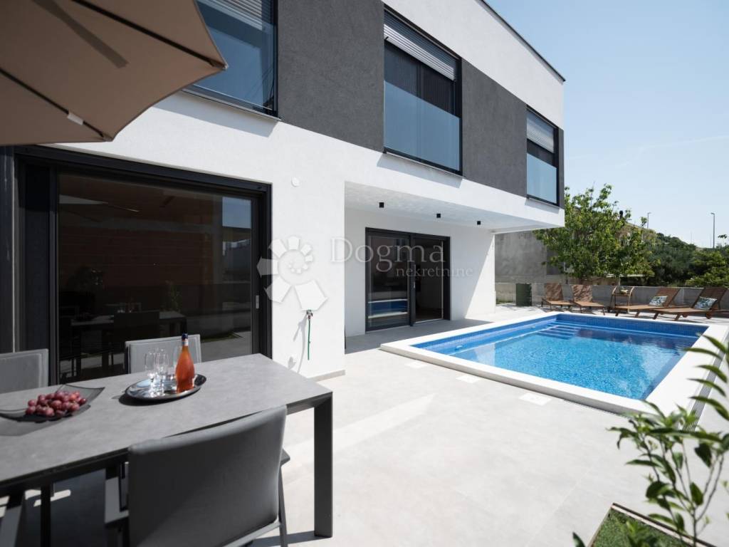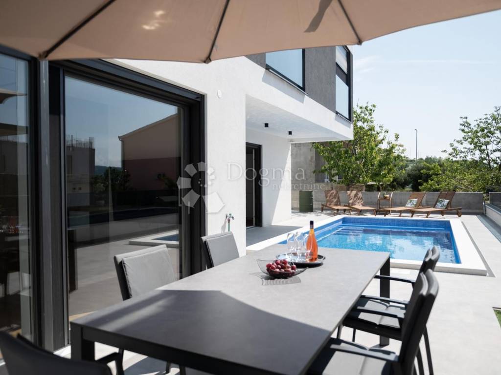 For sale is a luxury villa in Trogir, one of the most beautiful Mediterranean cities, ideal for people looking for high standards and comfort in a peaceful environment. This imposing villa, located on a plot of 510 m2, offers a view of the sea and stands out for its modern design and high-quality materials.