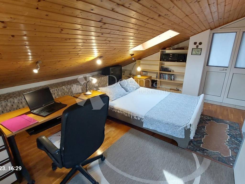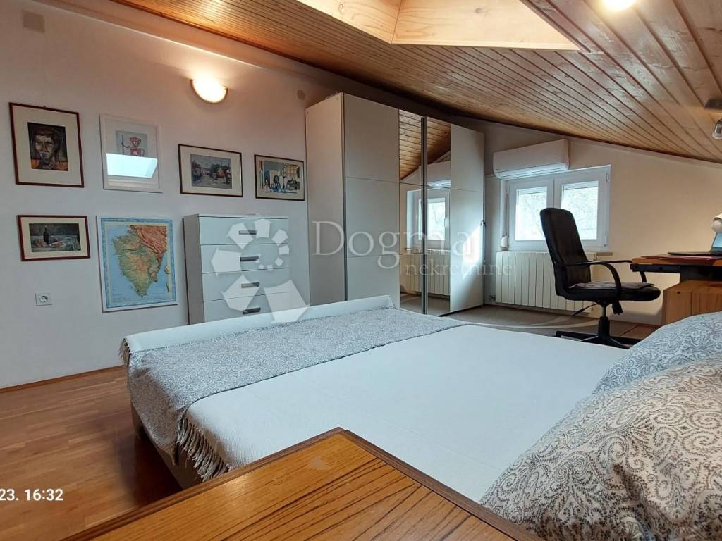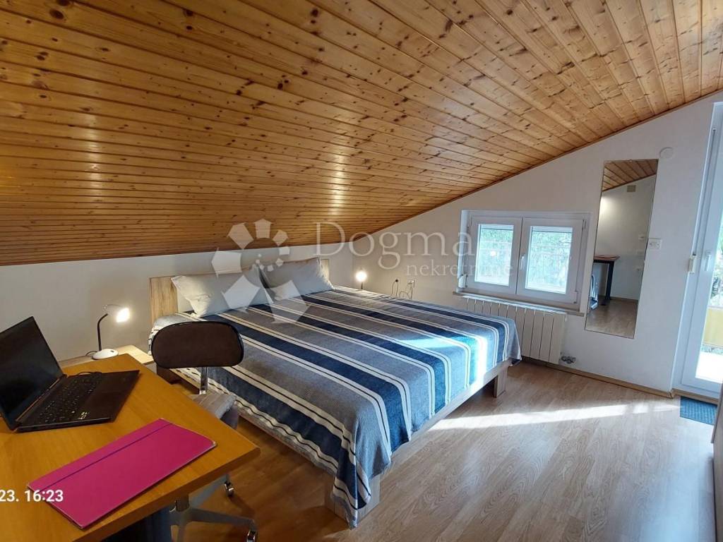 It consists of a living room with a kitchen and a dining room, two bedrooms, a bathroom with a toilet, a corridor, a gallery, a balcony and a terrace on the mansard. The first floor (25 m) is unfurnished, and there is a large living room with a fireplace for which there is already a suitable chimney. The first floor is temporarily used for recreation (table tennis).