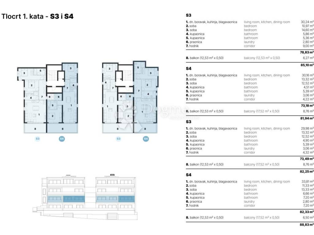 It has a total area of 81.94 m2 and is located on the first floor of the western building. It consists of an entrance hall - 4.22 m2, two bedrooms - 13.32 m2 and 12.52 m2, two bathrooms - 5.39 m2 and 4.51 m2, a utility room - 3.06 m2, a living room with a kitchen and dining area - 30.16 m2, from which you can access a spacious balcony - 17.52 m2 with a stunning open sea view. When purchasing a garage parking space, you can choose your preferred location from the available options.