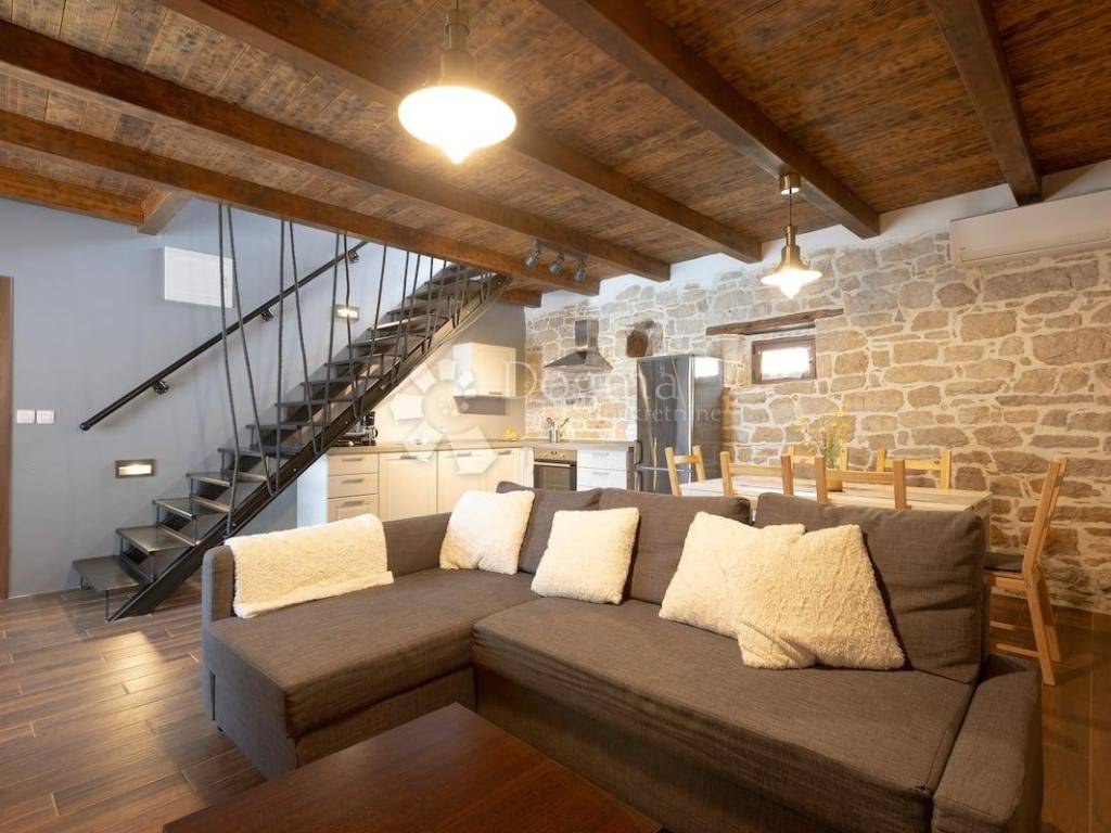 APARTMENT 1 - extends to the ground floor, 1st and 2nd floor. On the ground floor there is a kitchen, a dining room with a living room and a toilet. Iron stairs lead to the 1st floor, where there is one bedroom with a bathroom and a beautiful balcony with a view of the village. On the 2nd floor there are 2 more bedrooms and 1 bathroom.