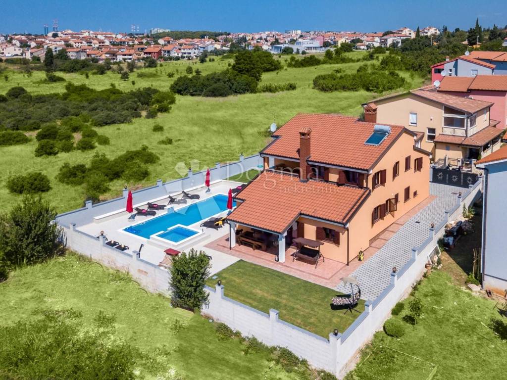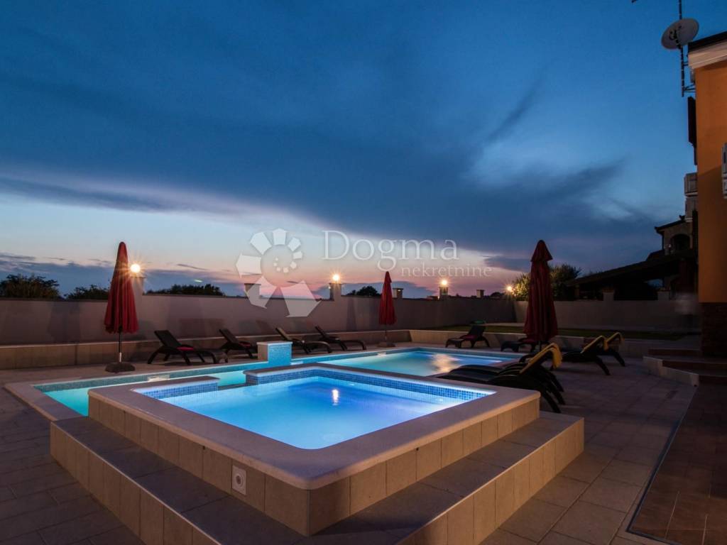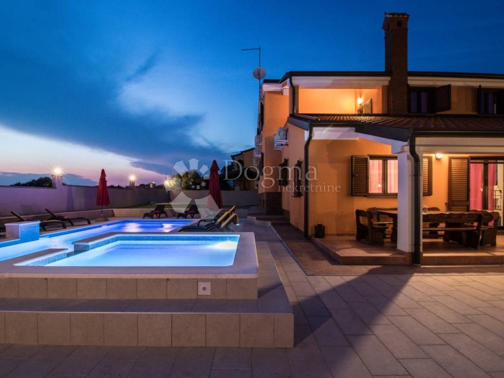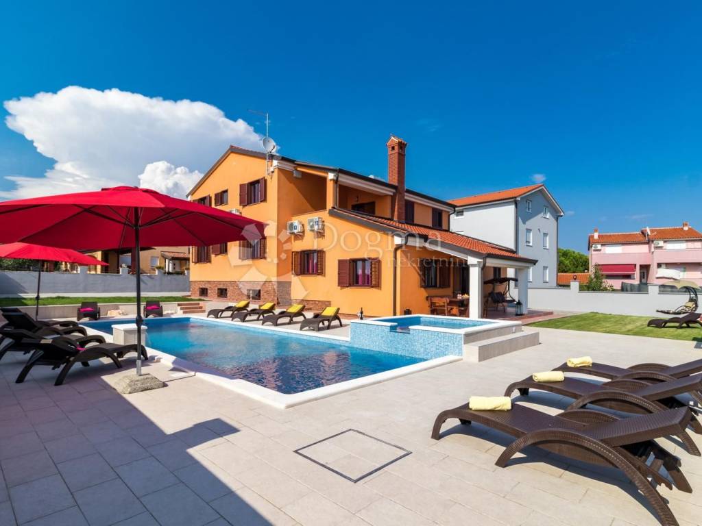 Beautiful and modern house near the center of Pula with a swimming pool and jacuzzi. The total area of the house is 360 m with a garden of 490.00 m, the house consists of a basement, ground floor and 1st floor. In the basement there is a spacious tavern and toilet with accompanying facilities such as a pool table and a socializing room. On the ground floor there is a living room with a dining room and a kitchen with access to a covered terrace, four bedrooms and bathrooms. On the first floor there are three bedrooms as well as a living room, bathroom and kitchen. The house is fully furnished and ready to move in immediately. * 360m2 area * 7 bedrooms * 3 bathrooms * swimming pool * jacuzzi * sold fully furnished Contact info. FILIP CRNJAC +385916001216