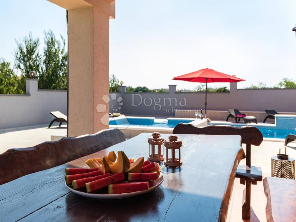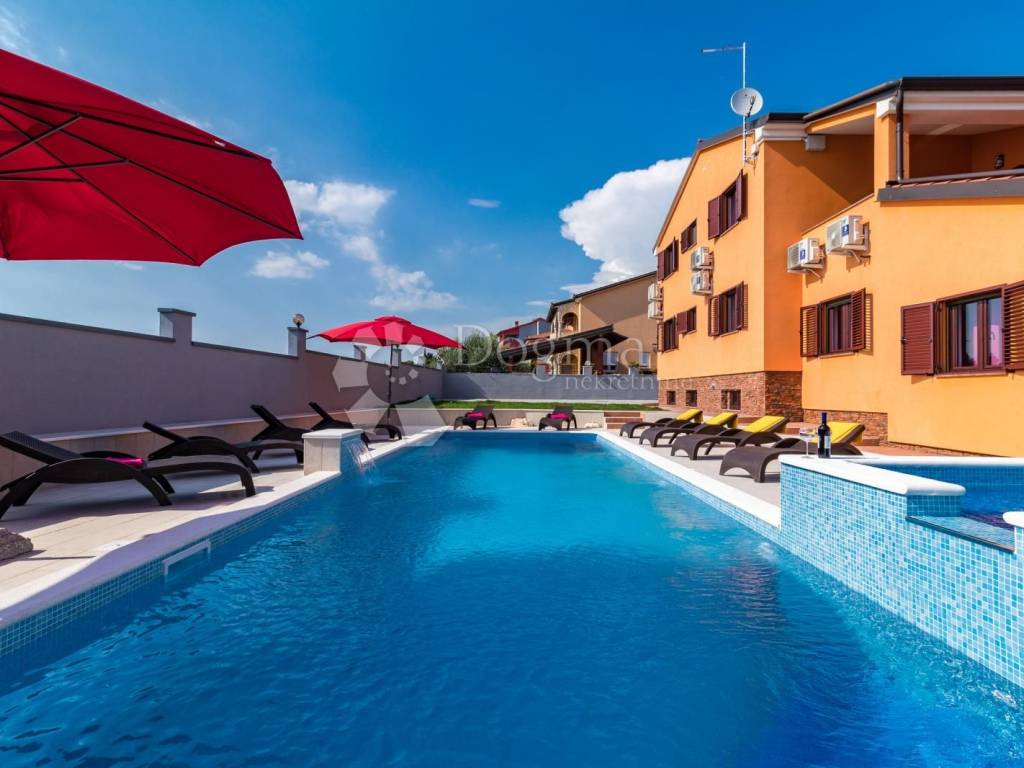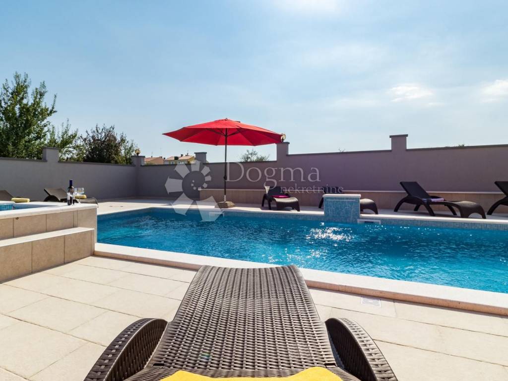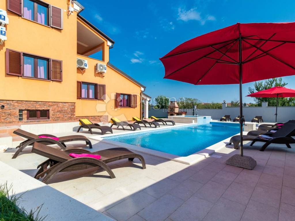 Beautiful and modern house near the center of Pula with a swimming pool and jacuzzi. The total area of the house is 360 m with a garden of 490.00 m, the house consists of a basement, ground floor and 1st floor. In the basement there is a spacious tavern and toilet with accompanying facilities such as a pool table and a socializing room. On the ground floor there is a living room with a dining room and a kitchen with access to a covered terrace, four bedrooms and bathrooms. On the first floor there are three bedrooms as well as a living room, bathroom and kitchen. The house is fully furnished and ready to move in immediately. * 360m2 area * 7 bedrooms * 3 bathrooms * swimming pool * jacuzzi * sold fully furnished Contact info. FILIP CRNJAC +385916001216