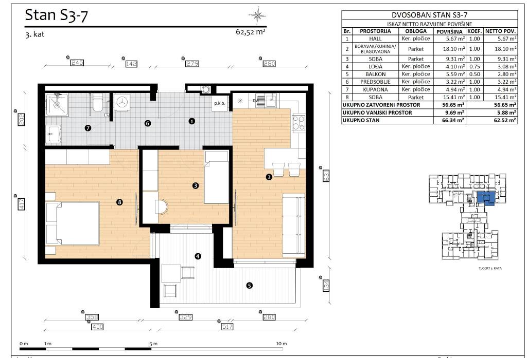 HERITAGE - nova era stanovanja na Trešnjevci Trešnjevka, na atraktivnoj lokaciji gradi se zgrada s ukupno 110 stanova. Savršen spoj udobnosti i luksuza dostupan svima. Planirano useljenje veljača 2027.Stan S3-7 trosoban stan na trećem katu zatvorene površine 56,65 m2 s balkonom 5.59 (2.80) ukupno obračunski NKP 62.52Sastoji se od ulaznog hodnika, dnevnog boravka spojenog s blagovaonicom i kuhinjom, balkona, kupaonice s odvojenim vešerajem, dvije spavaće sobe.Obavezna kupnja parkirnog garažnog mjesta i mogućnost kupnje spremišta.Zgrada će biti izgrađena po visokim standardima:sustav ETICS, završni sloj silikatna žbuka proizvođača ROFIXtoplinska izolacija 15 cm mineralna vuna Rockwoolaluminijske vanjske klupčice u boji stolarijevanjska stolarija PVC s trostrukim IZO staklomtoplinski izolirane aluminijske električne roletekomarnicidizalo KONE za 13 osoba,moderna i luksuzna kabinavideonadzor ulaza u zgradu i garažuunutarnja stolarija visina 220 cm, skriveni panti, magnetska bravaulazna vrata protuprovalna i protudimna, zvučno izoliranapodovi sanitarne prostorije, loggie i kuhinje obloženo keramičkim pločicama I klase, podovi svih ostalih prostorija obloženi sa gotovim višeslojnim hrastovim parketom proizvođača Moparsva sanitarna oprema je visoke kvalitete poznatih svjetskih proizvođača (HANSGROHE, LAUFEN, IDEAL STANDARD)ugradbeni TECE vodokotlićigrijanje i priprema potrošne tople vode preko Vaillant ili Bosch kondenzacijskog plinskog bojlerapodno grijanje svih prostorijatermostati podnog grijanja u svim prostorijamainverter klima uređaj Samsung i ToshibaLokacija u blizini škole, vrtića,Za sve ostake informacije budite slobodni kontaktirati.