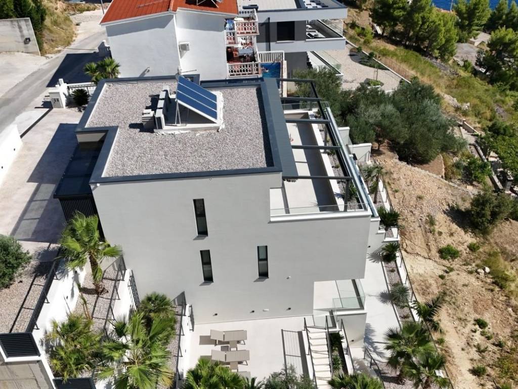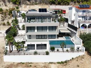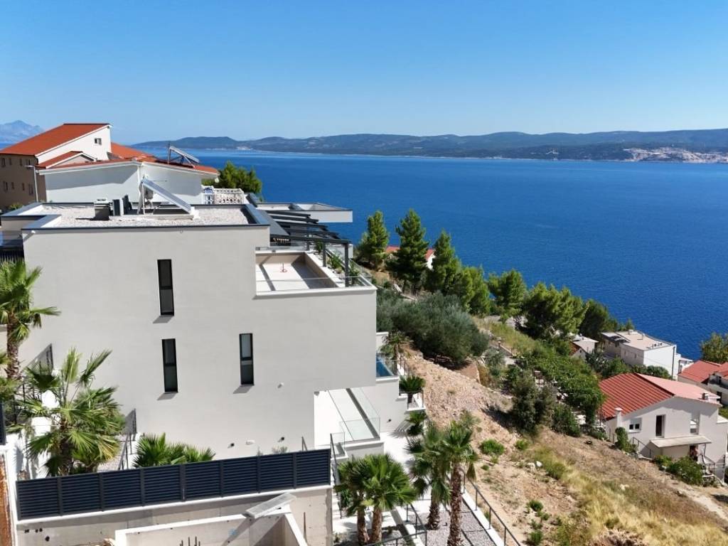 For sale is a luxurious villa with a modern design, located in a quiet village not far from Omiš, only 250 meters from the sea. The villa is built in reinforced concrete construction, with excellent thermal and sound insulation and the use of the highest quality materials. The total area of ​​the land is 600 m², while the living area is 450 m².   The facility consists of several floors with a carefully designed layout. On the top floor there is a master bedroom with a private bathroom and a spacious terrace of 44 m², next to which there is also a double garage inside the building. The first floor includes four bedrooms, each with its own bathroom, and a wardrobe area with an island. The ground floor is designed as an open living room with a kitchen and dining room, from which there is access to a covered terrace and pool. The lower floor offers a space for relaxation with a home cinema, a sauna, a fitness area and a laundry room, and all rooms offer a panoramic view of the sea.   The villa is equipped with a Daikin air conditioning system, underfloor heating in the bathrooms and aluminum joinery. The swimming pool is equipped with heating, electrolysis and counter-current swimming. The property has a garage and parking space and is sold fully furnished and ready to move into.