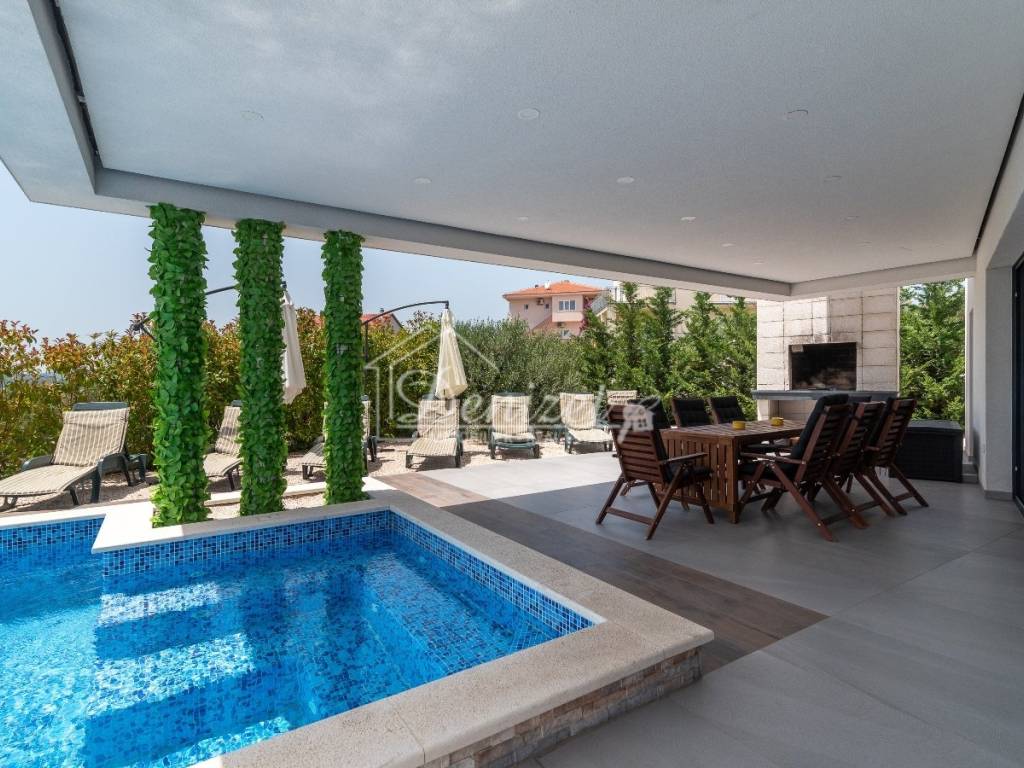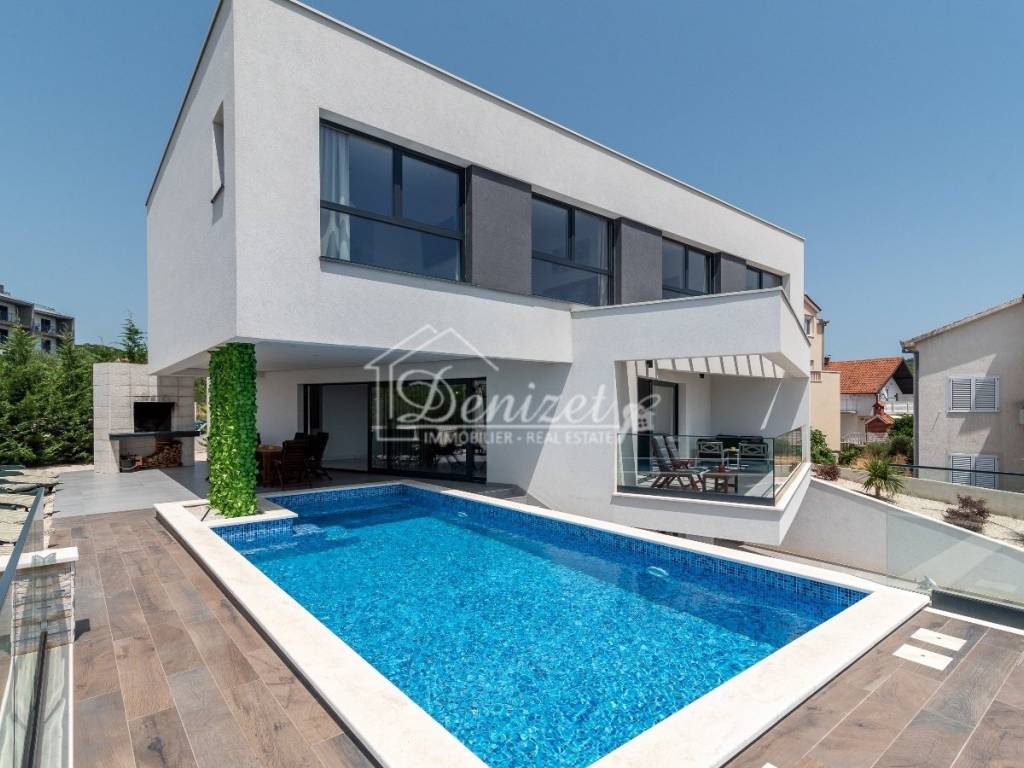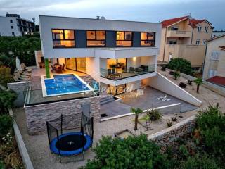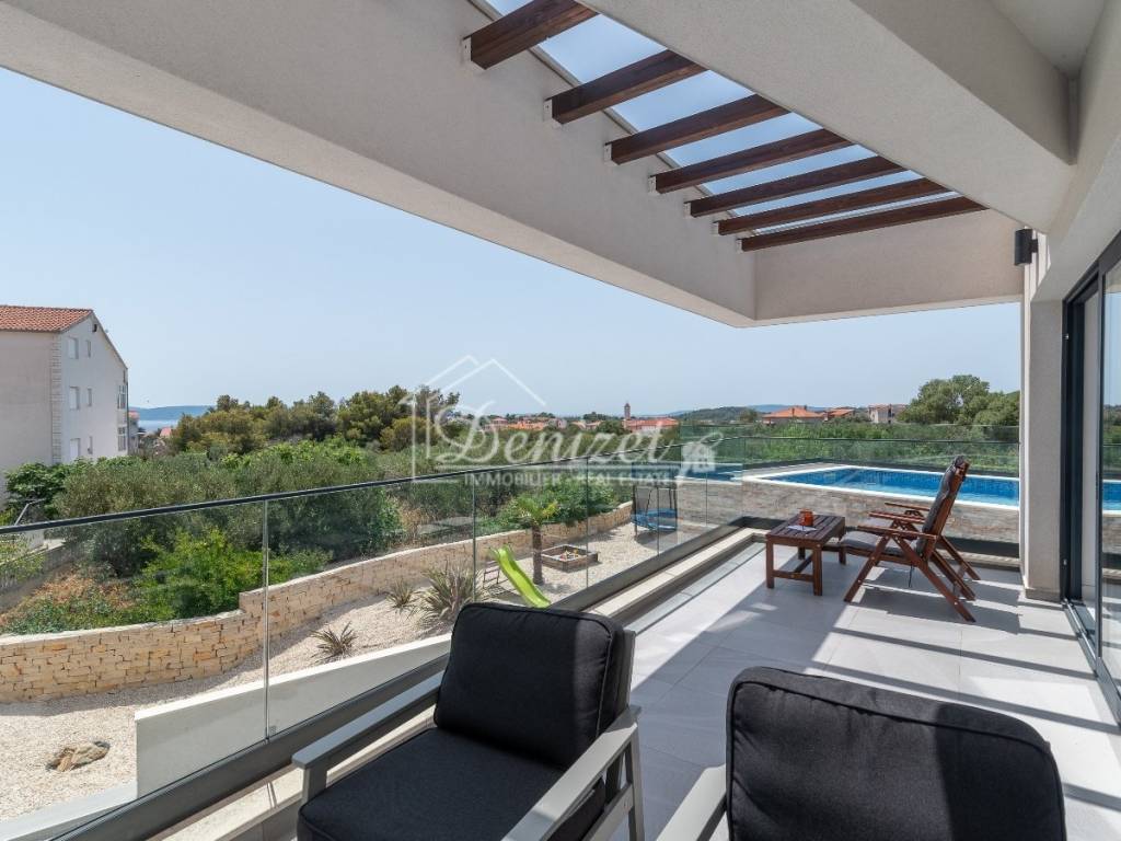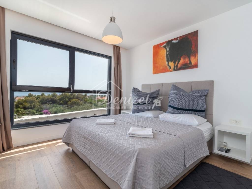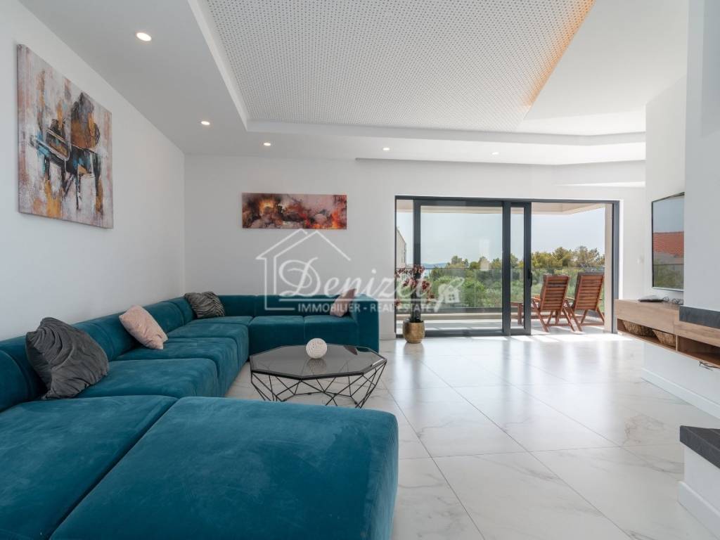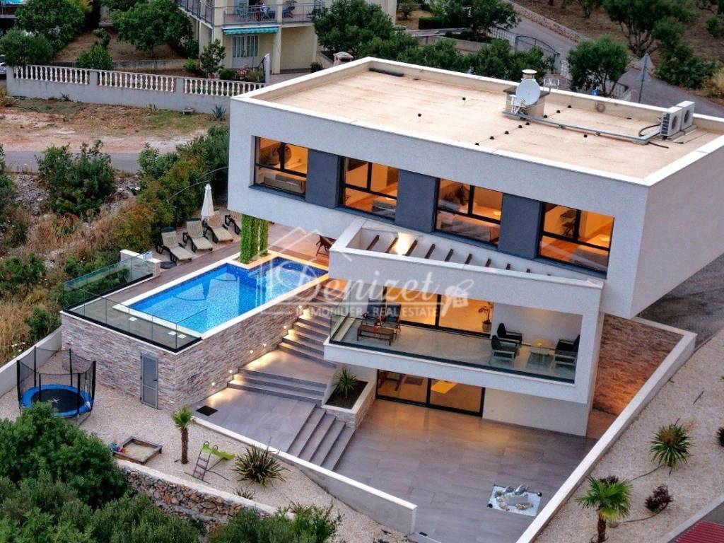 This exceptional, modernly designed villa is located in Okrug Gornji and was completed in 2021. Situated on a 732 m² plot, it boasts 263 m² of living space plus over 100 m² of balconies and terraces spread across three levels. It faces south.