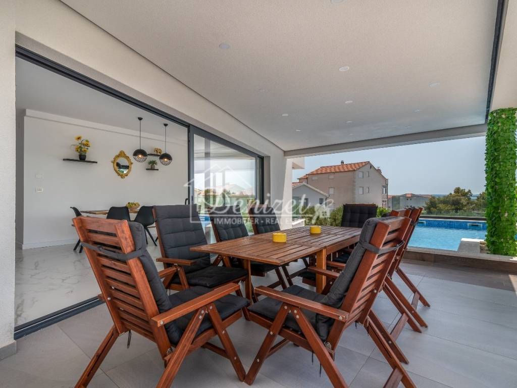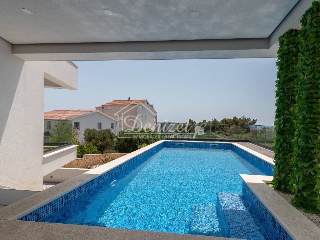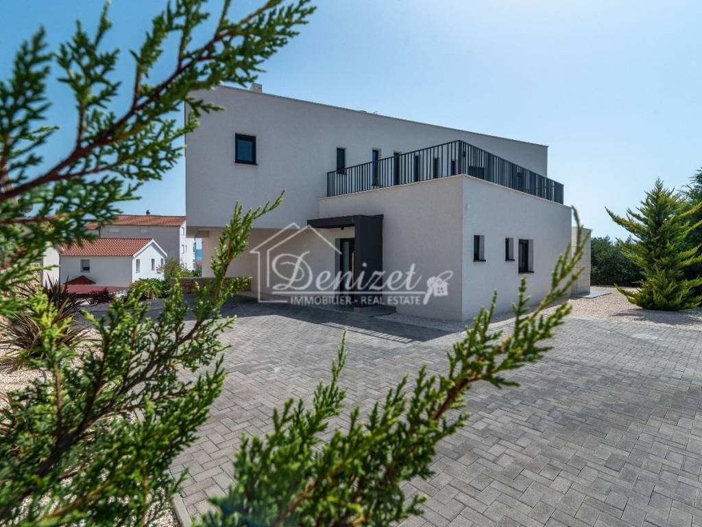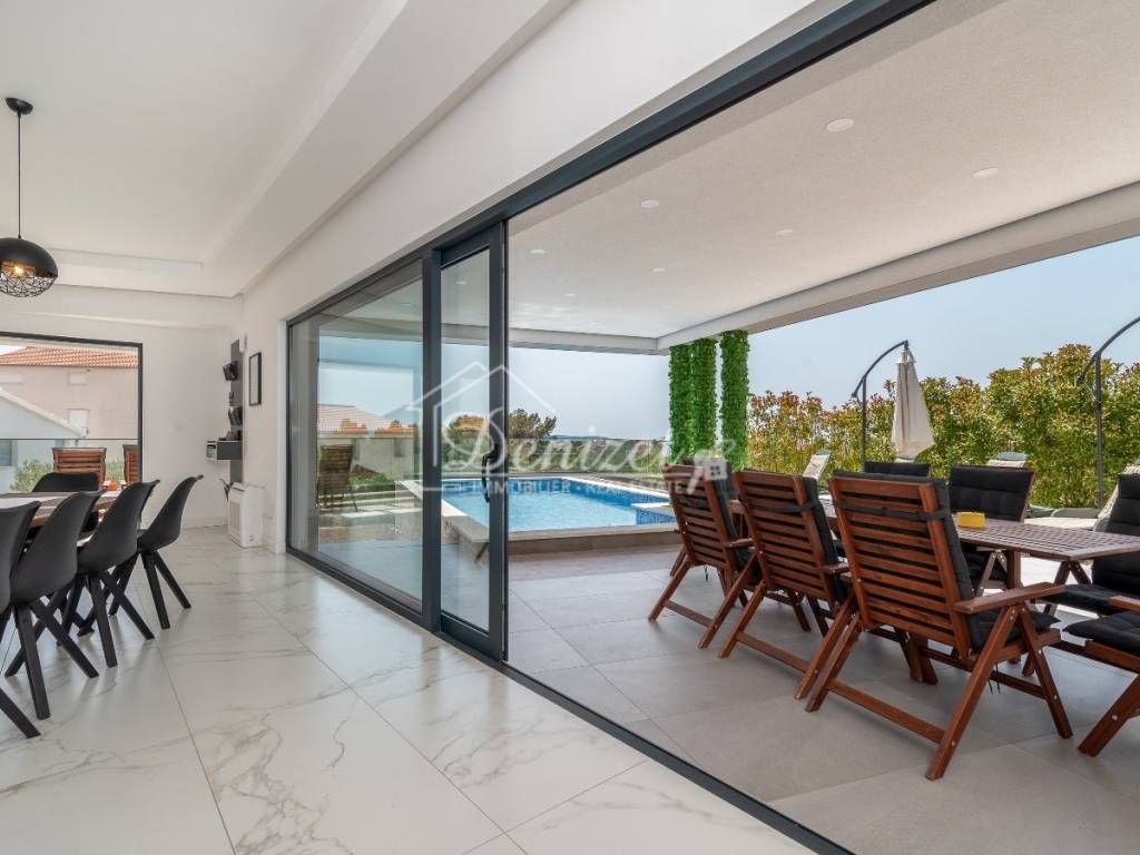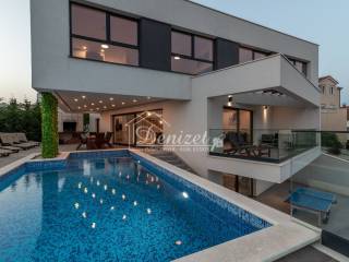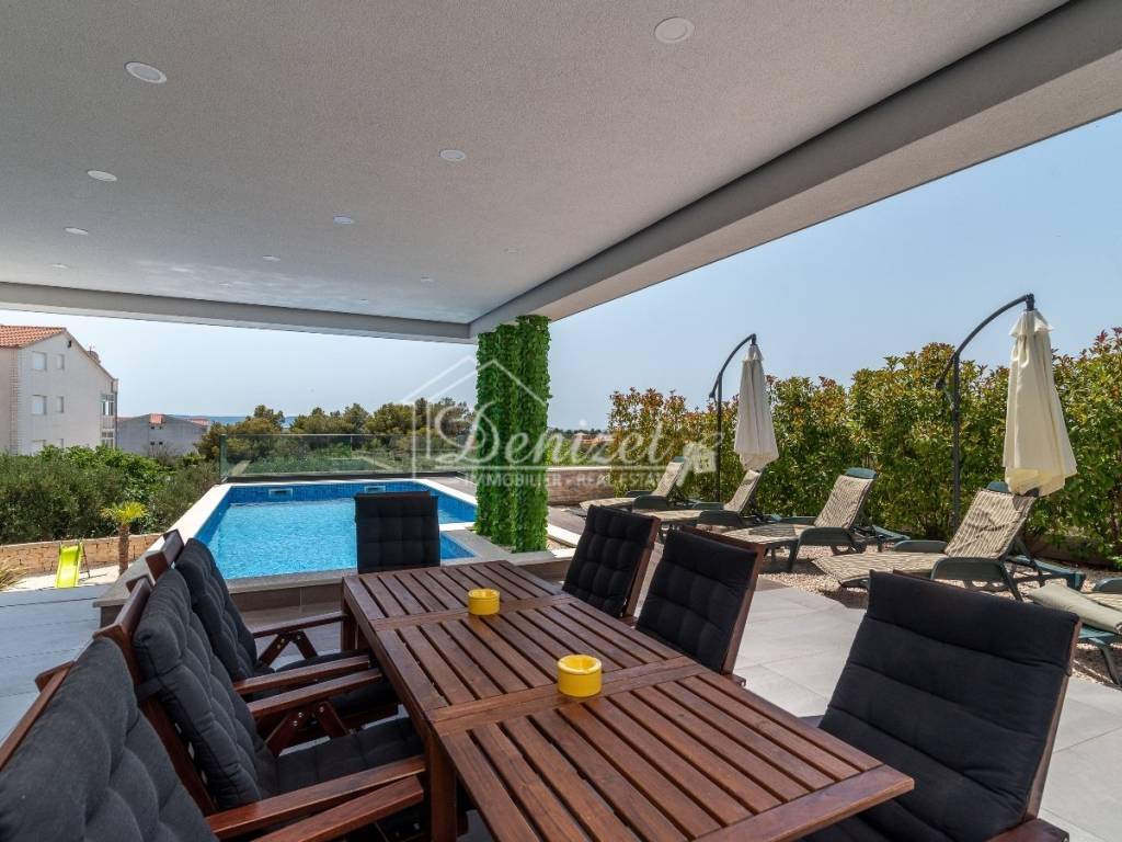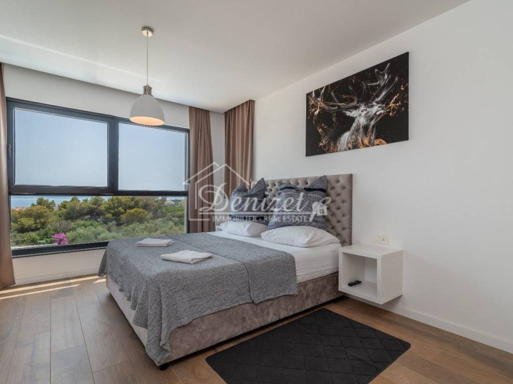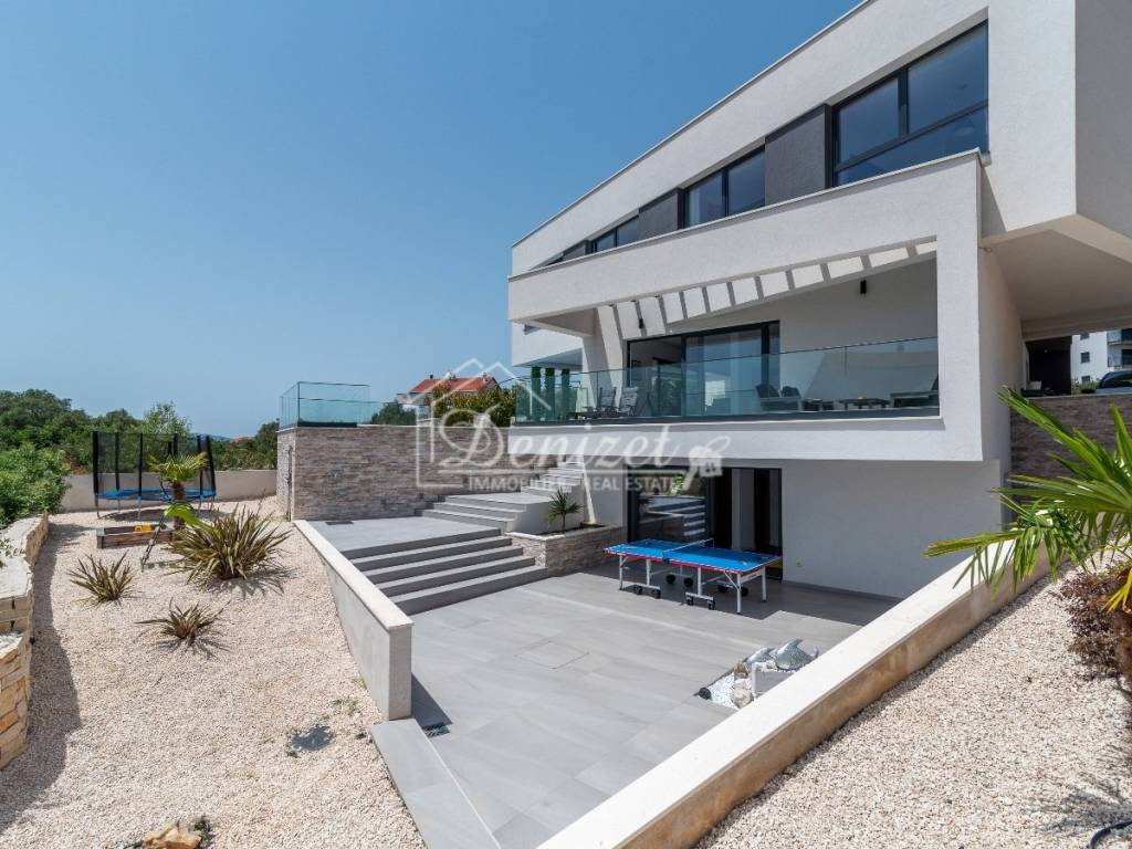 This exceptional, modernly designed villa is located in Okrug Gornji and was completed in 2021. Situated on a 732 m² plot, it boasts 263 m² of living space plus over 100 m² of balconies and terraces spread across three levels. It faces south.