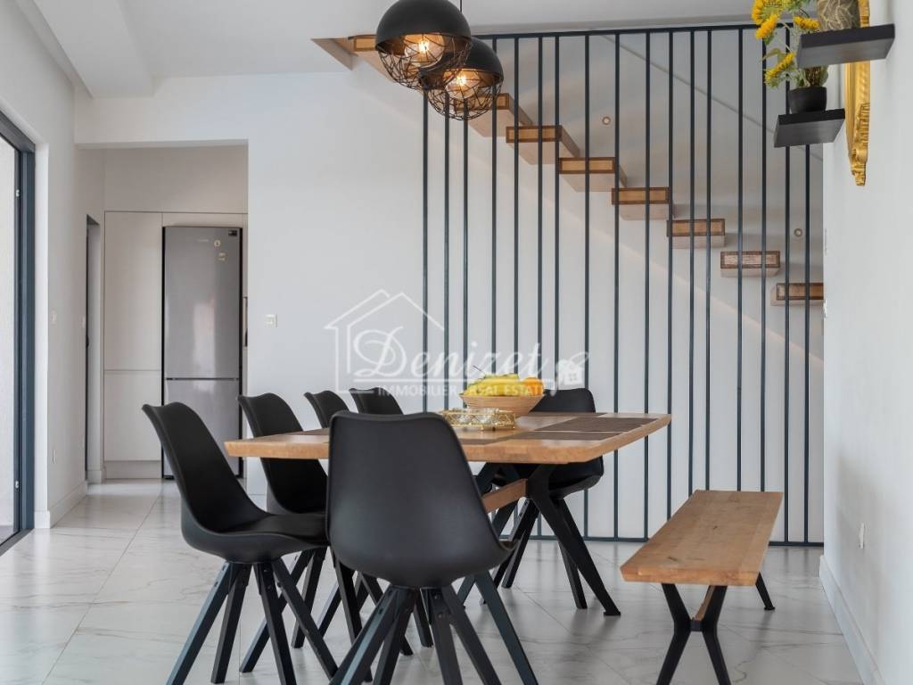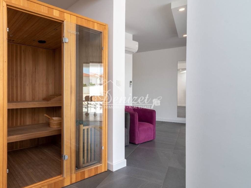 An internal, floating staircase leads to the upper floor, where there are four spacious bedrooms, each with its own bathroom, and an additional 27 m² terrace. Two bedrooms are 16 m², while the third is 21 m² and the fourth 22 m². A small storage room, currently used as a laundry room, is also conveniently located on this floor. The 6 m² en-suite bathrooms on the first floor all feature underfloor heating. All rooms are heated and cooled by air conditioning.