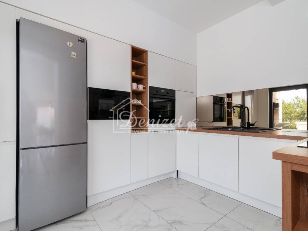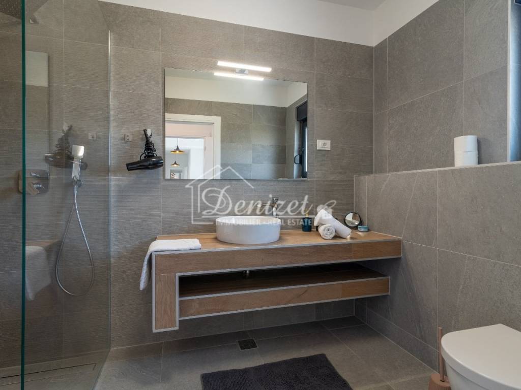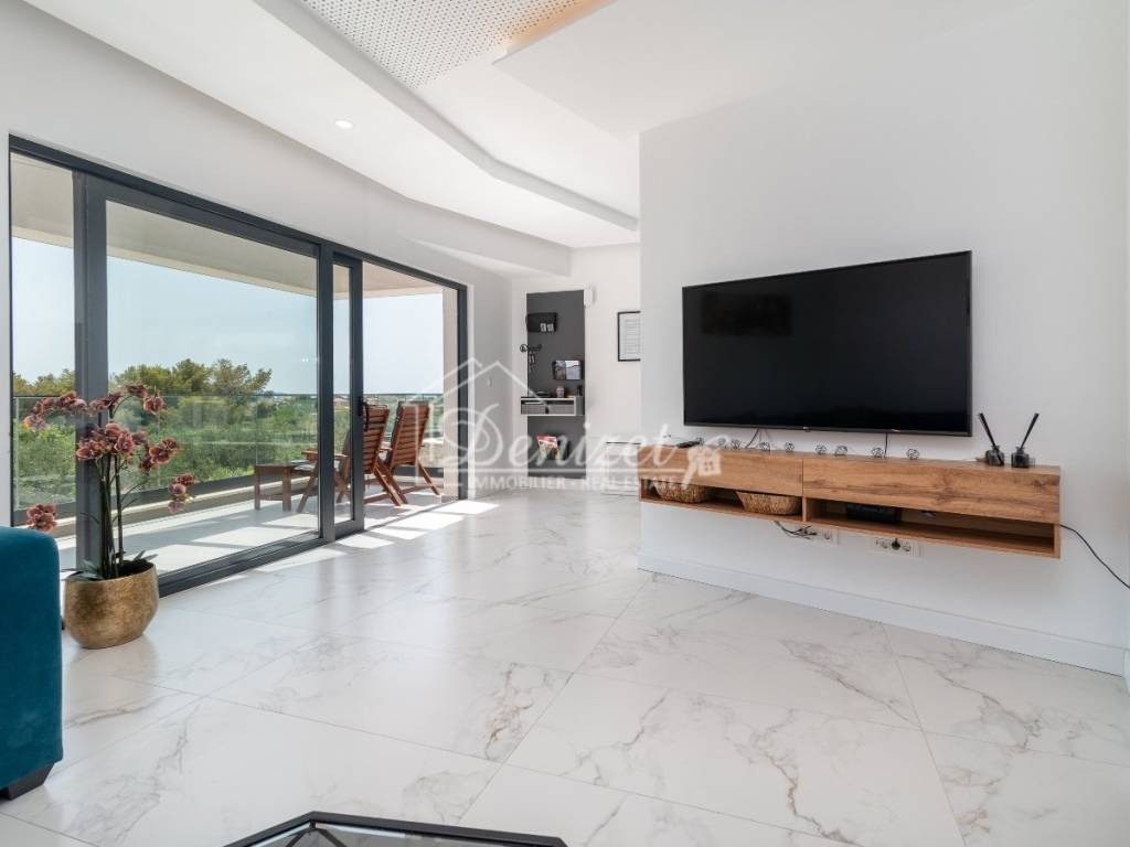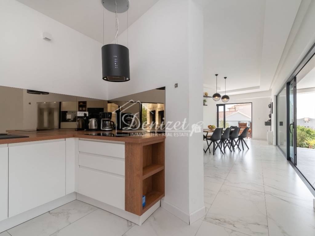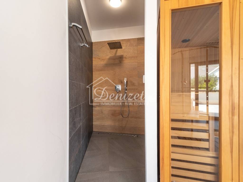 The ground floor features a living area with an open fireplace, as well as a kitchen with a dining area, all arranged in a contemporary open-plan layout across 65 m². There is also an 8 m² children's room with a 4 m² bathroom and a guest WC. Large sliding doors lead to the outdoor dining area with a built-in charcoal grill, where you can enjoy social gatherings year-round by the 33 m² swimming pool. The pool is equipped with massage jets and heated by a heat pump. A 20 m² balcony is accessible from the ground floor. It offers a beautiful view, across the olive trees to the sea.