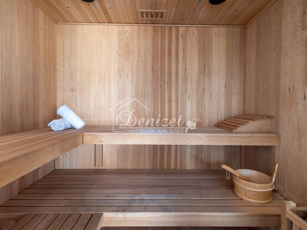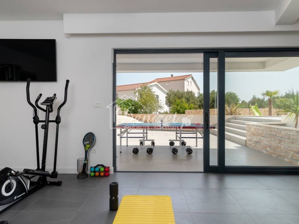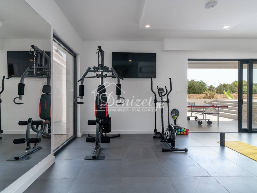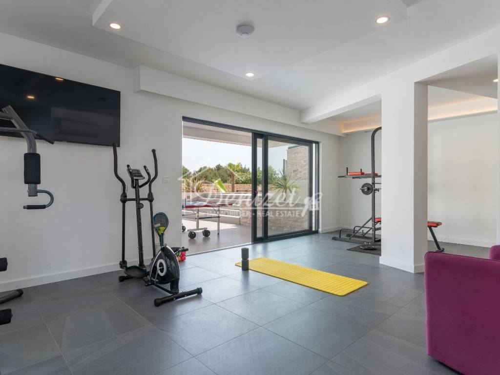 The basement, accessible via internal stairs from the ground floor, houses a 39 m² wellness area with fitness equipment, a sauna, a shower, and a toilet, as well as access to a large terrace. There is also a 6 m² storage room and a 6 m² utility room with a central boiler that supplies hot water to the entire house.