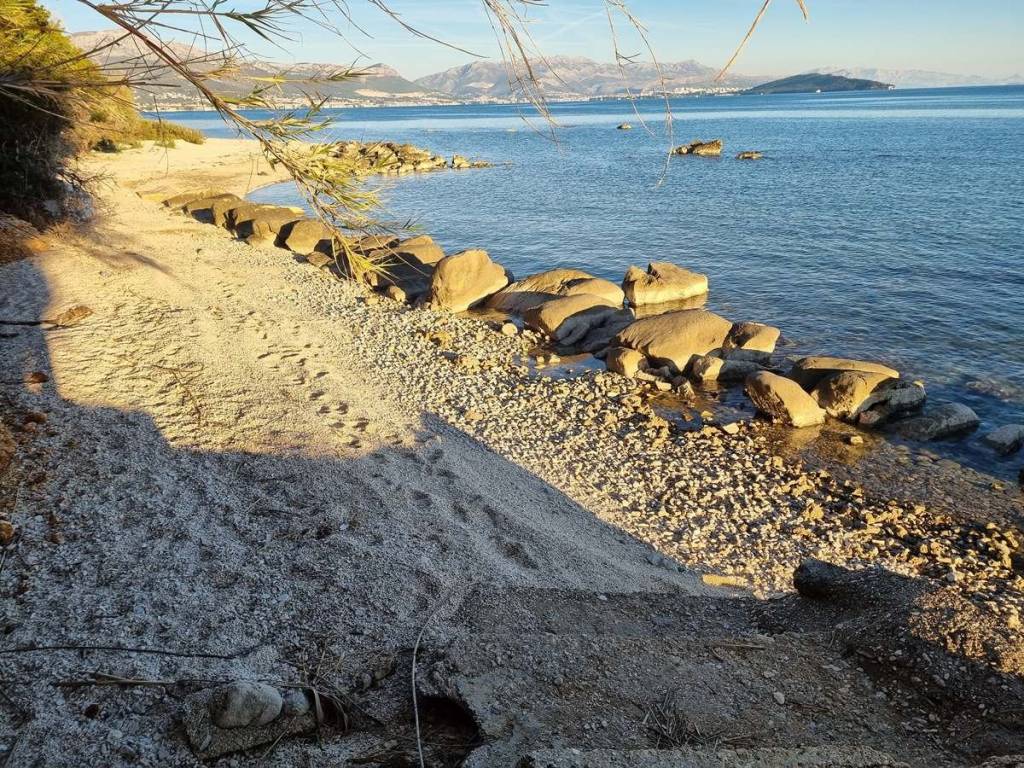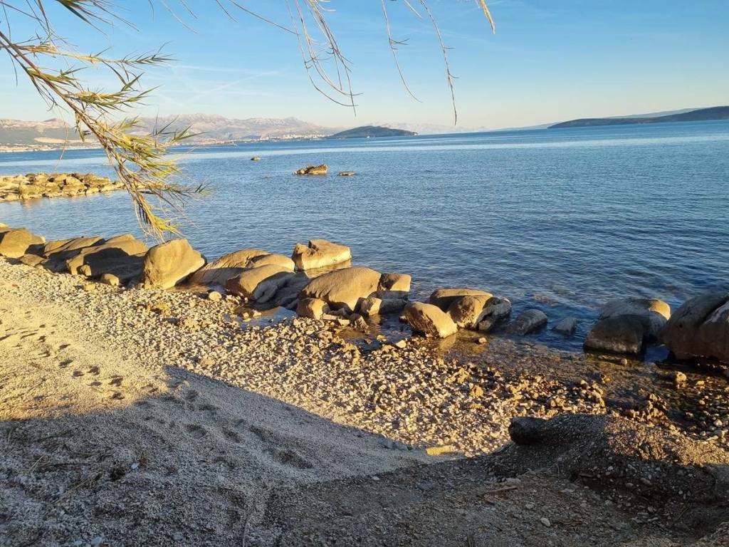 Na prodaju je građevinsko zemljište od 3973 m2 + put od 224 m2, na izvrsnoj lokaciji, u prvom redu do mora uz prekrasnu šljunčanu plažu. Orijentirano je prema jugoistoku, obiluje sunčevom svjetlošću tijekom cijelog dana.  Do parcele vodi asfaltirani pristupni put, a voda i struja su tik uz parcelu. Prednost ovog zemljišta je što je ono u potpunosti ravno i bez nagiba, što omogućuje ekonomičnije i brže izvođenje radova.Zemljište se nalazi u neizgrađenom građevinskom području naselja. Svojim većim dijelom je mješovite namjene – ugostiteljsko turistička i stambena (M5). Malim dijelom, uz obalu ima namjenu rekreacija-kupališta (R3).Moguća je izgradnja stambenih i stambeno poslovnih građevina, te osnovnih i komplementarnih ugostiteljskih, trgovačkih i uslužnih sadržaja, te športskih, rekreacijskih, zabavnih i sličnih prostora.Minimalna površina građevne čestice za stambenu i stambeno poslovnu izgradnju iznosi: za otvoreni tip izgradnje (slobodnostojeća građevina): 500 m2. Minimalna površina građevne čestice na kojoj se planira ugostiteljsko turistička namjena je 700 m2.Maksimalni koeficijent izgrađenosti građevne čestice (nadzemne) je: za otvoreni tip izgradnje na zemljištu površine od 750 m2 i više, iznosi 0.3. Maksimalna katnost: prizemlje + kat.Najmanje 30% površine građevne čestice je potrebno urediti kao zelenu površinu.U smislu zakona o prostornom uređenju, ne postoji obveza donošenja urbanističkog plana, što znači da se na zemljištu može odmah pristupiti predavanju zahtjeva za građevinsku dozvolu.Nekretnina je udaljena svega 600 m od zračne luke Split, 5 km od centra grada Trogira i 20 km do grada Splita.
