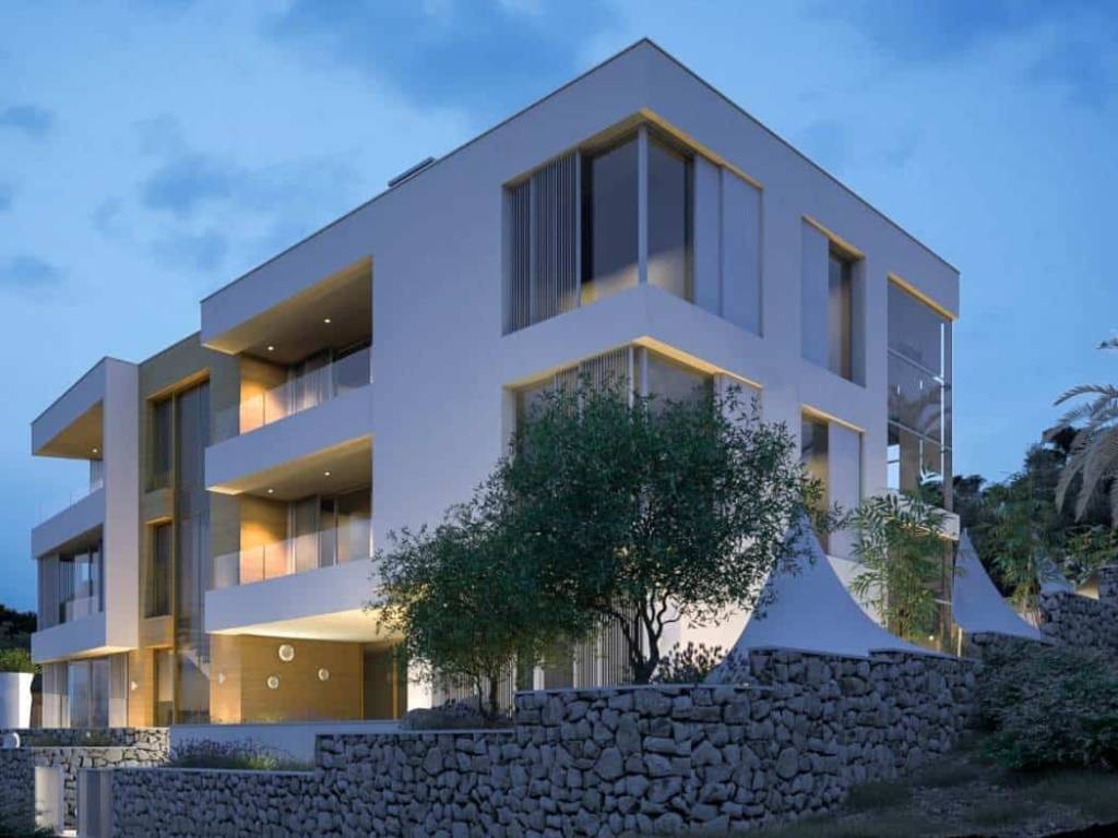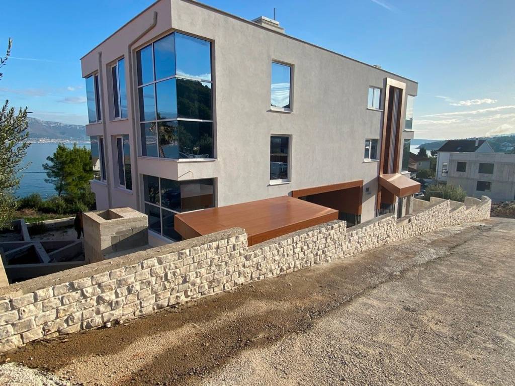 This villa with a total of 550 m2 of living space, spread over four floors, is located on a 530 m2 plot.The apartment S1 has 180 m2 of living space. On the ground floor there is a 55 m2 living room with kitchen and dining area, a guest toilet and access to the 16 m2 terrace that leads to the 30 m2 pool. On the 1st floor there are two bedrooms with private bathrooms. On the 2nd floor there is another bedroom with its own bathroom, as well as a 20 m2 terrace with wonderful sea views. The floors are connected via a floating staircase in an atrium.Apartment S2 and Apartment S3 are identical in terms of layout: 63 m2 of living space, each with two bedrooms with their own bathroom and a guest toilet, as well as a kitchen with living and dining area and access to the 8 m2 covered balcony.On the ground floor, next to the access to apartments S2 and S3, there is a 23 m2 wellness area with a brick jacuzzi and a sauna.The house also includes an outdoor grill.The house has five underground parking spaces. A 20 m2 fitness room and a laundry room were also planned in the underground car park.There is the possibility of purchasing a small plot of land 50 m from the house, directly by the sea, where a pergola and loungers could be set up.The villa is still under construction and is sold as it appears in the current photos. It offers future owners the opportunity to realize their own living dreams.The villa faces north-east.Distances: Trogir old town: 6 km, Split airport: 10 km, beach: 100m, supermarket: 350m.