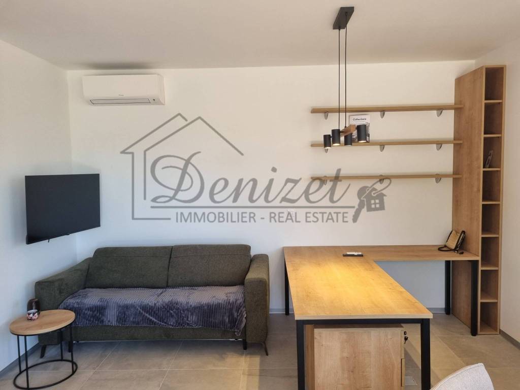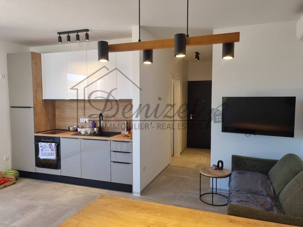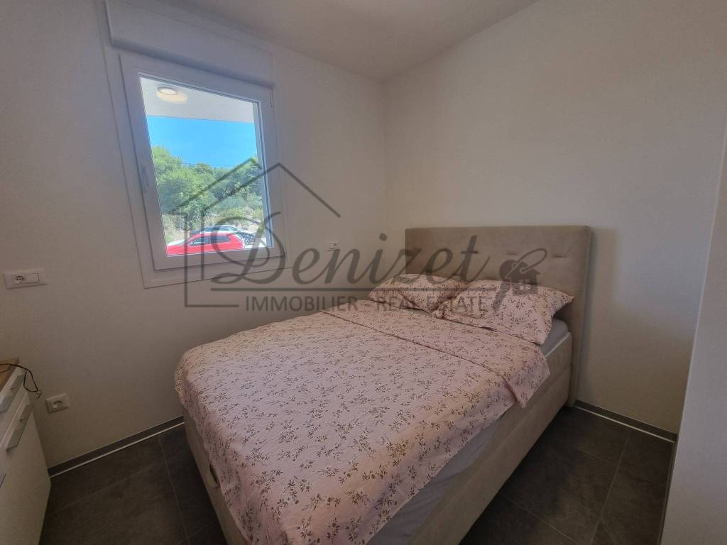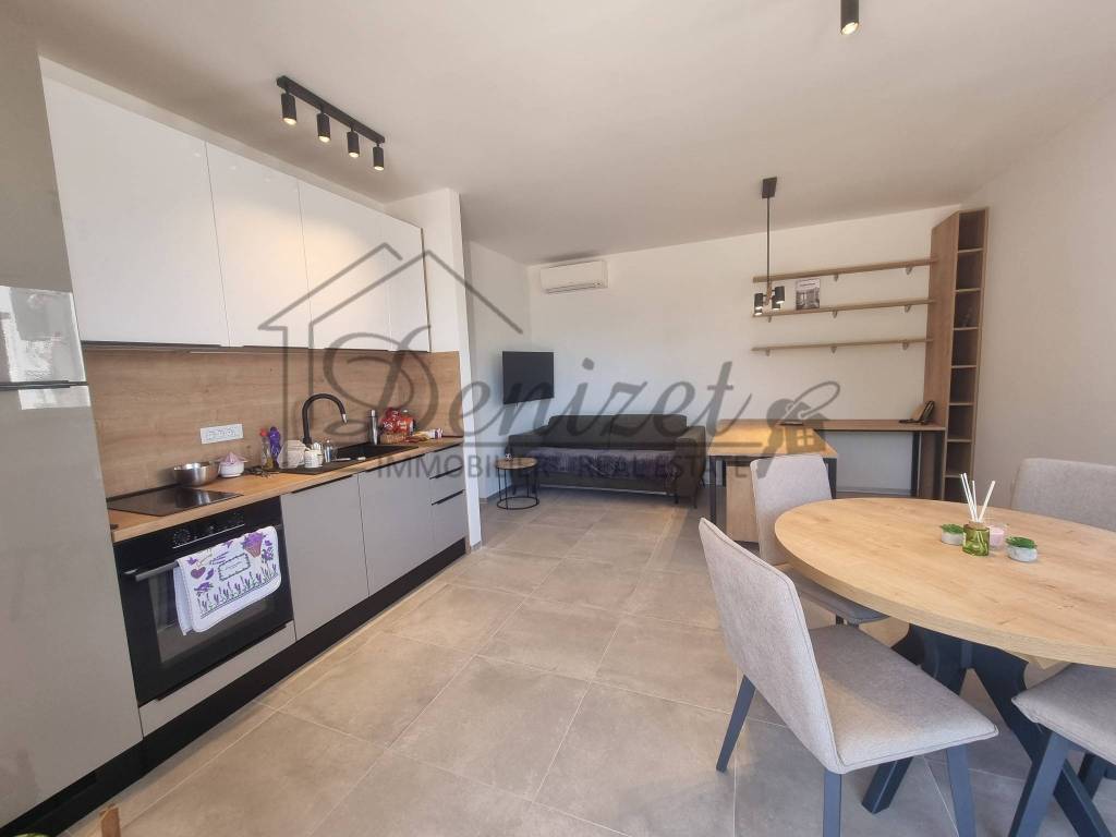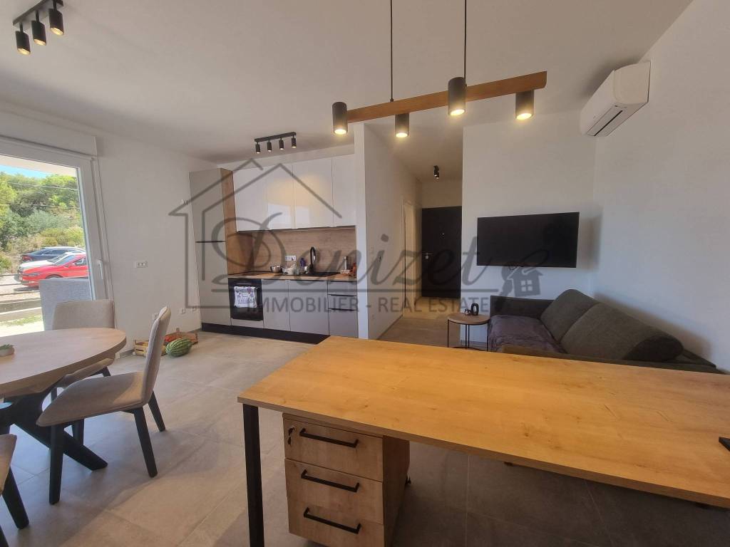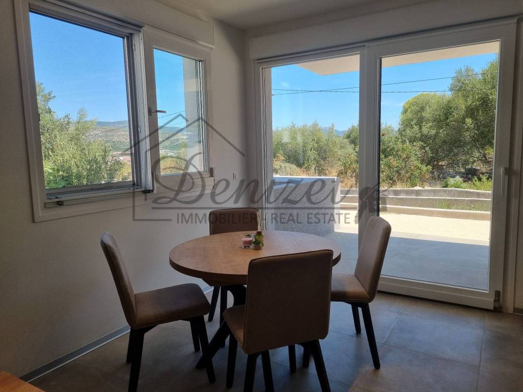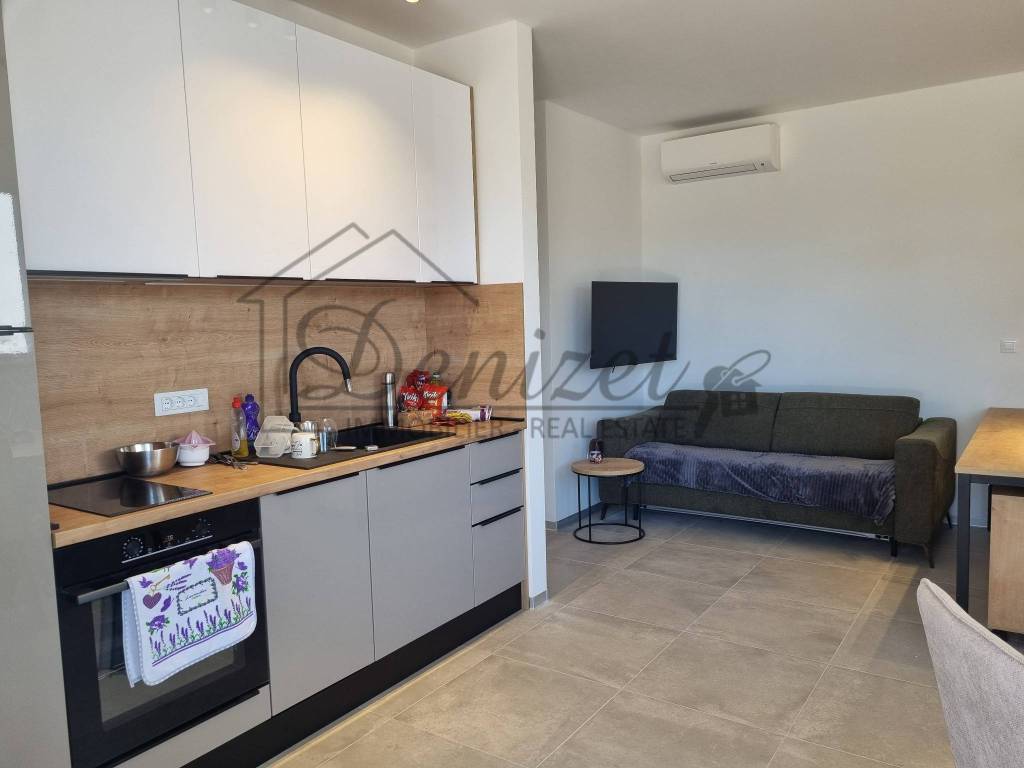 One-bedroom apartment in a modern new building in Trogir is for sale. The building is a semi-detached in nature and has a total of 11 apartments spread over four floors: basement, ground floor, first and second floor. The apartment for sale is located on the ground floor of the building. The apartment has an internal living area of 38 m2. It consists of a living room, kitchen, dining room, one bedroom and a bathroom. There is an exit to the terrace from the living room. The apartment has one outdoor parking space. It is selling fully furnished and equipped. It is air-conditioned and also has underfloor heating. The building was built with the highest quality materials and equipped with top-quality equipment. It has an elevator that connects all floors of the building. The building is in an excellent location, 10 minutes walking distance from the sea and beach, but also from the city center of Trogir. The distance from Split airport is 7 km, and from the center of Split is 28 km.