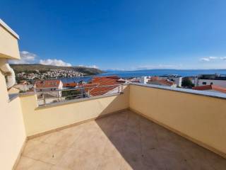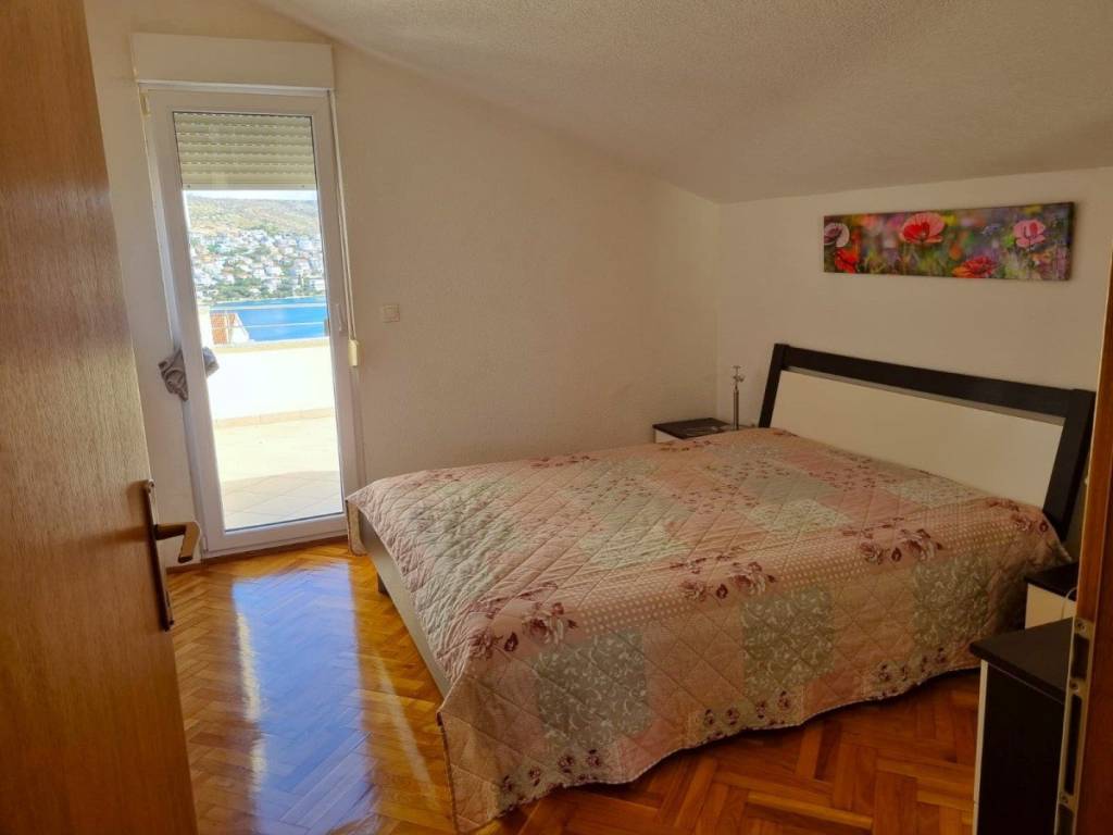 The apartment is located on the top floor of a building that has a total of eleven residential units spread over five floors (basement+ground floor+2 floors+attic). The apartment contains: hallway, separate toilet, bathroom, two bedrooms, living room with kitchen. Total living area 63 m2 + belonging parts of the apartment balcony of 2.97 m2 and loggia of 6.60 m2. The living room and the large bedroom have an exit to the loggia with beautiful sea view, while the smaller bedroom has an exit to the balcony, which also offers a nice sea view. The apartment is air-conditioned, furnished and is being sold as such. The distance from the sea is 400 m, from the city of Trogir is 4 km, from the airport Split 7 km .