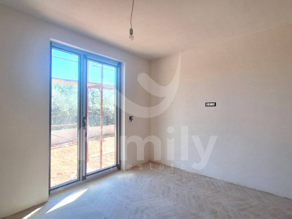 It is in Banjole, in a very quiet location, that the aforementioned modern and high-quality new construction of a small residential building by a proven investor with a total of 8 residential units is located. The aforementioned apartment of 59.10 m2 is located on the ground floor and consists of an entrance hall equipped with a burglar-proof entrance door, one bright and comfortable bedroom with access to a terrace and garden, a spacious living room connected to an open space concept kitchen and access to a terrace and garden of 5.12 m2, as well as a bathroom equipped with a Geberit built-in cistern, a walk-in shower, installed installations for a washing machine, an Ariston boiler and a ventilation system. The floors throughout the apartment are covered with high-quality ceramics, and the bedroom has Sherborne wood-imitation ceramics. The heating and cooling system is regulated by two Mitsubishi air conditioning units, one unit installed in the bedroom and one in the living room, and electric underfloor heating has also been implemented throughout the building with separate Wi-Fi thermostats in each room. PVC joinery with triple-glazed anthracite glass and aluminum roller shutters with electric lifts have been installed, and an anthracite-colored aluminum garden fence will also be installed. The building is equipped with an 8 cm thick thermal facade on the ground floor, with 2 cm thick Travertino classico stone also installed, which certainly contributes to excellent thermal and sound insulation. The apartment has one uncovered parking space as well as one shared toilet located in the hallway of the building, which will be co-owned by all co-tenants, and the work is scheduled to be completed by the end of 2025.