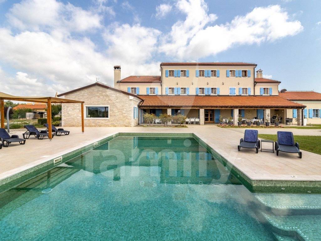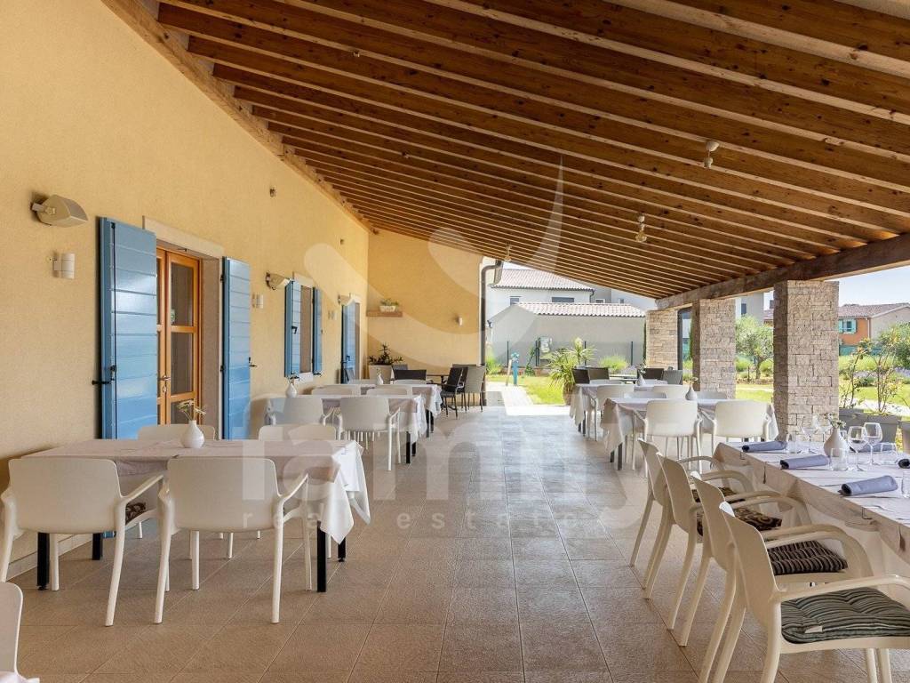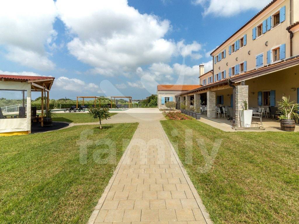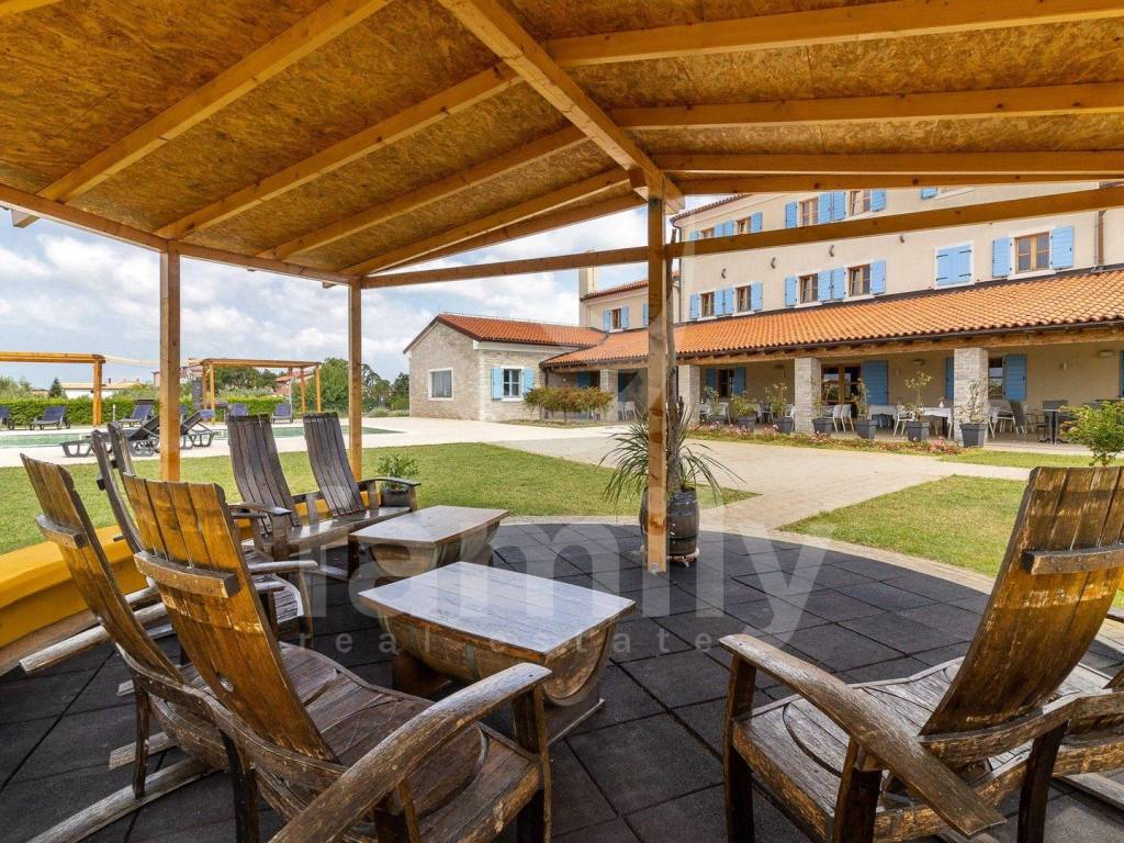 Upravo u jednom naselju nedaleko od Ližnjana nalazi se ovaj hotel s četiri zvjezdice talijanskog dizajna ukupne površine 866 m2 na okućnici površine 5900 m2 i prostire se na četiri etaže. U podrumu poslovne zgrade nalazi se uređena i opremljena degustacijska sala, prostorija površine 100 m2 koja je trenutno u namjeni skladišta te ima sprovedene sve neophodne instalacije za prenamjenu u wellness zonu i prostorija za upravljanje pametnim sustavom hotela. Prizemlje ovo predivnog hotela izvedeno je bez barijera te prilagođena osobama sa posebnim potrebama i u prizemlju se nalazi dvorana za sastanka ili konferencijska sala površine 90 m2 kapaciteta za 60 do 70 osoba i opremljena je audio vizualnom opremom sa zastorima za zamračivanje, prostor za odlaganje garderobe, recepcija, ured, dva muška i dva ženska toaleta, praona sa aparatima za pranje i sušenje rublja i sve neophodno za odlaganje istog, ugradbeni ormari za odlaganje kaputa/jakni, ugrađeno dizalo sa 4 stanice, aperitiv bar u kojem su zidovi obloženi prekrasnim istarskim kamenom, prostrani restoran kapaciteta za 80 osoba opremljen multifunkcionalnim namještajem i modernim kaminom u središtu restorana, prostrana kuhinje površine 100 m2 koja je u potpunosti usklađena HACCP pravilima i opremljena je vrhunskim aparatima te također ima izdvojeni dio slastičarnice, skladnišni prostor sa komorom, sanitarni čvor za osoblje i tuševe, dok se između restorana i kuhinje nalazi dio za pripremu serviranja i posluživanja. Prizemlje ove poslovne zgrade dodatno krasi prelijepa, potpuno natkrivena terasa fiksnim krovom sa crijepovima, dok je ispod krovišta izvedena podloga pločama i drvenim gredama za potpuni ugođaj na njoj. Sa terase se proteže predivan pogled na bazen i pomno održavanu okućnicu hotela.