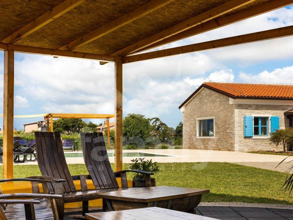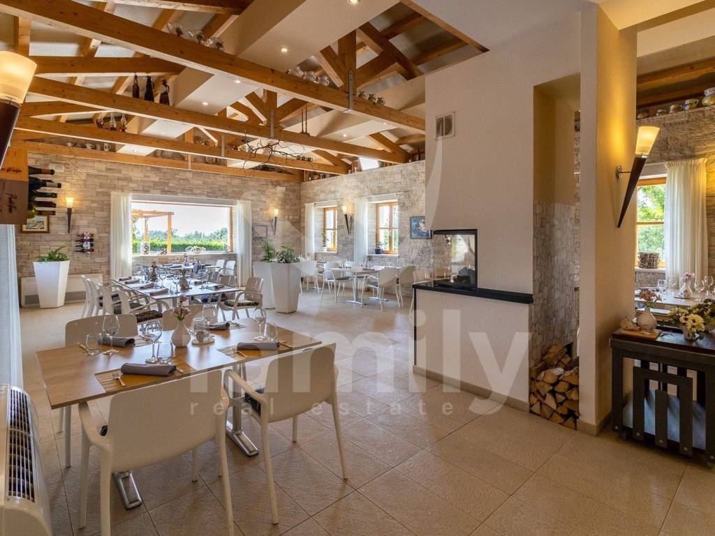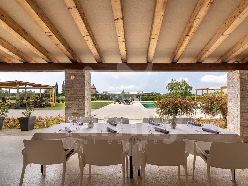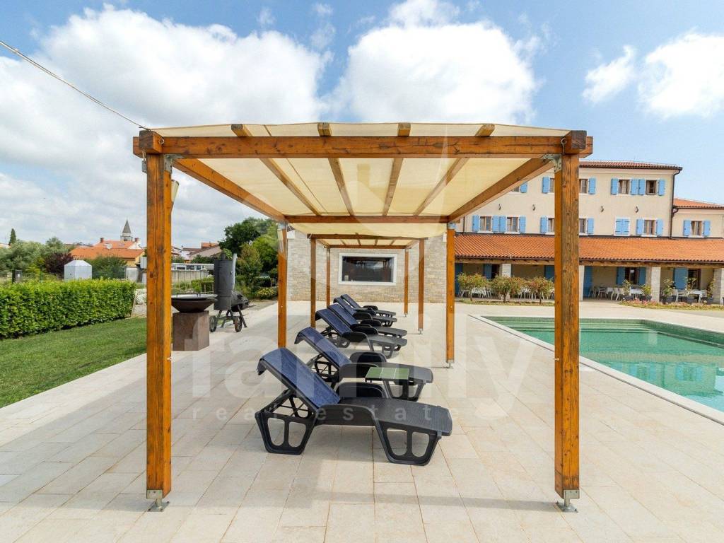Upravo u jednom naselju nedaleko od Ližnjana nalazi se ovaj hotel s četiri zvjezdice talijanskog dizajna ukupne površine 866 m2 na okućnici površine 5900 m2 i prostire se na četiri etaže. U podrumu poslovne zgrade nalazi se uređena i opremljena degustacijska sala, prostorija površine 100 m2 koja je trenutno u namjeni skladišta te ima sprovedene sve neophodne instalacije za prenamjenu u wellness zonu i prostorija za upravljanje pametnim sustavom hotela. Prizemlje ovo predivnog hotela izvedeno je bez barijera te prilagođena osobama sa posebnim potrebama i u prizemlju se nalazi dvorana za sastanka ili konferencijska sala površine 90 m2 kapaciteta za 60 do 70 osoba i opremljena je audio vizualnom opremom sa zastorima za zamračivanje, prostor za odlaganje garderobe, recepcija, ured, dva muška i dva ženska toaleta, praona sa aparatima za pranje i sušenje rublja i sve neophodno za odlaganje istog, ugradbeni ormari za odlaganje kaputa/jakni, ugrađeno dizalo sa 4 stanice, aperitiv bar u kojem su zidovi obloženi prekrasnim istarskim kamenom, prostrani restoran kapaciteta za 80 osoba opremljen multifunkcionalnim namještajem i modernim kaminom u središtu restorana, prostrana kuhinje površine 100 m2 koja je u potpunosti usklađena HACCP pravilima i opremljena je vrhunskim aparatima te također ima izdvojeni dio slastičarnice, skladnišni prostor sa komorom, sanitarni čvor za osoblje i tuševe, dok se između restorana i kuhinje nalazi dio za pripremu serviranja i posluživanja. Prizemlje ove poslovne zgrade dodatno krasi prelijepa, potpuno natkrivena terasa fiksnim krovom sa crijepovima, dok je ispod krovišta izvedena podloga pločama i drvenim gredama za potpuni ugođaj na njoj. Sa terase se proteže predivan pogled na bazen i pomno održavanu okućnicu hotela.