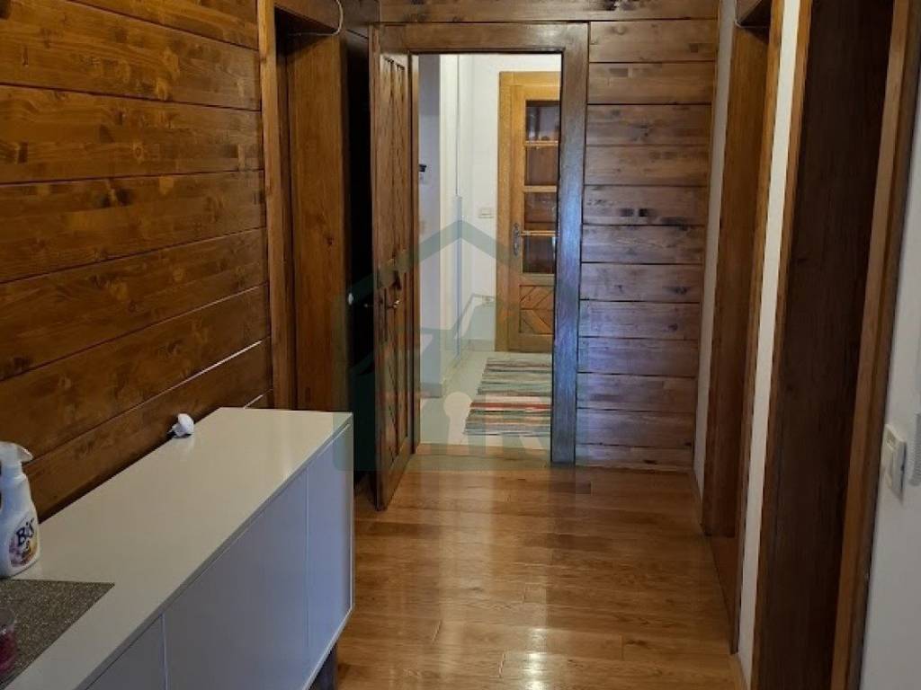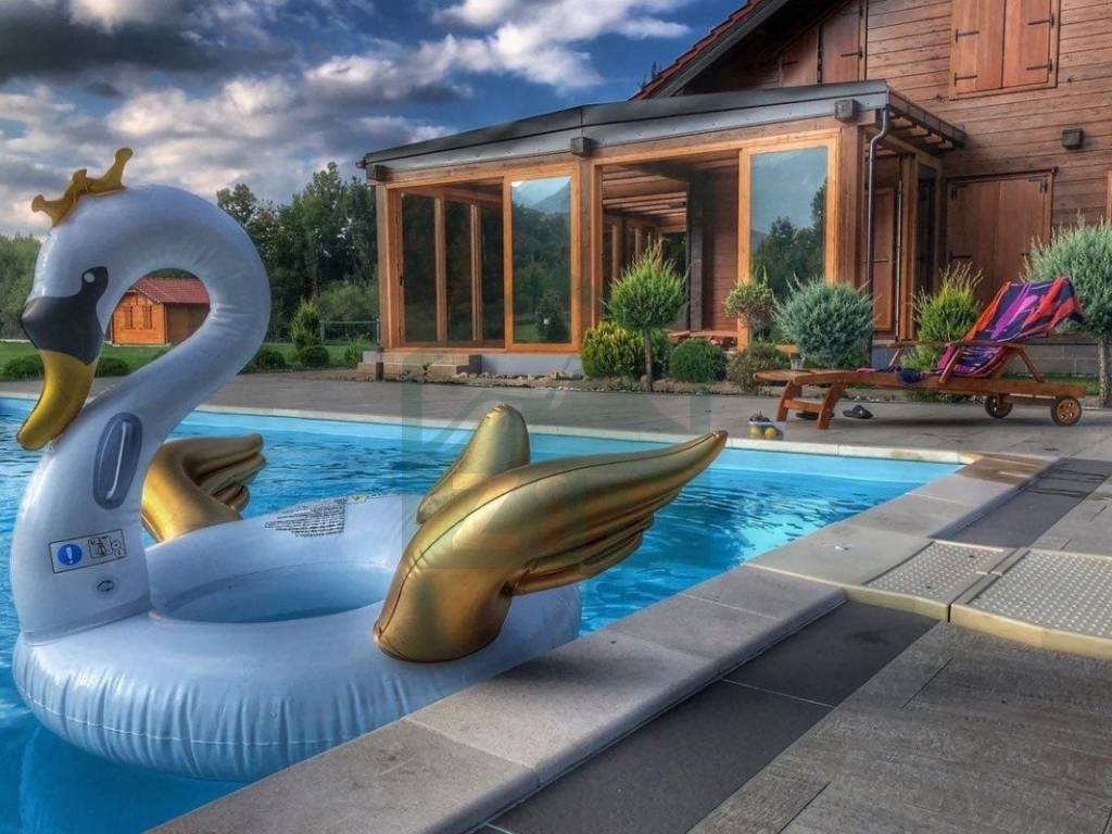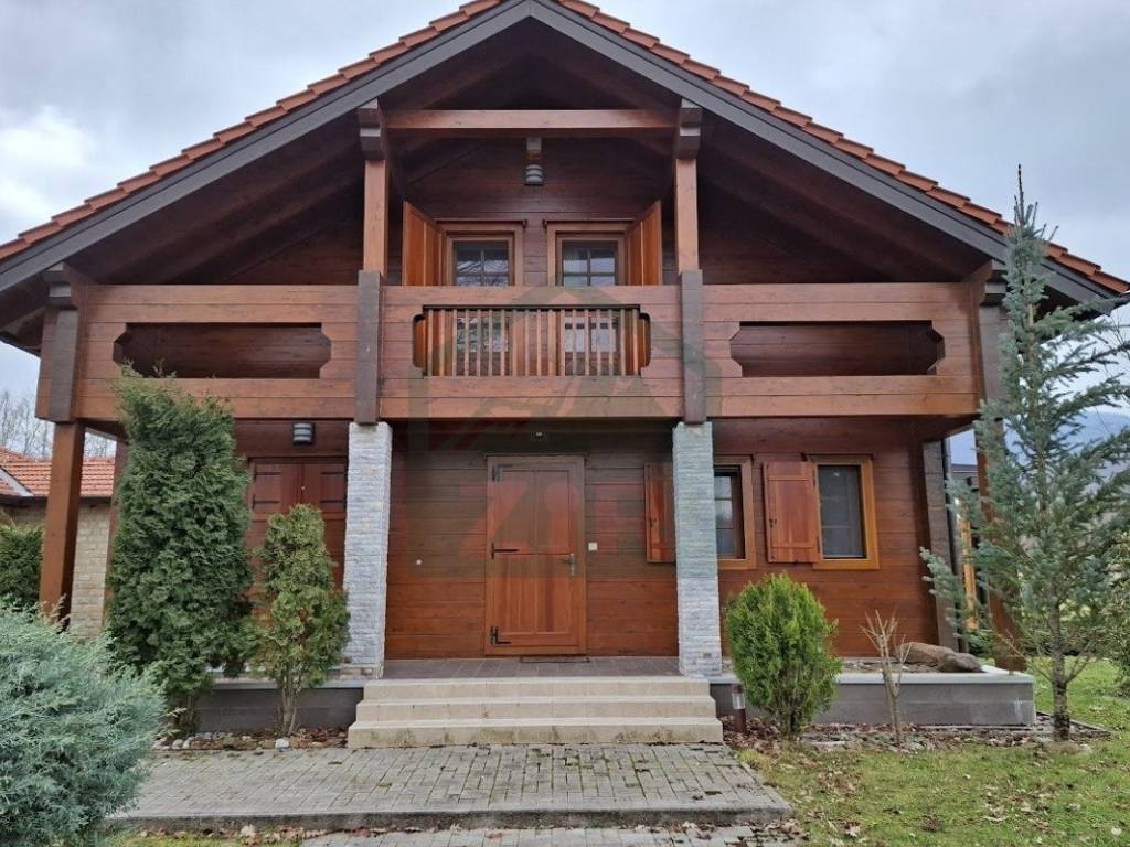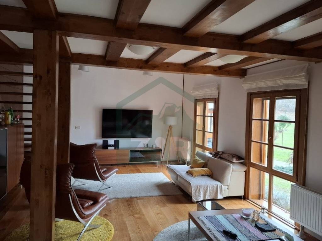 The main house, with a living area of 126 m and a gallery, blends warmth and elegance, designed for maximum comfort and functionality. It features an open-concept kitchen, dining, and living area, a pantry, entrance hall, hallway with two built-in wardrobes, bathroom, an additional WC, boiler room, and a pellet storage area with a capacity of around 4 tons. Stairs from the ground floor lead to a gallery with four rooms, a hallway, a built-in wardrobe, and a bathroom. Two of the rooms have access to a balcony. The interior features predominantly neutral tones enhanced by the warmth of rich wood. The flooring throughout the house is made of solid oak, known as "rustic flooring" (except in the pantry and bathrooms), and laminated beams are visible across the ceiling and partially on the interior walls. The house is fully and richly furnished with furniture and appliances.