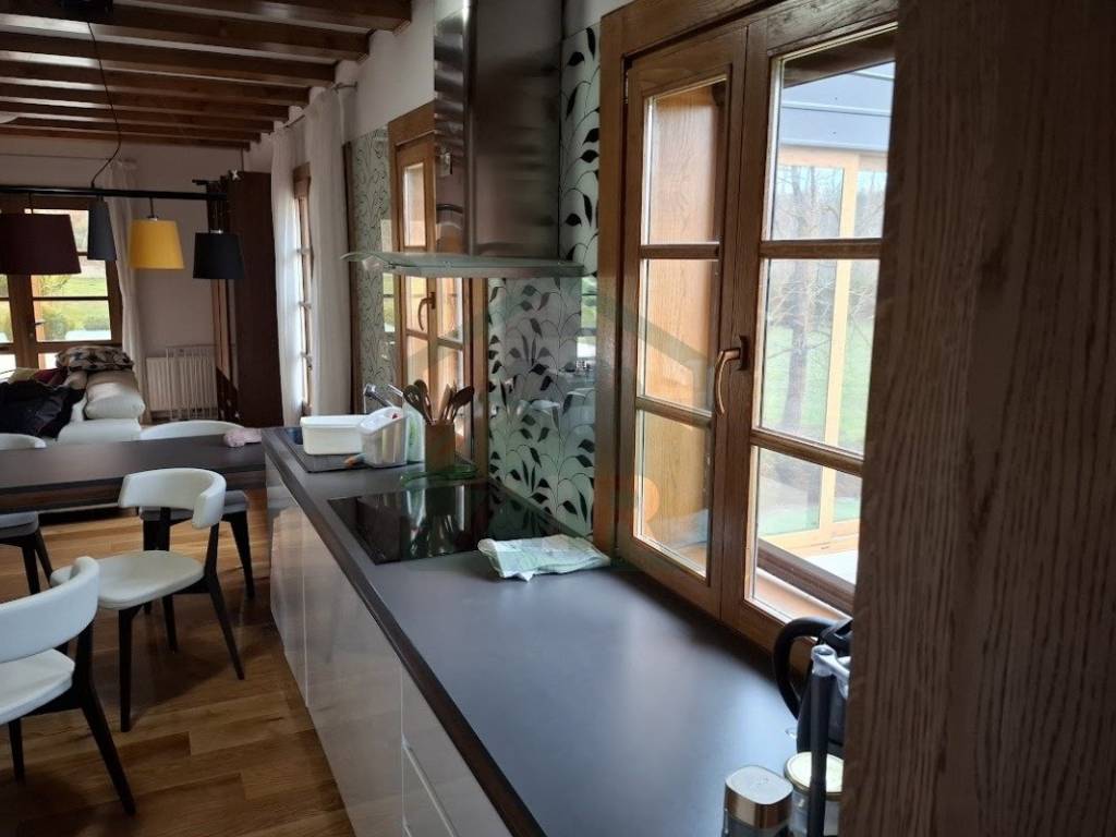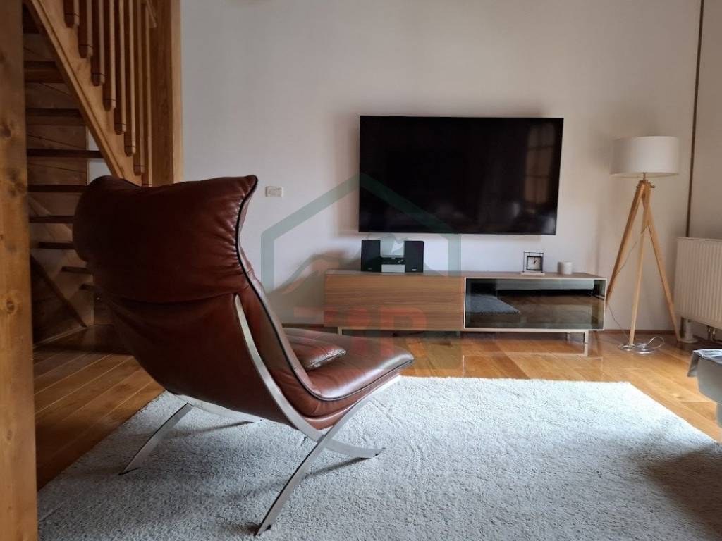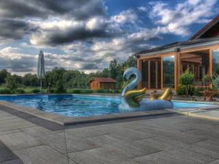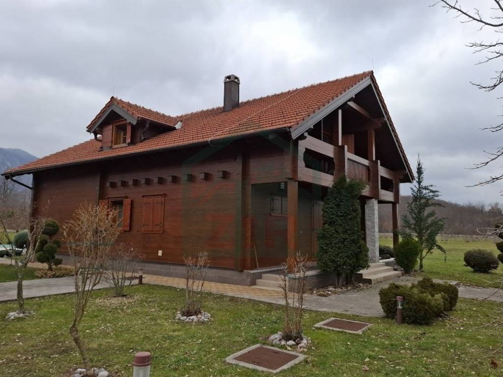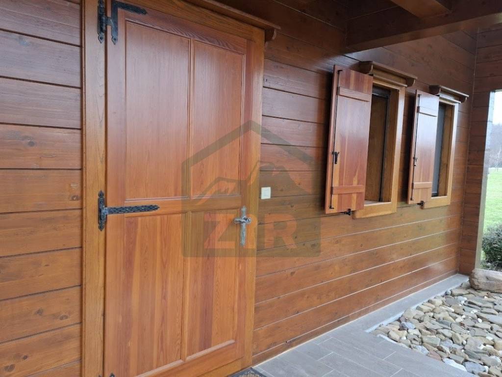 The main house, with a living area of 126 m and a gallery, blends warmth and elegance, designed for maximum comfort and functionality. It features an open-concept kitchen, dining, and living area, a pantry, entrance hall, hallway with two built-in wardrobes, bathroom, an additional WC, boiler room, and a pellet storage area with a capacity of around 4 tons. Stairs from the ground floor lead to a gallery with four rooms, a hallway, a built-in wardrobe, and a bathroom. Two of the rooms have access to a balcony. The interior features predominantly neutral tones enhanced by the warmth of rich wood. The flooring throughout the house is made of solid oak, known as "rustic flooring" (except in the pantry and bathrooms), and laminated beams are visible across the ceiling and partially on the interior walls. The house is fully and richly furnished with furniture and appliances.